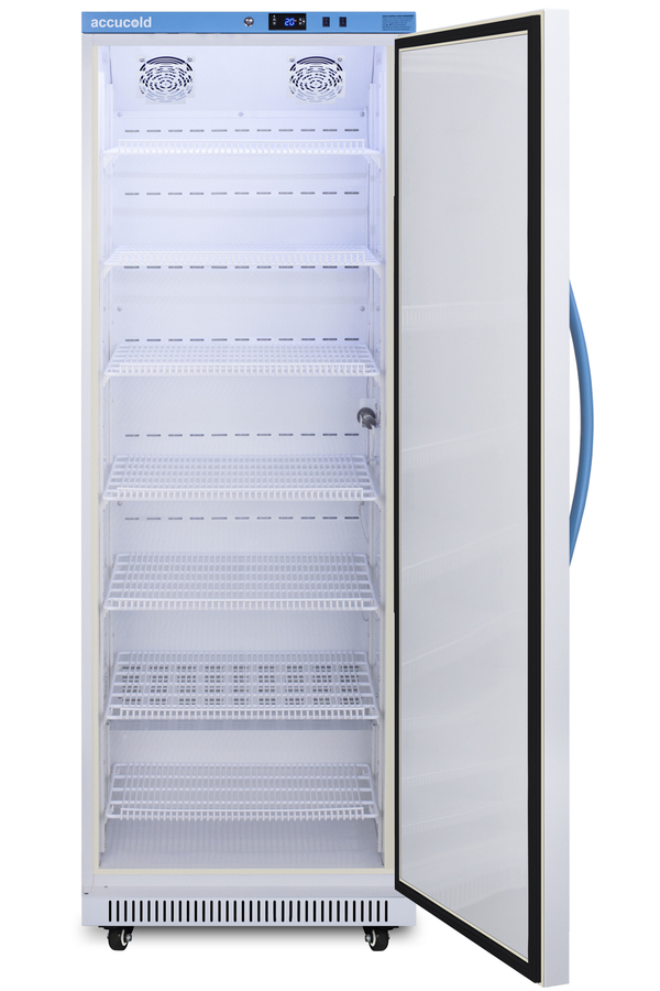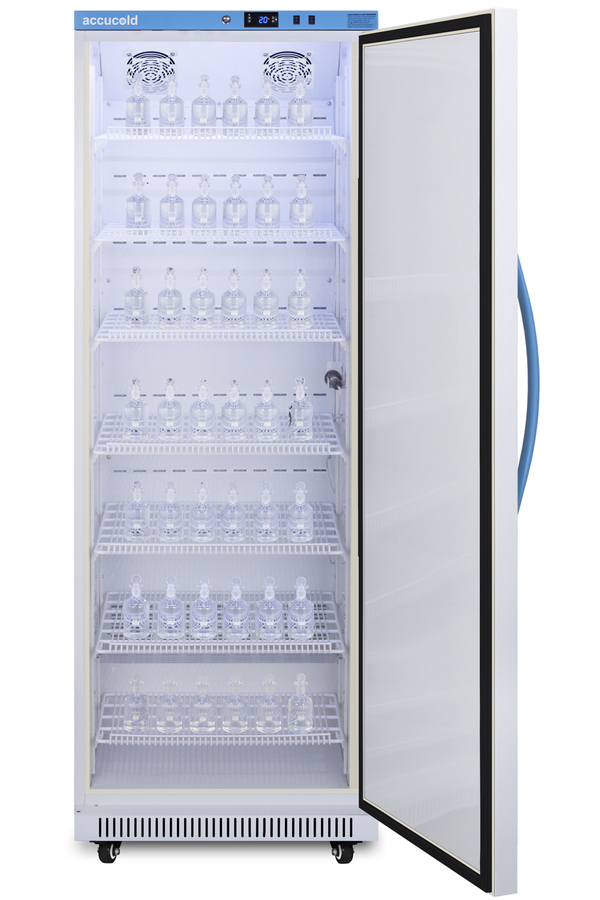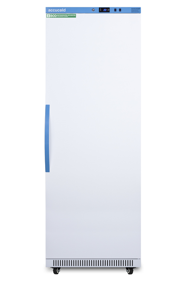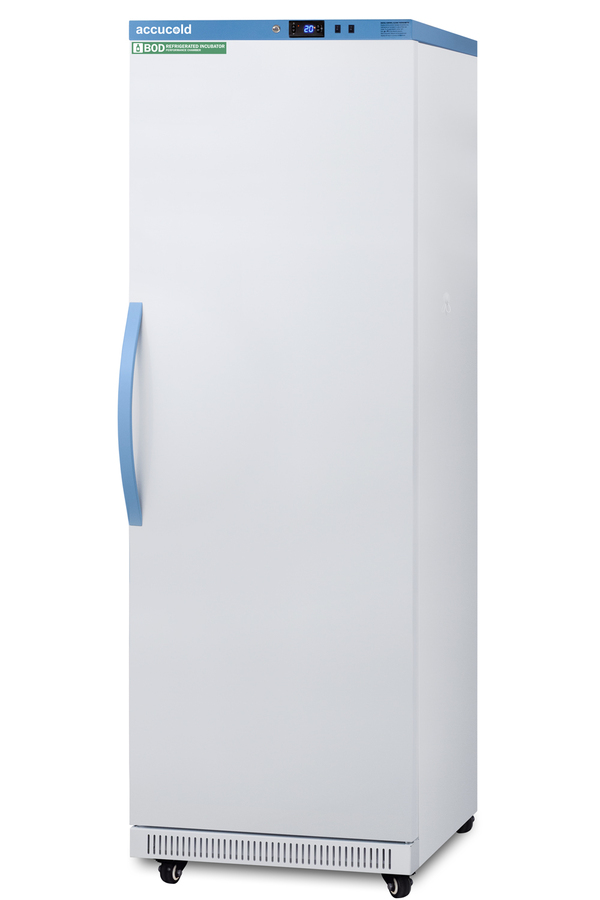 Accucold's Performance Series includes BOD refrigerated incubators designed to provide reliable cold storage in water treatment centers, environmental laboratories, and other research facilities. Model ABOD18 is an 18 cu.ft. refrigerated incubator. The adjustable control range allows you to manage the temperature between 4º and 60ºC (39.2 to 140ºF) and comes preset at 20ºC. The microprocessor temperature controller is externally located to minimize door openings, helping to protect stored contents from ambient temperature. The buffered temperature probe is encased in a glycol-filled bottle to better simulate temperature of the stored product, with an additional sensor that reads air temperature to ensure superior temperature control. The current and min/max temperature display is viewable in Celsius or Fahrenheit to the nearest tenth of a degree. The audible and visual temperature alarm sounds if the unit's interior goes out of range. Additional alarms include a power failure alert, door open alarm, and sensor failure alarm. This unit is equipped with remote alarm contacts in the rear and a 1/2" probe port on the right side to accept additional monitoring devices. It comes with a hospital grade cord with a green dot plug for added safety in high traffic laboratory and research areas. Inside, the ABOD18 utilizes adjustable cycle defrost operation to avoid temperature spikes. Optimized forced air cooling with one internal fan ensures excellent temperature stability and uniformity with rapid recovery after door openings. The adjustable plastic-coated wire shelves can be positioned at 1/2" increments to accommodate virtually any sized bottle. This unit includes LED internal lighting with an on/off rocker switch so you can ensure the interior contents are not unnecessarily exposed to light. The interior is constructed from white powder coated metal to ensure added durability and better temperature retention. This refrigerated incubator comes in a white cabinet finish with a blue accented control panel. The factory-installed antimicrobial handle is powder-coated with naturally occurring silver ions, which help to reduce the spread of germs, allowing for a safer, cleaner user experience. The user-reversible door ships with a right hand swing and self-closing function. This model includes a factory-installed lock and ships with two keys for staff use. Powerful magnetic gaskets ensure a positive seal. Designed with hydrocarbon refrigerant, the ABOD18 provides an energy efficient solution to water storage. Additional size are available, as well as upgrades including digital data loggers, keyless entry locks, and more. Browse the complete Accucold lineup at accucold.com.
