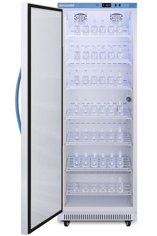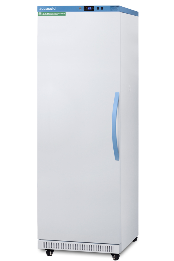 Accucold's Performance Series includes BOD refrigerated incubators designed to provide reliable cold storage in water treatment centers, environmental laboratories, and other research facilities. Model ABOD18LHD is an 18 cu.ft. refrigerated incubator. The adjustable control range allows you to manage the temperature between 4º and 60ºC (39.2 to 140ºF) and comes preset at 20ºC. The microprocessor temperature controller is externally located to minimize door openings, helping to protect stored contents from ambient temperature. The buffered temperature probe is encased in a glycol-filled bottle to better simulate temperature of the stored product, with an additional sensor that reads air temperature to ensure superior temperature control. The current and min/max temperature display is viewable in Celsius or Fahrenheit to the nearest tenth of a degree. The audible and visual temperature alarm sounds if the unit's interior goes out of range. Additional alarms include a power failure alert, door open alarm, and sensor failure alarm. This unit is equipped with remote alarm contacts in the rear and a 1/2" probe port on the right side to accept additional monitoring devices. It comes with a hospital grade cord with a green dot plug for added safety in high traffic laboratory and research areas. Inside, the ABOD18LHD utilizes adjustable cycle defrost operation to avoid temperature spikes. Optimized forced air cooling with one internal fan ensures excellent temperature stability and uniformity with rapid recovery after door openings. The adjustable plastic-coated wire shelves can be positioned at 1/2" increments to accommodate virtually any sized bottle. This unit includes LED internal lighting with an on/off rocker switch so you can ensure the interior contents are not unnecessarily exposed to light. The interior is constructed from white powder coated metal to ensure added durability and better temperature retention. This refrigerated incubator comes in a white cabinet finish with a blue accented control panel. The factory-installed antimicrobial handle is powder-coated with naturally occurring silver ions, which help to reduce the spread of germs, allowing for a safer, cleaner user experience. The door ships with a left hand swing and self-closing function. This model includes a factory-installed lock and ships with two keys for staff use. Powerful magnetic gaskets ensure a positive seal. Designed with hydrocarbon refrigerant, the ABOD18LHD provides an energy efficient solution to water storage. Additional size are available, as well as upgrades including digital data loggers, keyless entry locks, and more. Browse the complete Accucold lineup at accucold.com.