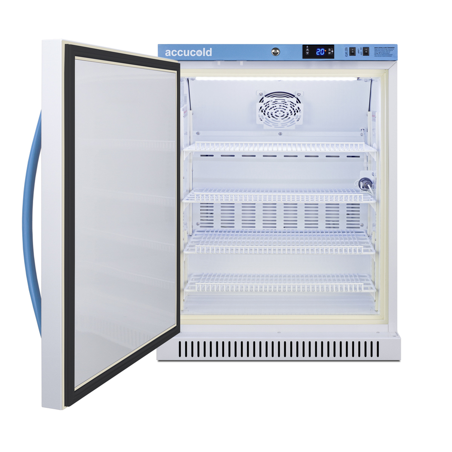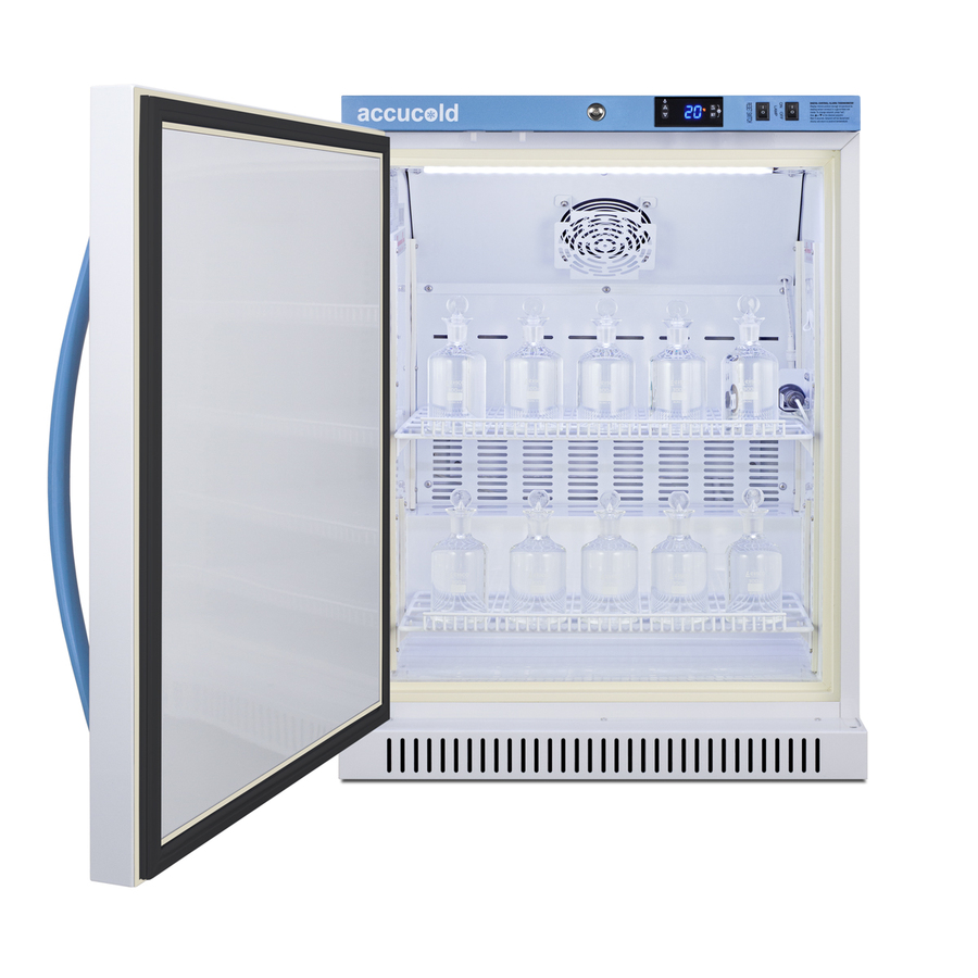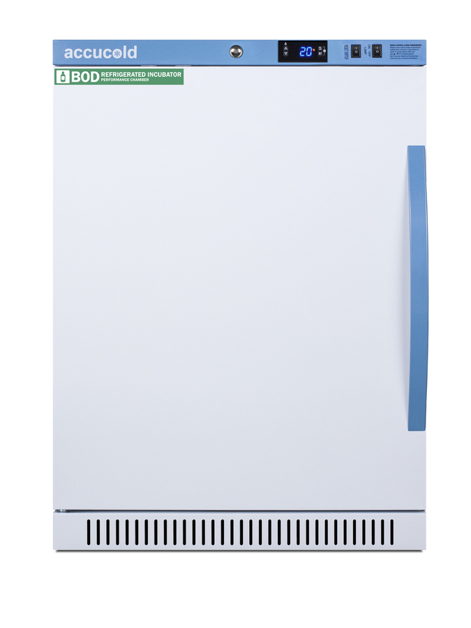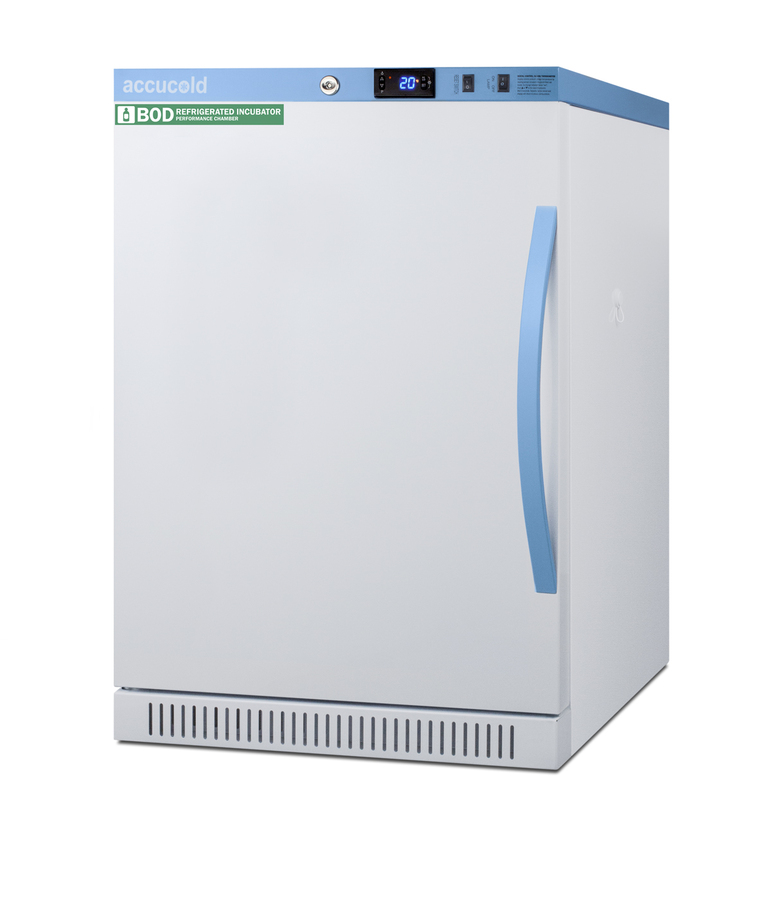 Accucold's Performance Series includes BOD refrigerated incubators designed to provide reliable cold storage in water treatment centers, environmental laboratories, and other research facilities. Model ABOD6LHD is a 6 cu.ft. refrigerated incubator. The adjustable control range allows you to manage the temperature between 4º and 60ºC (39.2 to 140ºF) and comes preset at 20ºC. The microprocessor temperature controller is externally located to minimize door openings, helping to protect stored contents from ambient temperature. The buffered temperature probe is encased in a glycol-filled bottle to better simulate temperature of the stored product, with an additional sensor that reads air temperature to ensure superior temperature control. The current and min/max temperature display is viewable in Celsius or Fahrenheit to the nearest tenth of a degree. The audible and visual temperature alarm sounds if the unit's interior goes out of range. Additional alarms include a power failure alert, door open alarm, and sensor failure alarm. This unit is equipped with remote alarm contacts in the rear and a 1/2" probe port on the right side to accept additional monitoring devices. It comes with a hospital grade cord with a green dot plug for added safety in high traffic laboratory and research areas. Inside, the ABOD6LHD utilizes adjustable cycle defrost operation to avoid temperature spikes. Optimized forced air cooling with one internal fan ensures excellent temperature stability and uniformity with rapid recovery after door openings. The adjustable plastic-coated wire shelves can be positioned at 1/2" increments to accommodate virtually any sized bottle. This unit includes LED internal lighting with an on/off rocker switch so you can ensure the interior contents are not unnecessarily exposed to light. The interior is constructed from white powder coated metal to ensure added durability and better temperature retention. This refrigerated incubator comes in a white cabinet finish with a blue accented control panel. The factory-installed antimicrobial handle is powder-coated with naturally occurring silver ions, which help to reduce the spread of germs, allowing for a safer, cleaner user experience. The door ships with a left hand swing and self-closing function. This model includes a factory-installed lock and ships with two keys for staff use. Powerful magnetic gaskets ensure a positive seal. Designed with hydrocarbon refrigerant, the ABOD6LHD provides an energy efficient solution to water storage. Additional size are available, as well as upgrades including digital data loggers, keyless entry locks, and more. Browse the complete Accucold lineup at accucold.com.