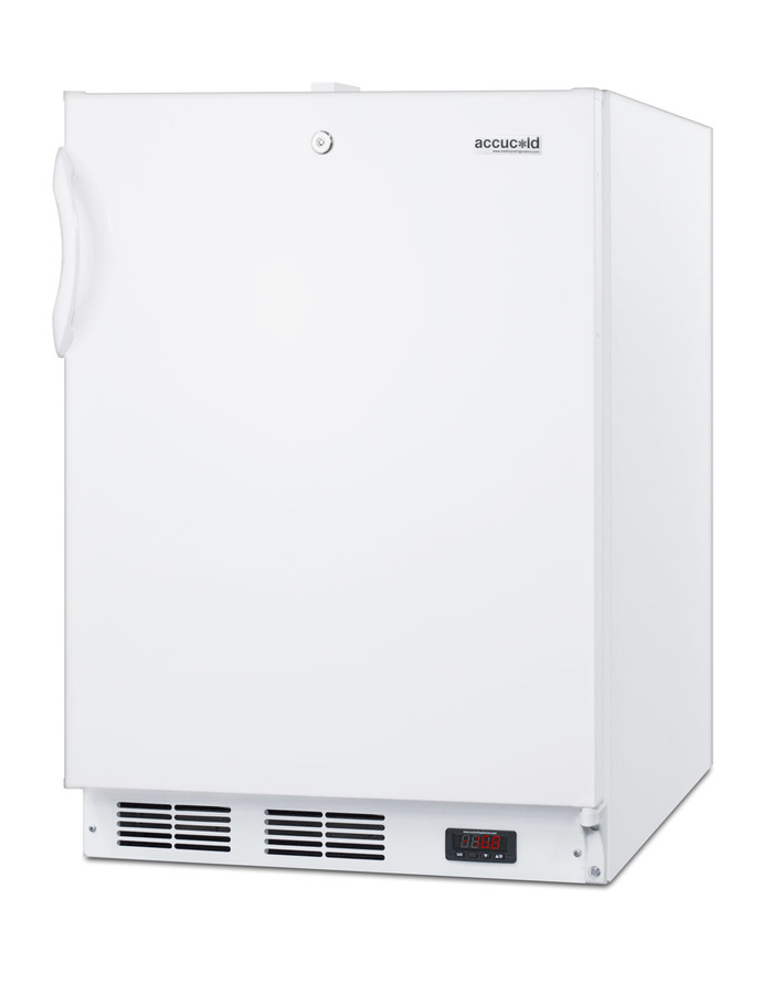 Accucold by Summit Appliance carries a range of general purpose and medical all-freezers designed for reliable, frost-free storage under the counter. At 24" wide, the ACF48W is ideally sized for various institutional or laboratory settings. The front-breathing design allows built-in installation, while the fully finished cabinet also allows freestanding use. The user-reversible door includes a factory installed keyed lock for added security. This model comes in a white finish and includes a hospital grade cord with a 'green dot' plug for added security in high traffic areas. Full frost-free operation ensures low maintenance operation, with an internal fan to keep the interior evenly cooled from top to bottom. A digital thermostat is located in the front kickplate, letting users manage the temperature without having to open the door. The interior includes two removable steel shelves. Made in the USA, the ACF48W offers quality freezer storage in a conveniently sized and featured unit. It is ETL-S listed to NSF-7 commercial standards and meets UL-471. For this unit sized for use under ADA compliant counters, see the ACF48WADA. Additional door finishes are available. This model can also be paired with the matching FF7LWBI all-refrigerator. Note: This product is intended for a wide variety of basic storage applications. Storage of high-value vaccines, life science materials, and medical/clinical biologicals require a product offering tighter temperature control and/or alarms, monitoring, and backup. For more information, browse Accucold's purpose-built line or contact our product specialists at 1-888-4-MED-LAB.