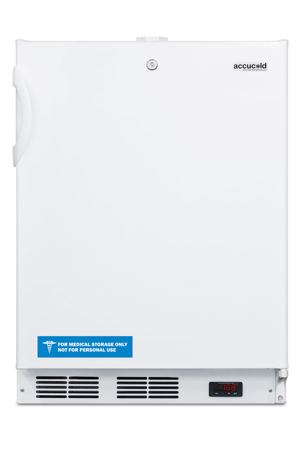 Accucold by Summit Appliance carries a range of general purpose and medical all-freezers designed for reliable, frost-free storage under the counter. At 24" wide and 32" high, the ACF48WADA is ideally sized for various institutional settings following ADA guidelines for lower counter height. The front-breathing design allows built-in installation, while the fully finished cabinet also allows freestanding use. The user-reversible door includes a factory installed keyed lock for added security. This model comes in a white finish and includes a hospital grade cord with a 'green dot' plug for added security in high traffic areas. Full frost-free operation eliminates the need to defrost the interior, with an internal fan to keep the interior evenly cooled from top to bottom. A digital thermostat is located in the front kickplate, letting users manage the temperature without having to open the door. The interior includes two removable steel shelves. Made in the USA, the ACF48WADA offers quality freezer storage in a conveniently sized and featured unit. It is ETL-S listed to NSF-7 commercial standards and meets UL-471. Additional door finishes are available. This model can also be paired with the matching FF7LWBIADA all-refrigerator. Note: This product is intended for a wide variety of basic storage applications. Storage of high-value vaccines, life science materials, and medical/clinical biologicals require a product offering tighter temperature control and/or alarms, monitoring, and backup. For more information, browse Accucold's purpose-built line or contact our product specialists at 1-888-4-MED-LAB.