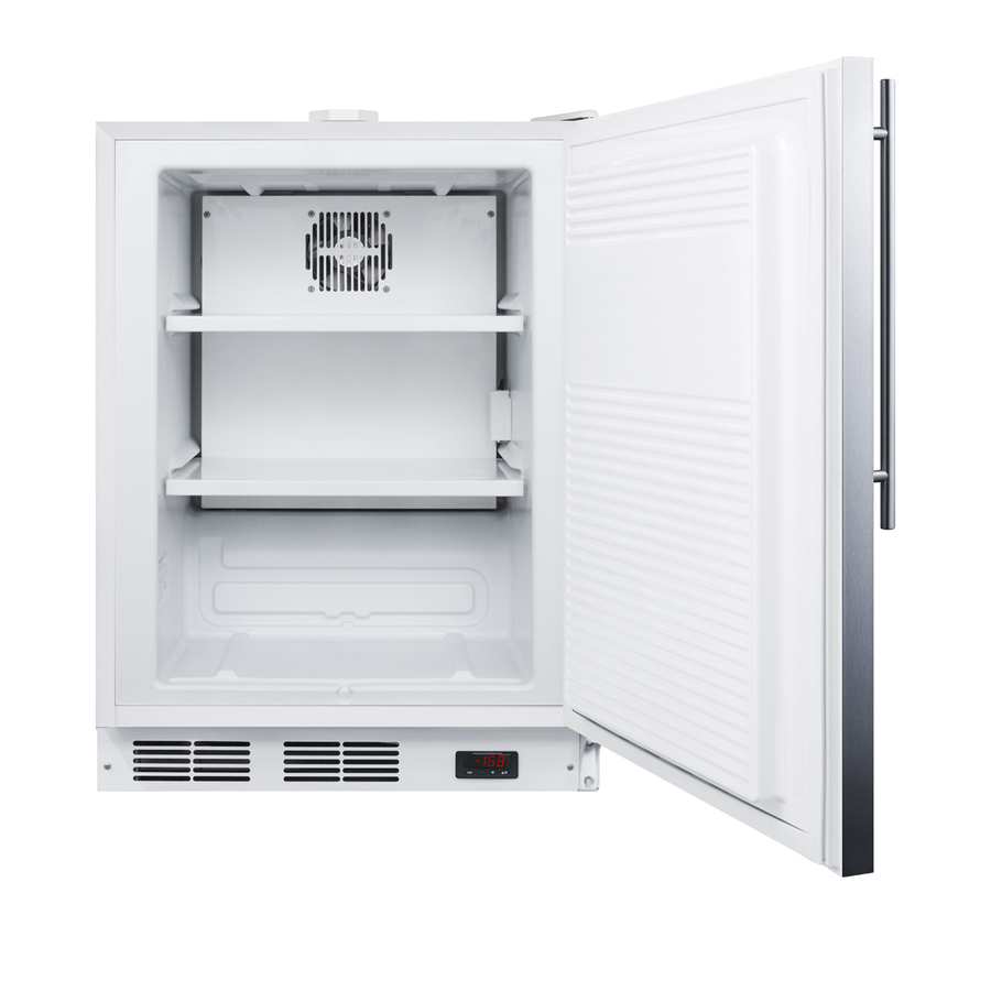 Accucold by Summit Appliance carries a range of general purpose and medical all-freezers designed for reliable, frost-free storage under the counter. At 24" wide and 32" high, the ACF48WSSHVADA is ideally sized for various institutional settings with ADA compliant counters. The front-breathing design allows built-in installation, while the fully finished cabinet also allows freestanding use. The user-reversible door includes a factory installed keyed lock for added security. This model comes with a white cabinet and stainless steel wrapped door with a thin pro style handle. It includes a hospital grade cord with a 'green dot' plug for added security in high traffic areas. Full frost-free operation ensures low maintenance operation, with an internal fan to keep the interior evenly cooled from top to bottom. A digital thermostat is located in the front kickplate, letting users manage the temperature without having to open the door. The interior includes two removable steel shelves. Made in the USA, the ACF48WSSHVADA offers quality freezer storage in a conveniently sized and featured unit. It is ETL-S listed to NSF-7 commercial standards and meets UL-471. Note: This product is intended for a wide variety of basic storage applications. Storage of high-value vaccines, life science materials, and medical/clinical biologicals require a product offering tighter temperature control and/or alarms, monitoring, and backup. For more information, browse Accucold's purpose-built line or contact our product specialists at 1-888-4-MED-LAB.