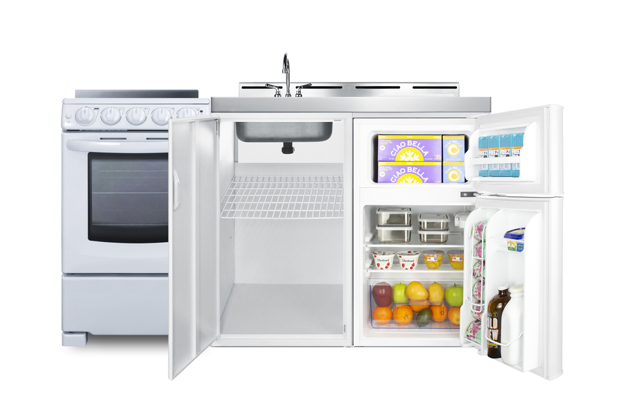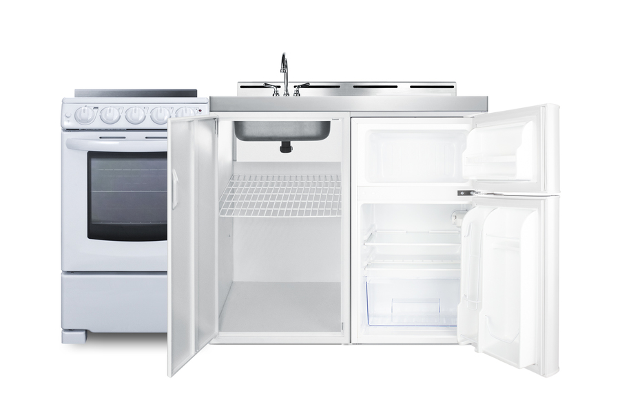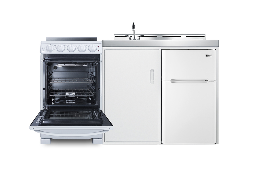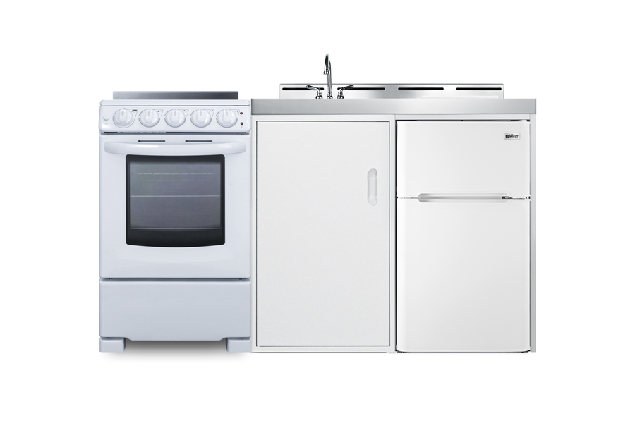 Summit's line of all-in-one combination kitchenettes brings complete kitchen convenience in a slim-fitting design. These units come fully featured with everything you need for the home foodservice experience, including a refrigerator with a freezer compartment, 4-burner smooth top range with oven, sink with faucet, cutlery bin with a removable cutting board cover, and storage cabinet for dry goods. The ACK60ELSTW is a 60" wide kitchenette with an easy-fitting 24" depth. This unit comes with a stainless steel countertop offering durability in a professional look. The surface includes a small cutlery bin, with a removable cutting board cover to ensure easy food prep. The compact sink features a ready-to-use faucet. Underneath the sink is a large cabinet with a removable shelf for added storage convenience. Unlike many other brands' kitchenettes, all Summit units include a refrigerator with a freezer compartment to cover all of your cold storage needs. The ACK60ELSTW includes the two-door, ENERGY STAR certified CP34W, with 3.2 cu.ft. of storage space. A dual evaporator system separately cools the auto defrost refrigerator section and manual defrost freezer compartment for improved overall performance. This model also includes an adjustable glass shelf, door storage, and a crisper. The ACK60ELSTW also ships with Summit REX2051WRT, a 20" wide 220V electric range complete with a smooth-top 4-element cooking surface and a full oven compartment with a bake and broil function. This range includes a large window with interior oven light, adjustable slide-out oven racks, hot surface indicator lights for added safety. The range can be installed on the left or right side of the kitchenette. The ACK60ELSTW is shipped on one pallet, with the kitchenette and refrigerator fully assembled and the range packaged separately. Perfect for studio apartments, hotel rooms, dormitories, assisted living facilities, temporary kitchen facilities, and any other location in need of a low maintenance, fully-featured compact kitchenette.