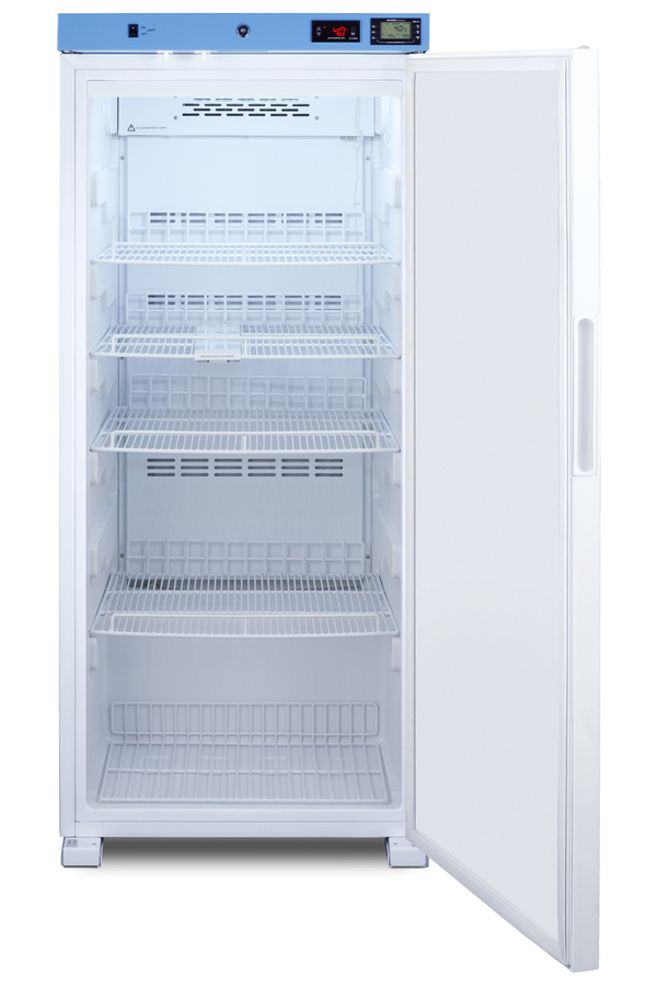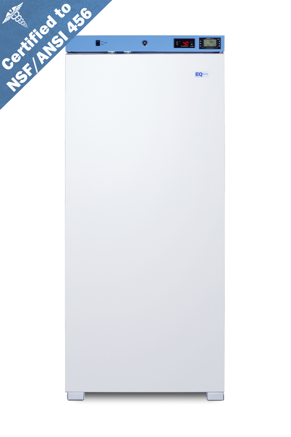 EQTemp introduces a new series of affordable, specialty refrigeration solutions for healthcare facilities seeking specialized cold storage. Model ACR1011WNSF456 is an upright 12.71 cu.ft. all-refrigerator. It features a clean white exterior and a blue-accented control panel. The solid door is equipped with a self-closing mechanism to help protect stored items from being overexposed to room temperature. A factory-installed lock offers added security, and the hospital-grade cord with a 'green dot' plug ensures a secure connection for high-traffic areas. The ACR1011WNSF456 includes an external readout of the interior temperature, as well as the high/low temperature as required for data records. The buffered temperature probe is encased in a bottle filled with glass beads for improved accuracy and calibrated to NIST standards in our in-house ISO/IEC 17025:2017 certified laboratory. The digital temperature controls allow you to set the interior between 2 and 8ºC. An audible alarm sounds if the temperature goes out of range. We also include a pre-installed 3/8" access port for users to add their own monitoring equipment if preferred. The interior includes one wire shelf in the center to hold the temperature probe and additional adjustable shelves to accommodate different sizes. Internal LED lighting provides an efficient and convenient view. Automatic defrost reduces user maintenance and an internal fan ensures powerful temperature recovery after door openings. EQTemp's series of ACR refrigeration is certified to the NSF/ANSI 456 Vaccine Storage Standard. All models feature hydrocarbon refrigerant for a greener footprint. Additional sizes are available, as well as more advanced cold storage equipment purpose-built for laboratory and life science storage. Browse the full product line to explore our extensive selection. Note: EQTemp's ACR Series refrigerators are intended for a wide variety of healthcare storage applications. Storage of high-value vaccines, life science materials, and medical/clinical biologicals require a product offering tighter temperature control and/or alarms, monitoring, and backup. For these applications, browse Accucold's purpose-built PHARMA-VAC line or contact our product specialists at 1-888-4-MED-LAB.