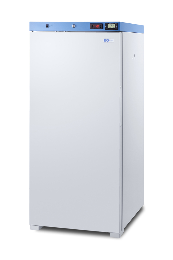 EQTemp introduces a new series of affordable, specialty refrigeration solutions for healthcare facilities seeking specialized cold storage. Model ACR1011W is an upright 9.88 cu.ft. all-refrigerator. It features a clean white exterior and a blue-accented control panel. The solid door is equipped with a self-closing mechanism to help protect stored items from being overexposed to room temperature. A factory-installed lock offers added security, and the hospital-grade cord with a 'green dot' plug ensures a secure connection for high-traffic areas. The ACR1011W includes an external readout of the interior temperature and the high/low temperature. The buffered temperature probe is encased in a bottle filled with glass beads for improved accuracy. The digital temperature controls allow you to set the interior between 2 and 8ºC. An audible alarm sounds if the temperature goes out of range. We also include a pre-installed 3/8" access port for users to add their own monitoring equipment if preferred. The interior includes one wire shelf in the center to hold the temperature probe, as well as three additional adjustable shelves to accommodate different sizes. Internal LED lighting provides an efficient and convenient view. Automatic defrost reduces user maintenance, and an internal fan ensures robust temperature recovery after door openings. This unit is also available certified to the NSF/ANSI 456 Vaccine Storage Standard with the upgrade of a NIST calibrated temperature readout (see model ACR1011WNSF456). Additional sizes are available, as well as more advanced cold storage equipment purpose-built for laboratory and life science storage. Browse the complete product line to explore our extensive selection. Note: EQTemp's ACR Series refrigerators are intended for various healthcare storage applications. Storage of high-value vaccines, life science materials, and medical/clinical biologicals requires a product offering tighter temperature control and/or alarms, monitoring, and backup. For these applications, browse Accucold's purpose-built PHARMA-VAC line or contact our product specialists at 1-888-4-MED-LAB.