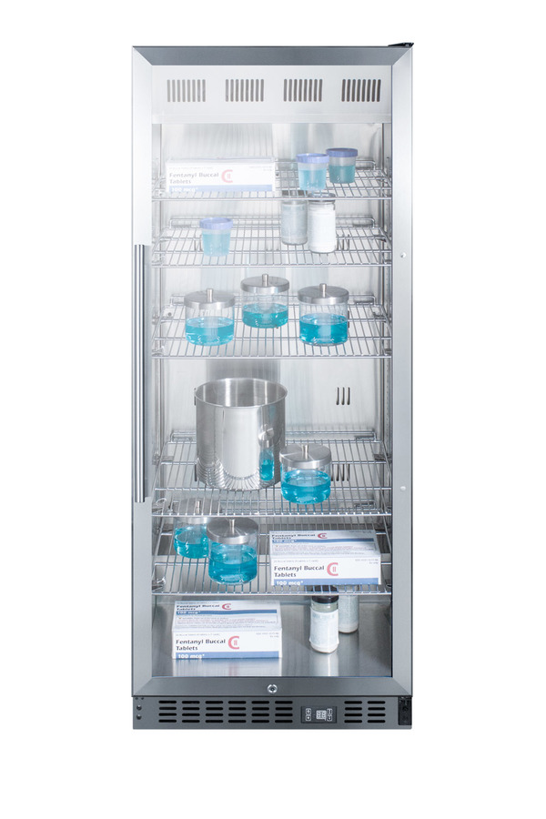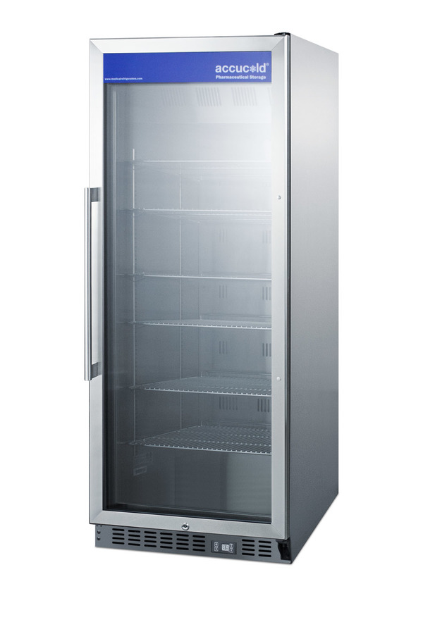 Accucold by Summit Appliance carries a quality line of pharmaceutical refrigeration for temperature-safe storage of sensitive material. The ACR1151 is conveniently sized with a 24" footprint for space-challenged facilities, with a front-breathing system that allows built-in or freestanding use. The exterior and interior are constructed from stainless steel for easier cleaning and improved sanitation. The glass door provides a full view of the 11 cu.ft. interior while adding protection with the self-closing design. A factory installed lock offers added security. A hospital grade cord with a 'green dot' plug offers added safety in high traffic facilities. Inside, the ACR1151 includes six cantilevered chrome shelves that can easily be rearranged to accommodate a variety of sizes. Fan-forced cooling ensures cold air is evenly distributed throughout the interior. This model uses frost-free operation for easy user maintenance, with an audible open door alarm that will sound if the door is ajar for over 60 seconds. A digital thermostat offers intuitive temperature control that can be viewable in Celsius or Fahrenheit. Designed for optimum pharmaceutical storage, the temperature range is 2ºC to 8ºC. NOTE: Due to the self-closing design of the door, this unit is currently only available with a right hand door swing. NOTE: Accucold refrigerators are purpose-built to the support meeting the current CDC (Centers for Disease Control) guidelines for the storage of vaccines. At this time, Accucold refrigerators have not been evaluated to the new NSF 456 standard. As referenced in the current Vaccine Storage and Handling Toolkit, these units incorporate microprocessor controls and forced air circulation for stable operation between 2 and 8ºC. For additional temperature assurance, the CDC recommends a calibrated digital data logger (DDL), which can be added with the factory-installed option DL2B or addition of the DL2BKit accessory.