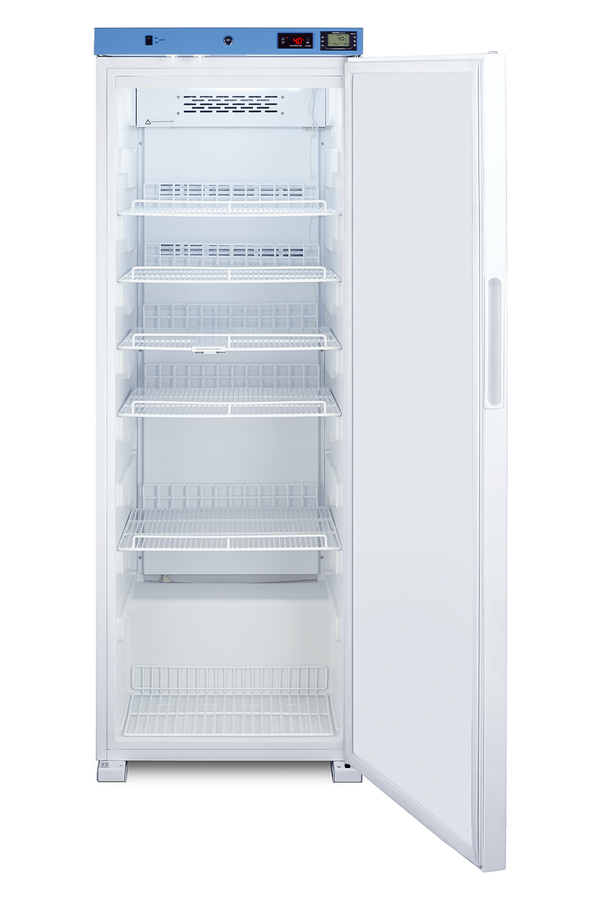 EQTemp introduces a new series of affordable, specialty refrigeration solutions for healthcare facilities seeking specialized cold storage. Model ACR1321W is an upright 12.71 cu.ft. all-refrigerator. It features a clean white exterior and a blue-accented control panel. The solid door is equipped with a self-closing mechanism to help protect stored items from being overexposed to room temperature. A factory-installed lock offers added security, and the hospital-grade cord with a 'green dot' plug ensures a secure connection for high-traffic areas. The ACR1321W includes an external readout of the interior temperature and the high/low temperature. The buffered temperature probe is encased in a bottle filled with glass beads for improved accuracy. The digital temperature controls allow you to set the interior between 2 and 8ºC. An audible alarm sounds if the temperature goes out of range. We also include a pre-installed 3/8" access port for users to add their own monitoring equipment if preferred. The interior includes one wire shelf in the center to hold the temperature probe, as well as four additional adjustable shelves to accommodate different sizes. Internal LED lighting provides an efficient and convenient view. Automatic defrost reduces user maintenance, and an internal fan ensures robust temperature recovery after door openings. This unit is also available certified to the NSF/ANSI 456 Vaccine Storage Standard with the upgrade of a NIST calibrated temperature readout (see model ACR1321WNSF456). Additional sizes are available, as well as more advanced cold storage equipment purpose-built for laboratory and life science storage. Browse the complete product line to explore our extensive selection. Note: EQTemp's ACR Series refrigerators are intended for various healthcare storage applications. Storage of high-value vaccines, life science materials, and medical/clinical biologicals requires a product offering tighter temperature control and/or alarms, monitoring, and backup. For these applications, browse Accucold's purpose-built PHARMA-VAC line or contact our product specialists at 1-888-4-MED-LAB.