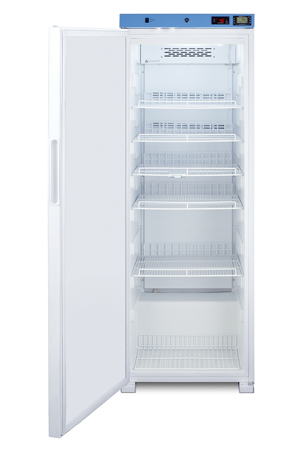 EQTemp introduces a new series of affordable, specialty refrigeration solutions for healthcare facilities seeking specialized cold storage. Model ACR1321WLHD is an upright 12.71 cu.ft. all-refrigerator. It features a clean white exterior and a blue-accented control panel. The solid door is equipped with a self-closing mechanism to help protect stored items from being overexposed to room temperature. A factory-installed lock offers added security, and the hospital-grade cord with a 'green dot' plug ensures a secure connection for high-traffic areas. The ACR1321WLHD includes an external readout of the interior temperature and the high/low temperature. The buffered temperature probe is encased in a bottle filled with glass beads for improved accuracy. The digital temperature controls allow you to set the interior between 2 and 8ºC. An audible alarm sounds if the temperature goes out of range. We also include a pre-installed 3/8" access port for users to add their own monitoring equipment if preferred. The interior includes one wire shelf in the center to hold the temperature probe, as well as four additional adjustable shelves to accommodate different sizes. Internal LED lighting provides an efficient and convenient view. Automatic defrost reduces user maintenance, and an internal fan ensures robust temperature recovery after door openings. This unit ships with a left-hand door swing (for a right-hand version, see model ACR1321W). This unit is also available certified to the NSF/ANSI 456 Vaccine Storage Standard with the upgrade of a NIST calibrated temperature readout (see model ACR1321WNSF456). Additional sizes are available, as well as more advanced cold storage equipment purpose-built for laboratory and life science storage. Browse the complete product line to explore our extensive selection. Note: EQTemp's ACR Series refrigerators are intended for various healthcare storage applications. Storage of high-value vaccines, life science materials, and medical/clinical biologicals requires a product offering tighter temperature control and/or alarms, monitoring, and backup. For these applications, browse Accucold's purpose-built PHARMA-VAC line or contact our product specialists at 1-888-4-MED-LAB.
