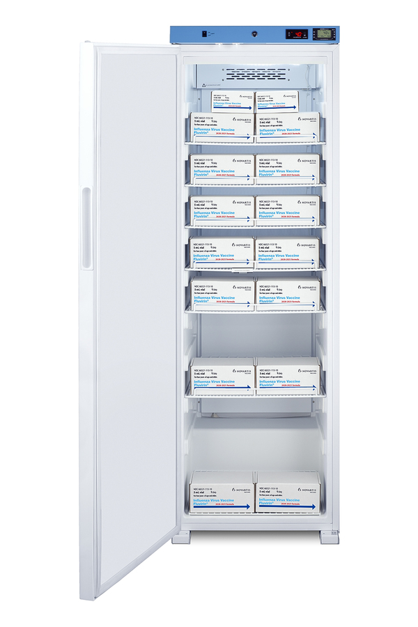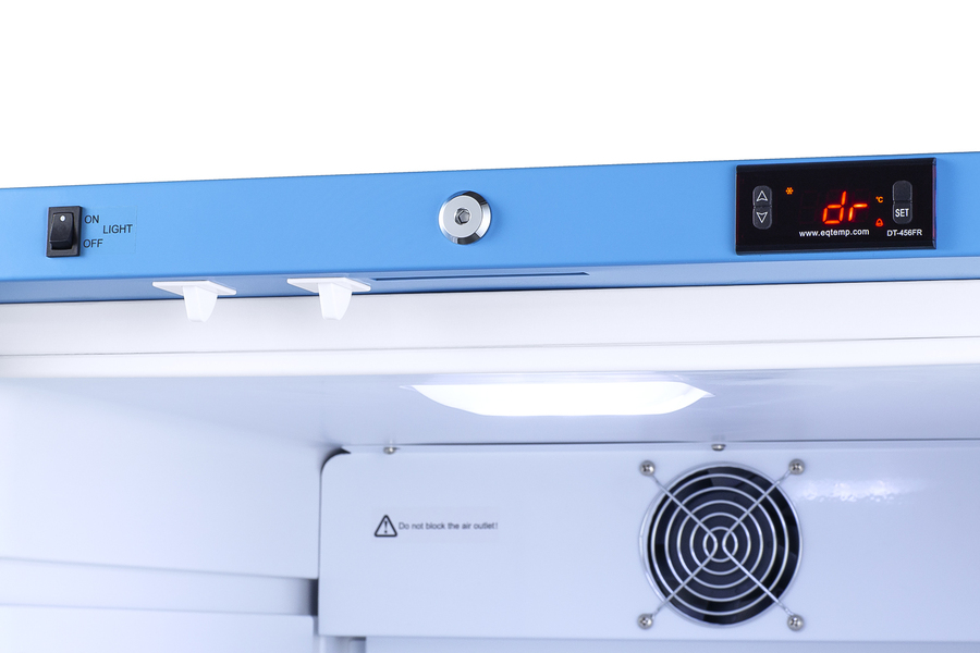EQTemp introduces a new series of affordable, specialty refrigeration solutions for healthcare facilities seeking specialized cold storage. Model ACR1601W is an upright 15.53 cu.ft. all-refrigerator. It features a clean white exterior and a blue-accented control panel. The solid door is equipped with a self-closing mechanism to help protect stored items from being overexposed to room temperature. A factory-installed lock offers added security, and the hospital-grade cord with a 'green dot' plug ensures a secure connection for high-traffic areas. The ACR1601W includes an external readout of the interior temperature and the high/low temperature. The buffered temperature probe is encased in a bottle filled with glass beads for improved accuracy. The digital temperature controls allow you to set the interior between 2 and 8ºC. An audible alarm sounds if the temperature goes out of range. We also include a pre-installed 3/8" access port for users to add their own monitoring equipment if preferred. The interior includes one wire shelf in the center to hold the temperature probe, as well as four additional adjustable shelves to accommodate different sizes. Internal LED lighting provides an efficient and convenient view. Automatic defrost reduces user maintenance, and an internal fan ensures robust temperature recovery after door openings. This unit is also available certified to the NSF/ANSI 456 Vaccine Storage Standard with the upgrade of a NIST calibrated temperature readout (see model ACR1601WNSF456). Additional sizes are available, as well as more advanced cold storage equipment purpose-built for laboratory and life science storage. Browse the complete product line to explore our extensive selection. Note: EQTemp's ACR Series refrigerators are intended for various healthcare storage applications. Storage of high-value vaccines, life science materials, and medical/clinical biologicals requires a product offering tighter temperature control and/or alarms, monitoring, and backup. For these applications, browse Accucold's purpose-built PHARMA-VAC line or contact our product specialists at 1-888-4-MED-LAB.