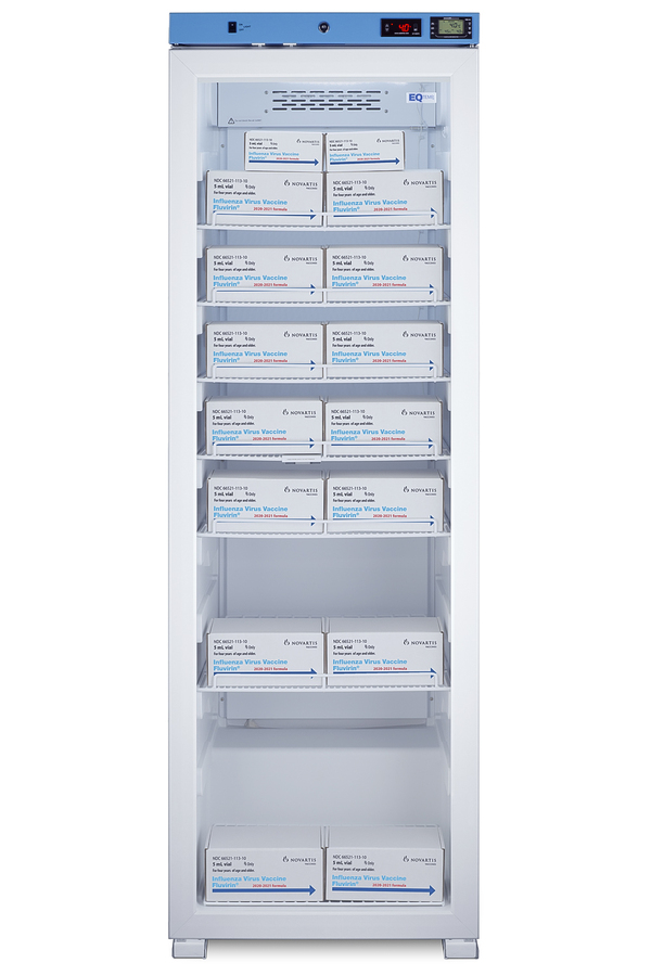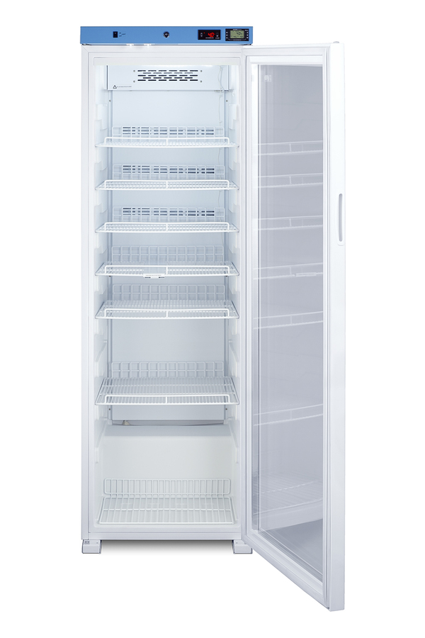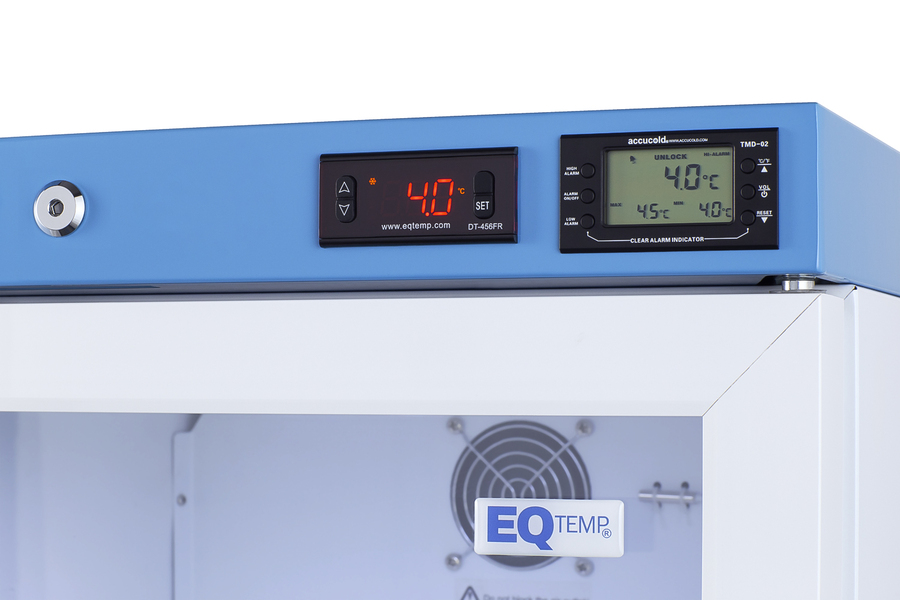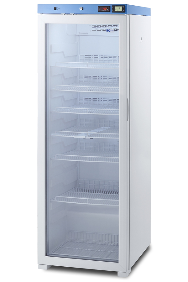 EQTemp introduces a new series of affordable, specialty refrigeration solutions for healthcare facilities seeking specialized cold storage. Model ACR1602G is an upright 15.53 cu.ft. all-refrigerator. It features a clean white exterior and a blue-accented control panel. The glass door is equipped with a self-closing mechanism to help protect stored items from being overexposed to room temperature. A factory-installed lock offers added security, and the hospital-grade cord with a 'green dot' plug ensures a secure connection for high-traffic areas. The ACR1602G includes an external readout of the interior temperature and the high/low temperature. The buffered temperature probe is encased in a bottle filled with glass beads for improved accuracy. The digital temperature controls allow you to set the interior between 2 and 8ºC. An audible alarm sounds if the temperature goes out of range. We also include a pre-installed 3/8" access port for users to add their own monitoring equipment if preferred. The interior includes one wire shelf in the center to hold the temperature probe, as well as four additional adjustable shelves to accommodate different sizes. Internal LED lighting provides an efficient and convenient view. Automatic defrost reduces user maintenance, and an internal fan ensures robust temperature recovery after door openings. This unit is also available certified to the NSF/ANSI 456 Vaccine Storage Standard with the upgrade of a NIST calibrated temperature readout (see model ACR1602GNSF456). Additional sizes are available, as well as more advanced cold storage equipment purpose-built for laboratory and life science storage. Browse the complete product line to explore our extensive selection. Note: EQTemp's ACR Series refrigerators are intended for various healthcare storage applications. Storage of high-value vaccines, life science materials, and medical/clinical biologicals requires a product offering tighter temperature control and/or alarms, monitoring, and backup. For these applications, browse Accucold's purpose-built PHARMA-VAC line or contact our product specialists at 1-888-4-MED-LAB.