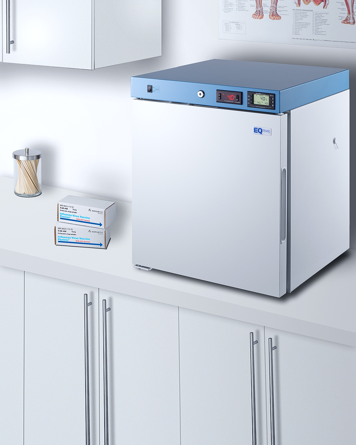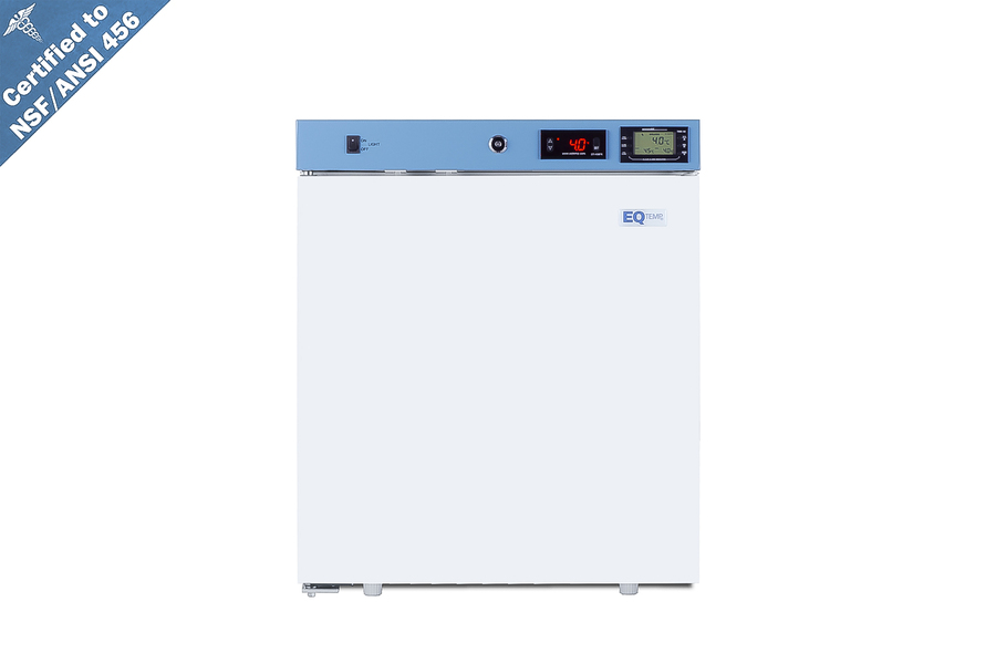 EQTemp introduces a new series of NSF/ANSI 456 certified refrigeration designed to store a variety of materials in healthcare facilities. Model ACR161WNSF456LHD is a compact 1.58 cu.ft. all-refrigerator. It features a clean white exterior and a blue-accented control panel. The glass door is equipped with a self-closing mechanism to help protect stored items from being overexposed to room temperature. A factory-installed lock offers added security, and the hospital-grade cord with a 'green dot' plug ensures a secure connection for high-traffic areas. The ACR161WNSF456LHD includes an external readout of the interior temperature, as well as the high/low temperature as required for data records. The buffered temperature probe is encased in a bottle filled with glass beads for improved accuracy and calibrated to NIST standards in our in-house ISO/IEC 17025:2017 certified laboratory. The digital temperature controls allow you to set the interior between 2 and 8ºC. An audible alarm sounds if the temperature goes out of range. We also include a pre-installed 3/8" access port for users to add their own monitoring equipment if preferred. The interior includes one wire shelf in the center to hold the temperature probe and additional adjustable shelves to accommodate different sizes. Internal LED lighting provides an efficient and convenient view. Automatic defrost reduces user maintenance and an internal fan ensures powerful temperature recovery after door openings. This unit ships with a left-hand door swing (for a right-hand version, see model ACR162GNSF456). EQTemp's series of ACR refrigeration is certified to the NSF/ANSI 456 Vaccine Storage Standard. All models feature hydrocarbon refrigerant for a greener footprint. Additional sizes are available, as well as more advanced cold storage equipment purpose-built for laboratory and life science storage. Browse the full product line to explore our extensive selection. Note: EQTemp's ACR Series refrigerators are intended for a wide variety of healthcare storage applications. Storage of high-value vaccines, life science materials, and medical/clinical biologicals require a product offering tighter temperature control and/or alarms, monitoring, and backup. For these applications, browse Accucold's purpose-built PHARMA-VAC line or contact our product specialists at 1-888-4-MED-LAB.