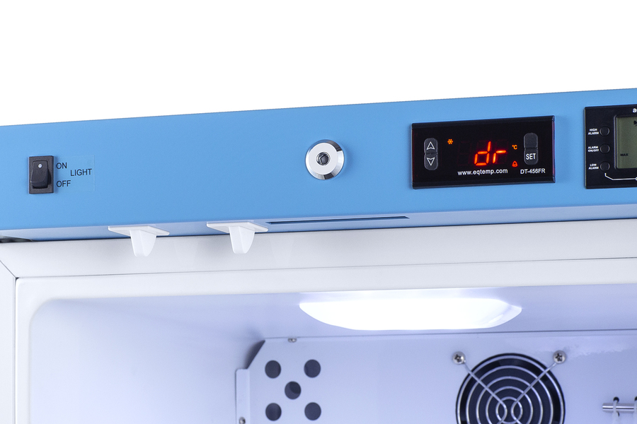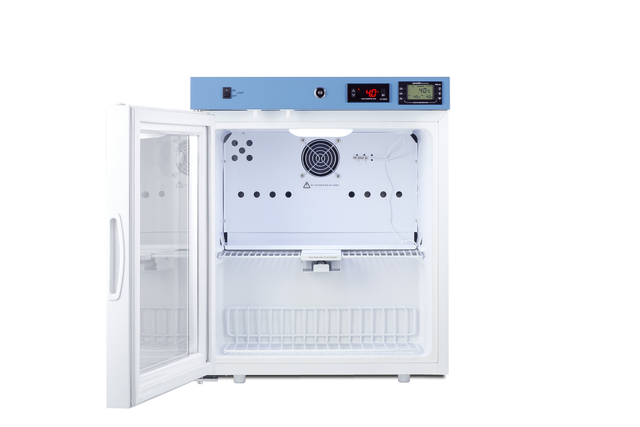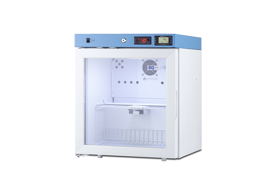 EQTemp introduces a new series of affordable, specialty refrigeration solutions for healthcare facilities seeking specialized cold storage. Model ACR162GLHD is a compact 1.58 cu.ft. all-refrigerator. It features a clean white exterior and a blue-accented control panel. The glass door is equipped with a self-closing mechanism to help protect stored items from being overexposed to room temperature. A factory-installed lock offers added security, and the hospital-grade cord with a 'green dot' plug ensures a secure connection for high-traffic areas. The ACR162GLHD includes an external readout of the interior temperature and the high/low temperature. The buffered temperature probe is encased in a bottle filled with glass beads for improved accuracy. The digital temperature controls allow you to set the interior between 2 and 8ºC. An audible alarm sounds if the temperature goes out of range. We also include a pre-installed 3/8" access port for users to add their own monitoring equipment if preferred. The interior includes one wire shelf in the center to hold the temperature probe. Internal LED lighting provides an efficient and convenient view. Automatic defrost reduces user maintenance, and an internal fan ensures robust temperature recovery after door openings. This unit ships with a left-hand door swing (for a right-hand version, see model ACR162G). The ACR series is also available certified to the NSF/ANSI 456 Vaccine Storage Standard with the upgrade of a NIST-calibrated temperature readout (see model ACR162GLHD). Additional sizes are available, as well as more advanced cold storage equipment purpose-built for laboratory and life science storage. Browse the complete product line to explore our extensive selection. Note: EQTemp's ACR Series refrigerators are intended for various healthcare storage applications. Storage of high-value vaccines, life science materials, and medical/clinical biologicals requires a product offering tighter temperature control and/or alarms, monitoring, and backup. For these applications, browse Accucold's purpose-built PHARMA-VAC line or contact our product specialists at 1-888-4-MED-LAB.