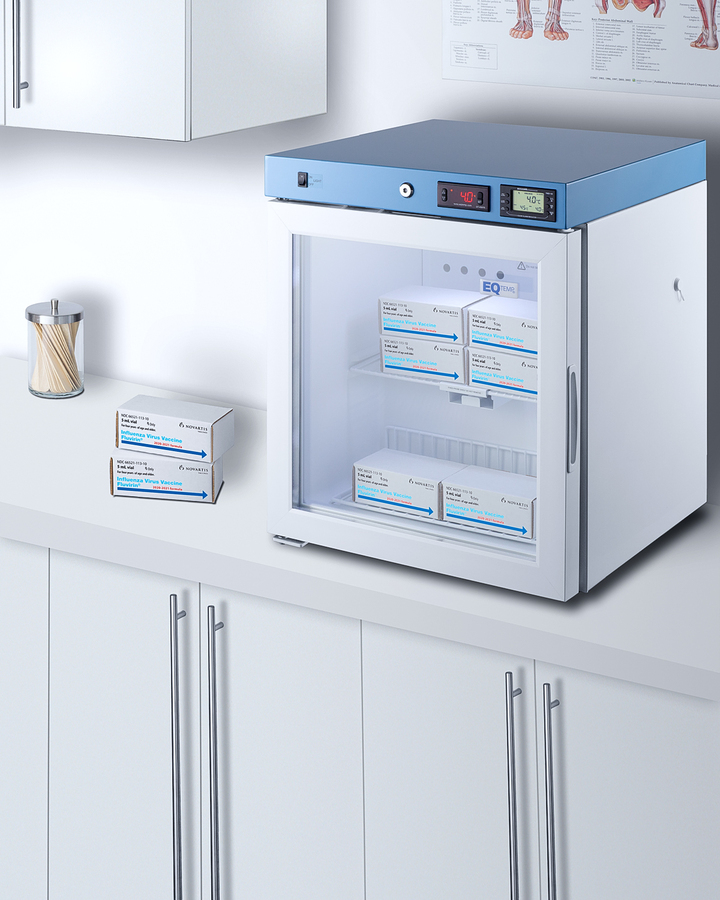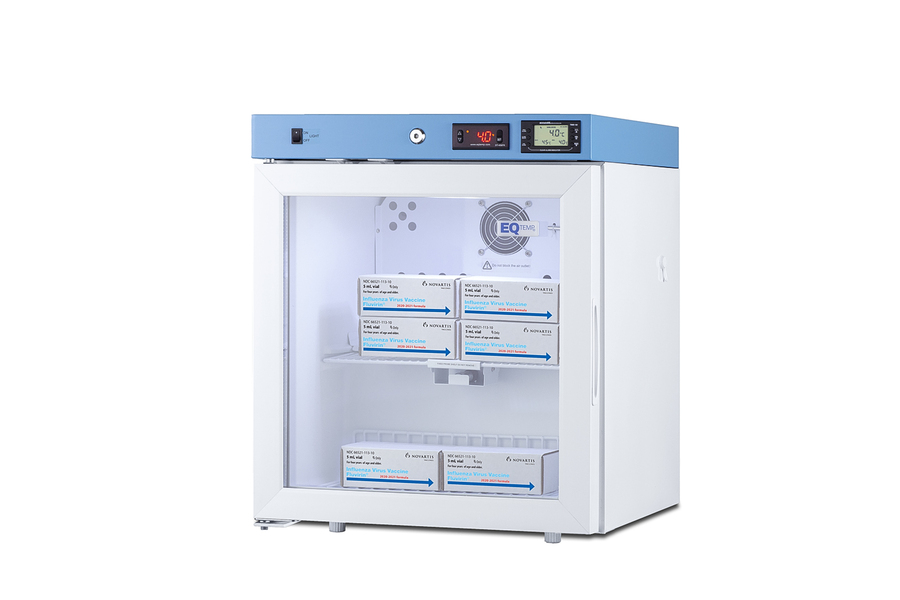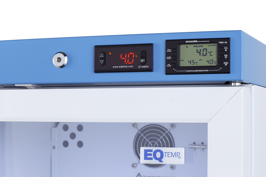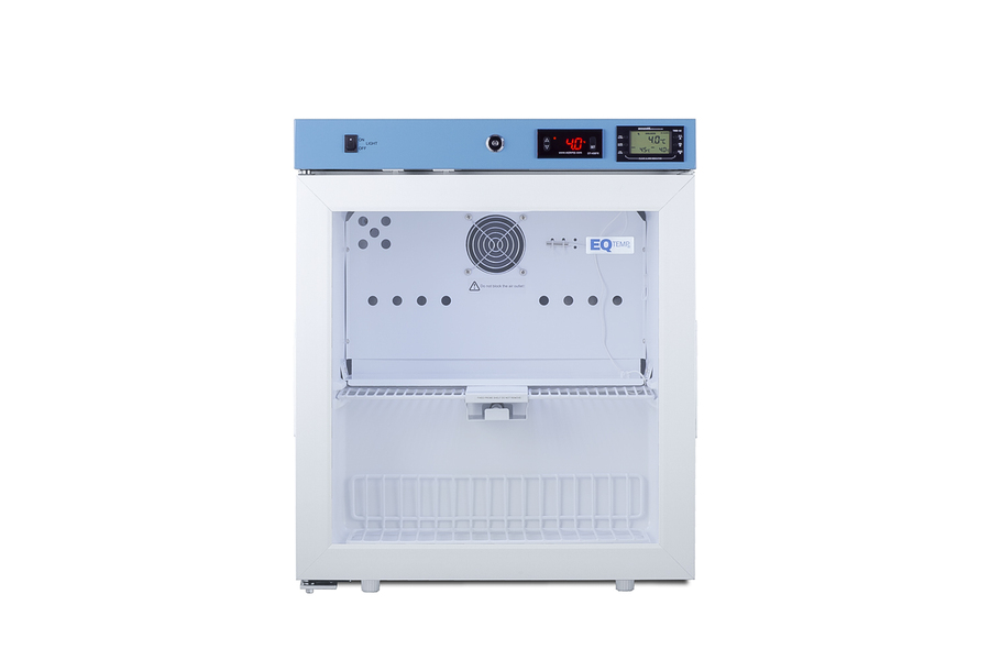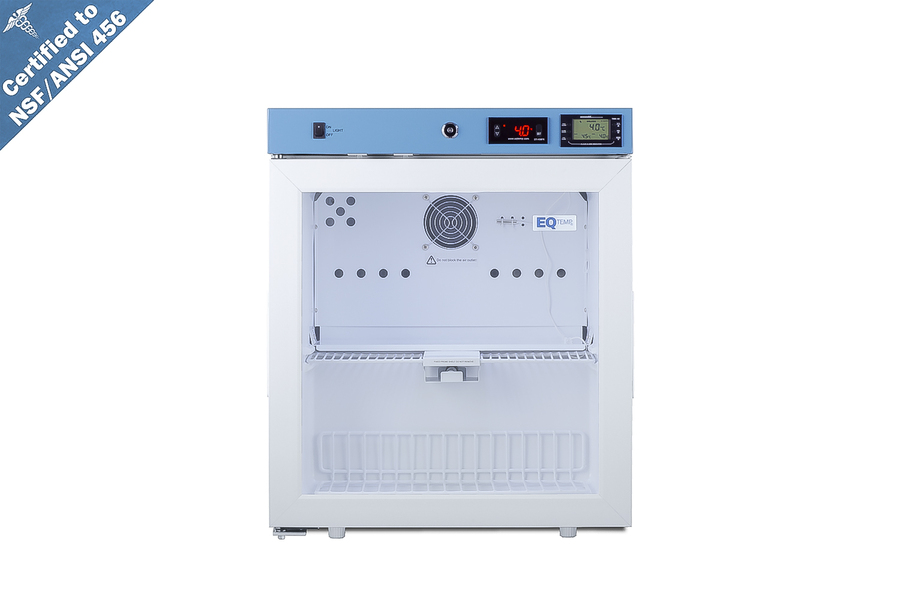 EQTemp introduces a new series of NSF/ANSI 456 certified refrigeration designed to store a variety of materials in healthcare facilities. Model ACR162GNSF456LHD is a compact 1.58 cu.ft. all-refrigerator. It features a clean white exterior and a blue-accented control panel. The glass door is equipped with a self-closing mechanism to help protect stored items from being overexposed to room temperature. A factory-installed lock offers added security, and the hospital-grade cord with a 'green dot' plug ensures a secure connection for high-traffic areas. The ACR162GNSF456LHD includes an external readout of the interior temperature, as well as the high/low temperature as required for data records. The buffered temperature probe is encased in a bottle filled with glass beads for improved accuracy and calibrated to NIST standards in our in-house ISO/IEC 17025:2017 certified laboratory. The digital temperature controls allow you to set the interior between 2 and 8ºC. An audible alarm sounds if the temperature goes out of range. We also include a pre-installed 3/8" access port for users to add their own monitoring equipment if preferred. The interior includes one wire shelf in the center to hold the temperature probe and additional adjustable shelves to accommodate different sizes. Internal LED lighting provides an efficient and convenient view. Automatic defrost reduces user maintenance and an internal fan ensures powerful temperature recovery after door openings. This unit ships with a left-hand door swing (for a right-hand version, see model ACR162GNSF456LHD). EQTemp's series of ACR refrigeration is certified to the NSF/ANSI 456 Vaccine Storage Standard. All models feature hydrocarbon refrigerant for a greener footprint. Additional sizes are available, as well as more advanced cold storage equipment purpose-built for laboratory and life science storage. Browse the full product line to explore our extensive selection. Note: EQTemp's ACR Series refrigerators are intended for a wide variety of healthcare storage applications. Storage of high-value vaccines, life science materials, and medical/clinical biologicals require a product offering tighter temperature control and/or alarms, monitoring, and backup. For these applications, browse Accucold's purpose-built PHARMA-VAC line or contact our product specialists at 1-888-4-MED-LAB.