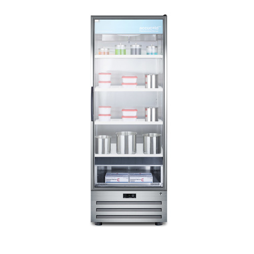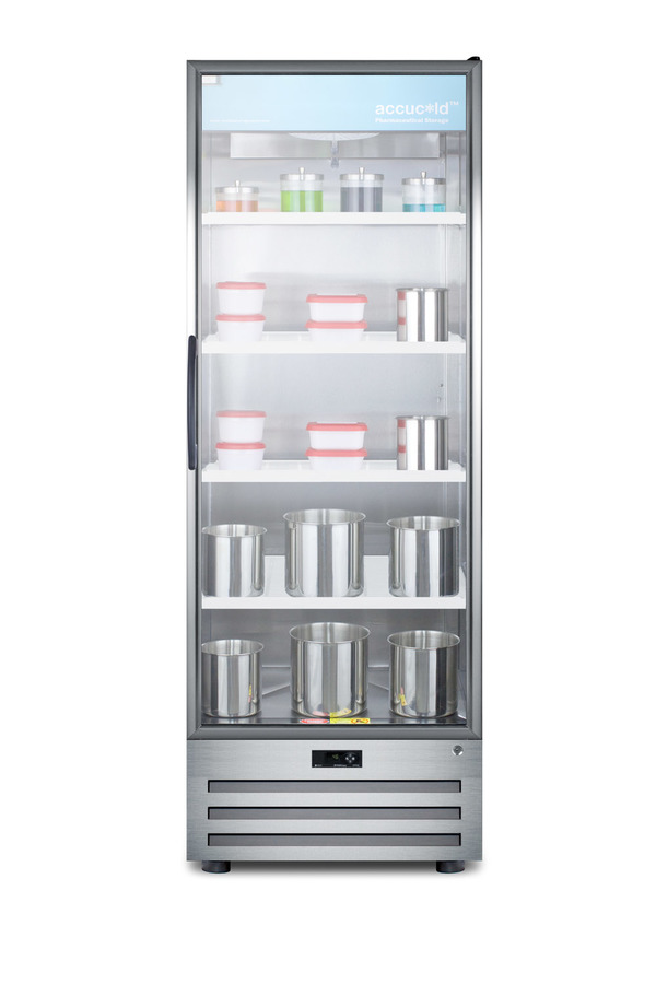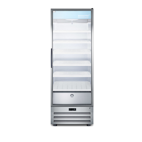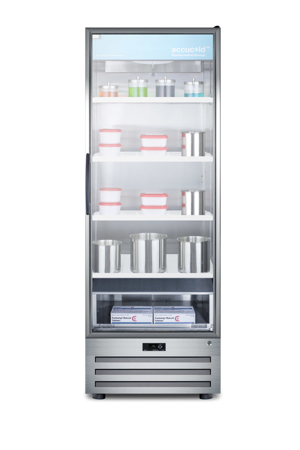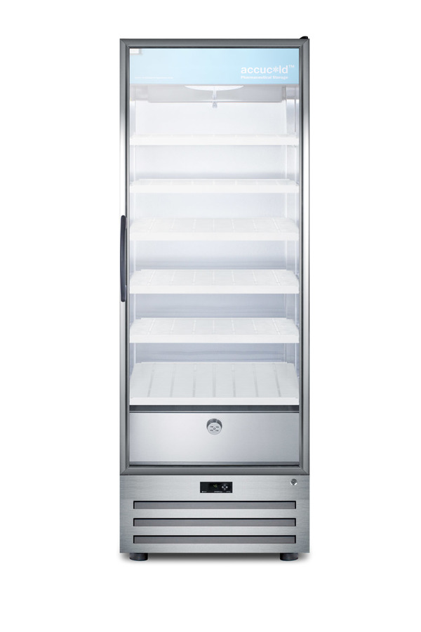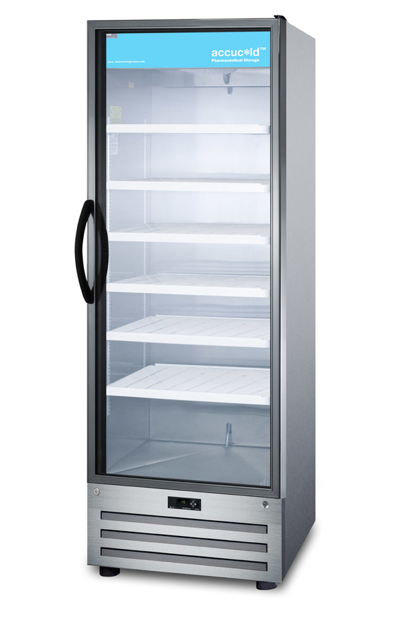 Accucold by Summit Appliance carries a quality line of pharmaceutical refrigeration for temperature-safe storage of sensitive material. The ACR1718RH offers 17 cu.ft. of interior storage, with six adjustable cantilevered shelves to accommodate a variety of sizes. The shelves are constructed from heavy duty recycled molded plastic for lasting durability. As an alternative, we offer a separate full-extension drawer in a durable aluminum finish that can be ordered with this unit. Fan-forced cooling ensures cold air is evenly distributed throughout the stainless steel interior. This model uses automatic defrost operation for easy user maintenance, with audible high/low temperature alarms to warn if the unit goes out of range. A digital thermostat offers intuitive and reliable temperature control. Designed for optimum pharmaceutical storage, the temperature range is 2ºC to 8ºC. The ACR1718RH comes with a stainless steel cabinet with a locking tempered self-closing glass door, an ideal time-saving feature for busy staffs that helps to ensure items aren’t accidentally exposed to room temperature. LED lighting in the door panel allows all stored items to be fully displayed. A hidden light switch is conveniently located towards the top of the unit, letting staff turn the lights off during off hours. This unit features a high efficiency compressor and maintenance-free rear condenser. A factory installed keyed lock offers added security in preventing unsupervised access to sensitive materials. NOTE: This unit has a right hand door swing and is not field reversible. For a left hand door swing, see the ACR1718LH. NOTE: Accucold refrigerators are purpose-built to the support meeting the current CDC (Centers for Disease Control) guidelines for the storage of vaccines. At this time, Accucold refrigerators have not been evaluated to the new NSF 456 standard. As referenced in the current Vaccine Storage and Handling Toolkit, these units incorporate microprocessor controls and forced air circulation for stable operation between 2 and 8ºC. For additional temperature assurance, the CDC recommends a calibrated digital data logger (DDL), which can be added with the factory-installed option DL2B or addition of the DL2BKit accessory.