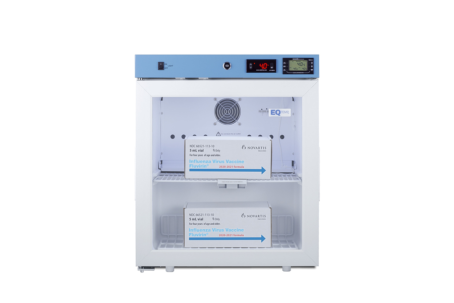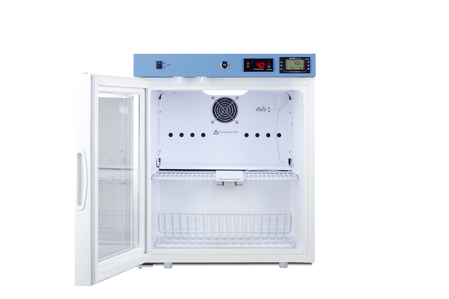 EQTemp introduces a new series of affordable, specialty refrigeration solutions for healthcare facilities seeking specialized cold storage. Model ACR22GLHD is a compact 1.94 cu.ft. all-refrigerator. It features a clean white exterior and a blue-accented control panel. The glass door is equipped with a self-closing mechanism to help protect stored items from being overexposed to room temperature. A factory-installed lock offers added security, and the hospital-grade cord with a 'green dot' plug ensures a secure connection for high-traffic areas. The ACR22GLHD includes an external readout of the interior temperature and the high/low temperature. The buffered temperature probe is encased in a bottle filled with glass beads for improved accuracy. The digital temperature controls allow you to set the interior between 2 and 8ºC. An audible alarm sounds if the temperature goes out of range. We also include a pre-installed 3/8" access port for users to add their own monitoring equipment if preferred. The interior includes one wire shelf in the center to hold the temperature probe. Internal LED lighting provides an efficient and convenient view. Automatic defrost reduces user maintenance, and an internal fan ensures robust temperature recovery after door openings. This unit ships with a left-hand door swing (for a right-hand version, see model ACR22G). The ACR series is also available certified to the NSF/ANSI 456 Vaccine Storage Standard with the upgrade of a NIST-calibrated temperature readout (see model ACR22GNSF456). Additional sizes are available, as well as more advanced cold storage equipment purpose-built for laboratory and life science storage. Browse the complete product line to explore our extensive selection. Note: EQTemp's ACR Series refrigerators are intended for various healthcare storage applications. Storage of high-value vaccines, life science materials, and medical/clinical biologicals requires a product offering tighter temperature control and/or alarms, monitoring, and backup. For these applications, browse Accucold's purpose-built PHARMA-VAC line or contact our product specialists at 1-888-4-MED-LAB.