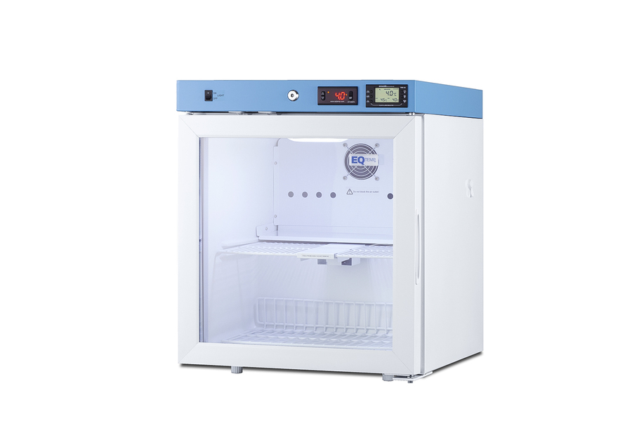 EQTemp introduces a new series of NSF/ANSI 456 certified refrigeration designed to store a variety of materials in healthcare facilities. Model ACR22GNSF456 is a compact 1.94 cu.ft. all-refrigerator. It features a clean white exterior and a blue-accented control panel. The glass door is equipped with a self-closing mechanism to help protect stored items from being overexposed to room temperature. A factory-installed lock offers added security, and the hospital-grade cord with a 'green dot' plug ensures a secure connection for high-traffic areas. The ACR22GNSF456 includes an external readout of the interior temperature, as well as the high/low temperature as required for data records. The buffered temperature probe is encased in a bottle filled with glass beads for improved accuracy and calibrated to NIST standards in our in-house ISO/IEC 17025:2017 certified laboratory. The digital temperature controls allow you to set the interior between 2 and 8ºC. An audible alarm sounds if the temperature goes out of range. We also include a pre-installed 3/8" access port for users to add their own monitoring equipment if preferred. The interior includes one wire shelf in the center to hold the temperature probe and additional adjustable shelves to accommodate different sizes. Internal LED lighting provides an efficient and convenient view. Automatic defrost reduces user maintenance and an internal fan ensures powerful temperature recovery after door openings. EQTemp's series of ACR refrigeration is certified to the NSF/ANSI 456 Vaccine Storage Standard. All models feature hydrocarbon refrigerant for a greener footprint. Additional sizes are available, as well as more advanced cold storage equipment purpose-built for laboratory and life science storage. Browse the full product line to explore our extensive selection. Note: EQTemp's ACR Series refrigerators are intended for a wide variety of healthcare storage applications. Storage of high-value vaccines, life science materials, and medical/clinical biologicals require a product offering tighter temperature control and/or alarms, monitoring, and backup. For these applications, browse Accucold's purpose-built PHARMA-VAC line or contact our product specialists at 1-888-4-MED-LAB.