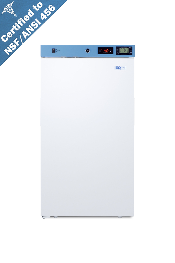 EQTemp introduces a new series of NSF/ANSI 456 certified refrigeration designed to store a variety of materials in healthcare facilities. Model ACR31WNSF456LHD is an upright 3.17 cu.ft. all-refrigerator. It features a clean white exterior and a blue-accented control panel. The glass door is equipped with a self-closing mechanism to help protect stored items from being overexposed to room temperature. A factory-installed lock offers added security, and the hospital-grade cord with a 'green dot' plug ensures a secure connection for high-traffic areas. The ACR31WNSF456LHD includes an external readout of the interior temperature, as well as the high/low temperature as required for data records. The buffered temperature probe is encased in a bottle filled with glass beads for improved accuracy and calibrated to NIST standards in our in-house ISO/IEC 17025:2017 certified laboratory. The digital temperature controls allow you to set the interior between 2 and 8ºC. An audible alarm sounds if the temperature goes out of range. We also include a pre-installed 3/8" access port for users to add their own monitoring equipment if preferred. The interior includes one wire shelf in the center to hold the temperature probe and additional adjustable shelves to accommodate different sizes. Internal LED lighting provides an efficient and convenient view. Automatic defrost reduces user maintenance and an internal fan ensures powerful temperature recovery after door openings. This unit ships with a left-hand door swing (for a right-hand version, see model ACR31WNSF456). EQTemp's series of ACR refrigeration is certified to the NSF/ANSI 456 Vaccine Storage Standard. All models feature hydrocarbon refrigerant for a greener footprint. Additional sizes are available, as well as more advanced cold storage equipment purpose-built for laboratory and life science storage. Browse the full product line to explore our extensive selection. Note: EQTemp's ACR Series refrigerators are intended for a wide variety of healthcare storage applications. Storage of high-value vaccines, life science materials, and medical/clinical biologicals require a product offering tighter temperature control and/or alarms, monitoring, and backup. For these applications, browse Accucold's purpose-built PHARMA-VAC line or contact our product specialists at 1-888-4-MED-LAB.