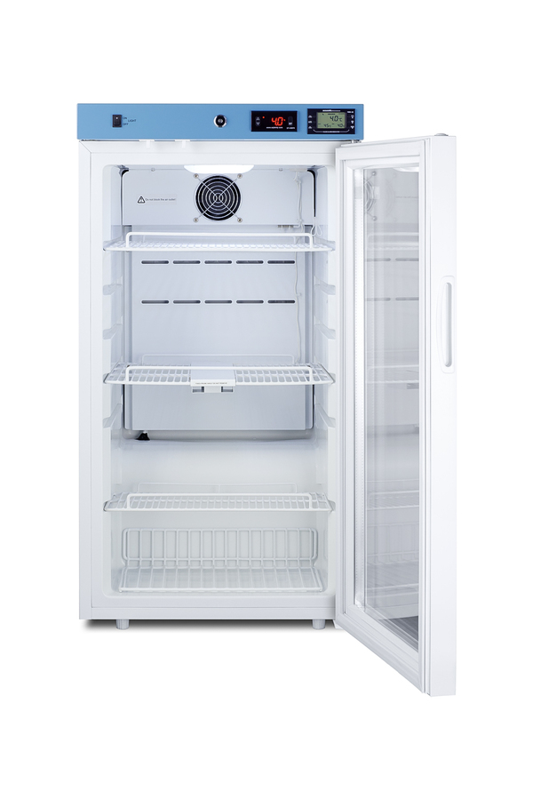 EQTemp introduces a new series of affordable, specialty refrigeration solutions for healthcare facilities seeking specialized cold storage. Model ACR32G is an upright 3.17 cu.ft. all-refrigerator. It features a clean white exterior and a blue-accented control panel. The glass door is equipped with a self-closing mechanism to help protect stored items from being overexposed to room temperature. A factory-installed lock offers added security, and the hospital-grade cord with a 'green dot' plug ensures a secure connection for high-traffic areas. The ACR32G includes an external readout of the interior temperature and the high/low temperature. The buffered temperature probe is encased in a bottle filled with glass beads for improved accuracy. The digital temperature controls allow you to set the interior between 2 and 8ºC. An audible alarm sounds if the temperature goes out of range. We also include a pre-installed 3/8" access port for users to add their own monitoring equipment if preferred. The interior includes one wire shelf in the center to hold the temperature probe, as well as two additional adjustable shelves to accommodate different sizes. Internal LED lighting provides an efficient and convenient view. Automatic defrost reduces user maintenance, and an internal fan ensures robust temperature recovery after door openings. This unit is also available certified to the NSF/ANSI 456 Vaccine Storage Standard with the upgrade of a NIST calibrated temperature readout (see model ACR32GNSF456). Additional sizes are available, as well as more advanced cold storage equipment purpose-built for laboratory and life science storage. Browse the complete product line to explore our extensive selection. Note: EQTemp's ACR Series refrigerators are intended for various healthcare storage applications. Storage of high-value vaccines, life science materials, and medical/clinical biologicals requires a product offering tighter temperature control and/or alarms, monitoring, and backup. For these applications, browse Accucold's purpose-built PHARMA-VAC line or contact our product specialists at 1-888-4-MED-LAB.