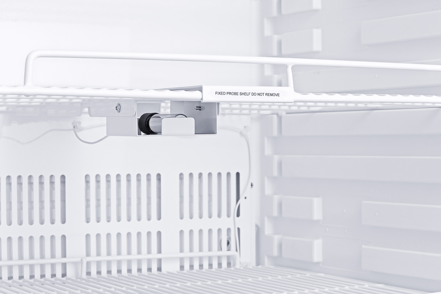 Thermometer probe is encased in a glass bead-filled bottle and stored in a fixed box on the center shelf. This is the ideal way to produce temperature readings closest to stored contents, as recommended by the CDC, VFC and VFA's guidelines