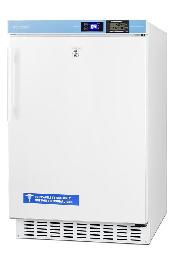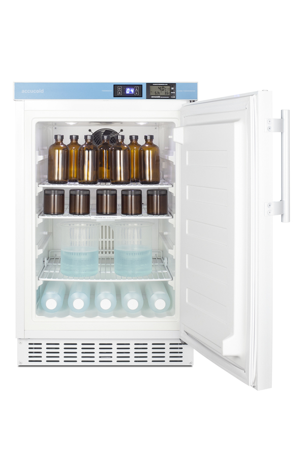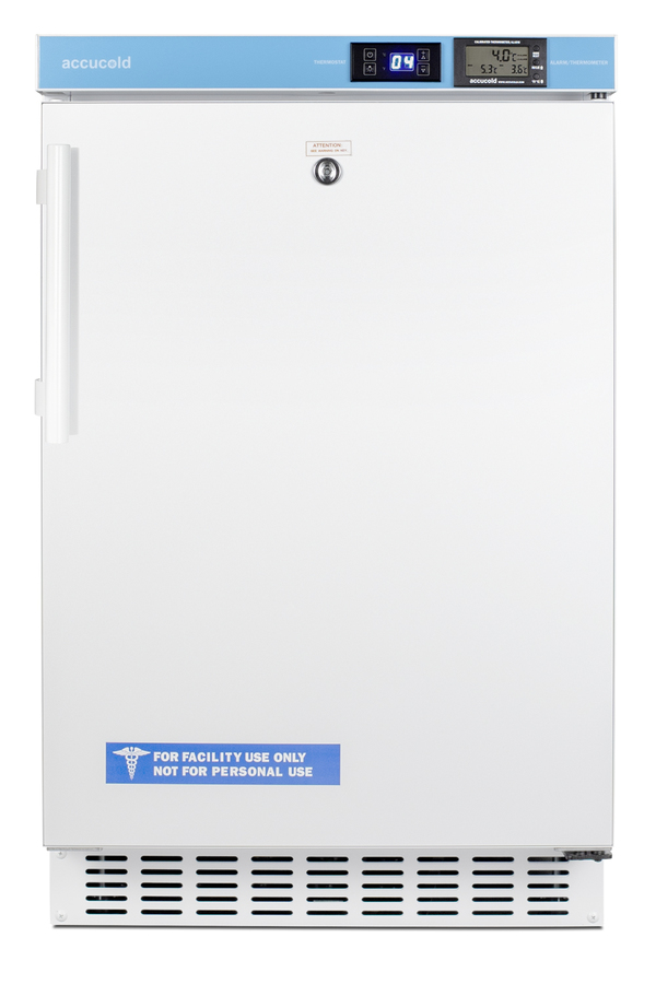 Accucold’s Pharmaceutical Series features refrigeration specially designed to meet current CDC, VFC and VFA guidelines for vaccine storage, with built-in choices sized to fit under ADA compliant counters. The ACR45LCAL all-refrigerator is sized at just under 32" high. It features a front-breathing design for built-in installation under lower ADA compliant counters, with a fully finished cabinet that also allows freestanding use. Its sealed back allows for a better fit and easier cleanability. A hospital grade cord with a 'green dot' plug provides added safety in high traffic areas and a factory-installed keyed lock is located towards the top of the unit for convenient security. The user-reversible door includes a side-mounted handle for added convenience, with a self-closing mechanism to ensure items aren't accidentally exposed to warm air. Four adjustable leveling legs allow you to raise the height for a better fit under standard countertops. For optimum temperature management, the ACR45L features an external control panel, allowing users to adjust and monitor the temperature without opening the door. A pre-installed NIST certified thermometer is calibrated in our own ISO/IEC 17025:2017 accredited laboratory to provide an external readout of the current and high/low temperatures to the nearest tenth of a degree (as recommended by the CDC, VFC and VFA). The display is switchable between Celsius or Fahrenheit at the touch of a button. The thermometer includes an audible alarm to warn users if the interior has gone out of the programmed temperature range. The buffered temperature probe is encased in a bottle filled with glass beads and secured inside the center shelf to best simulate the temperature of other stored contents, resulting in the utmost accuracy for temperature reporting. We include a pre-installed 3/8" probe hole for users who wish to install additional monitoring equipment as needed and a certificate of calibration for your facility's records. Inside, the 2.65 cu.ft. interior includes two adjustable wire shelves for optimum circulation, with one center fixed shelf to keep the temperature probe in place. The foamed-in-place cabinet and door liner affords added insulation of the interior for improved temperature stability, while an internal fan helps to evenly cool the interior from top to bottom. This model utilizes frost-free operation to minimize user maintenance. LED lighting helps to provide a clean, energy efficient view. At just under 20" wide, the ACR45LCAL is the perfect storage solution for doctors' offices, veterinary clinics, pharmacies, and similar healthcare environments. Additional purpose-built choices for vaccine storage are available in a variety of sizes. Browse the Accucold website to explore the full product line. Note: Accucold's Pharmaceutical Series refrigerators have been tested to operate within 2.5ºC of the temperature set point and are intended for a wide variety of healthcare storage applications, including vaccines, specimens, pharmaceuticals, and other medical, biological, life science, and industrial materials. At this time, Accucold refrigerators have not been evaluated to the new NSF 456 standard. As referenced in the current Vaccine Storage and Handling Toolkit, these units incorporate microprocessor controls and forced air circulation for stable operation between 2 and 8ºC. For units with a +/-1ºC variation, see Accucold’s Performance Series.