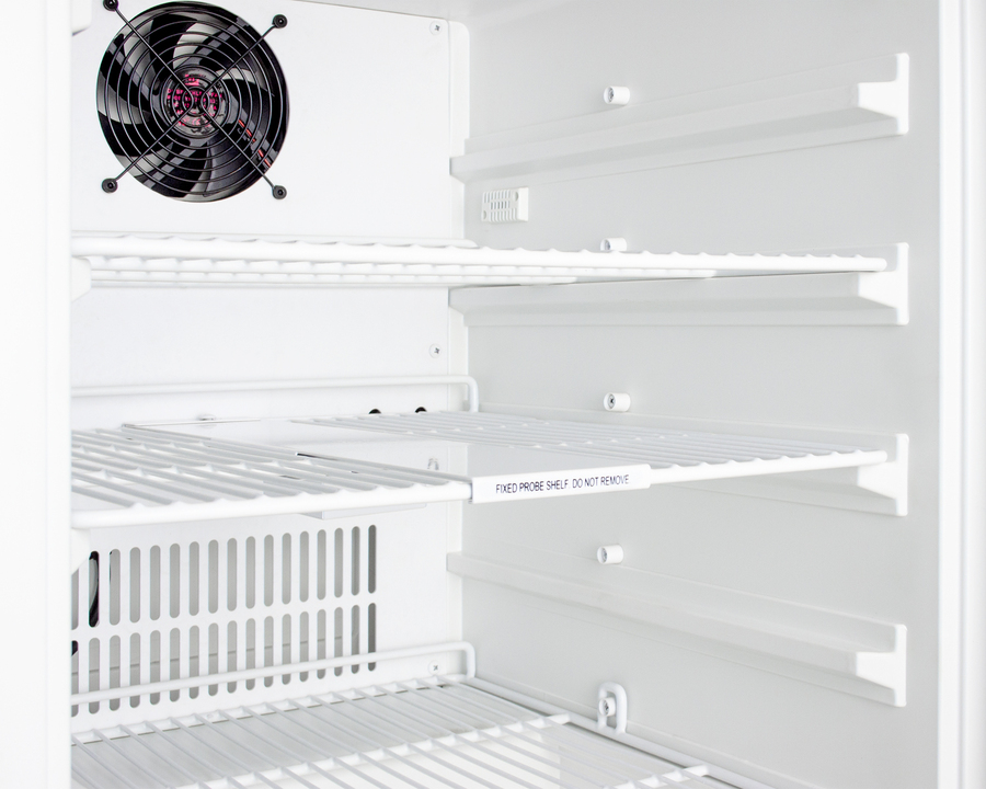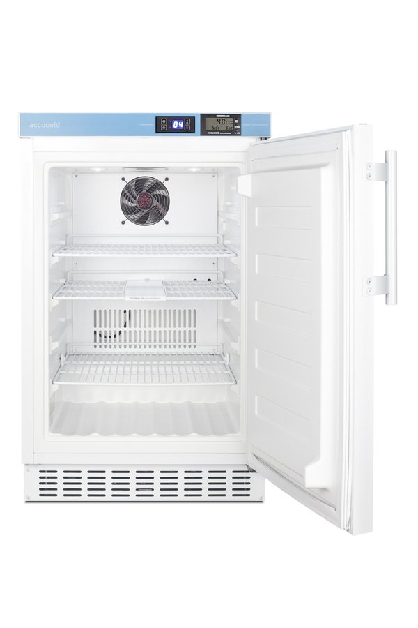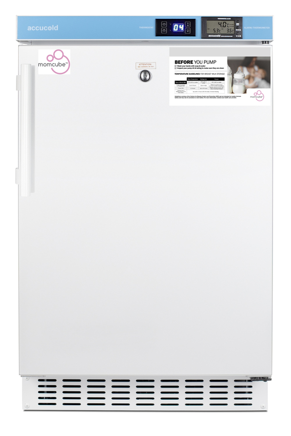 MOMCUBE® by Accucold specializes in refrigeration designed for the safe storage of mother's milk. MOMCUBE® units are an ideal addition to employee wellness rooms, daycare centers, and work environments seeking to adhere to Section 4207 of the Patient Protection and Affordable Care Act. The ACR45LMC is an ADA height breast milk all-refrigerator sized at just under 32" high, with a front-breathing design for built-in installation and fully finished cabinet that also allows freestanding use. Its sealed back allows for a better fit and easier cleanability. A hospital grade cord with a 'green dot' plug provides added safety in high traffic areas and a factory-installed keyed lock is located towards the top of the unit for convenient security. The user-reversible door includes a side-mounted handle for added convenience, with a self-closing mechanism to ensure items aren't accidentally exposed to warm air. Four adjustable leveling legs allow you to raise the height for a better fit under standard countertops. For optimum temperature management, the ACR45LMC features an external control panel, allowing users to adjust and monitor the temperature without opening the door. This unit is set at 38ºF for optimum breast milk storage. Additionally, it is equipped with a thermometer that displays the current, minimum, and maximum temperatures to the nearest tenth of a degree with a readout viewable in Celsius or Fahrenheit. The thermometer includes an audible alarm to warn users if the interior has gone out of the programmed temperature range. The buffered temperature probe is encased in a bottle filled with glass beads and secured inside the center shelf to best simulate the temperature of other stored contents, resulting in the utmost accuracy for temperature reporting. We include a pre-installed 3/8" probe hole for users who wish to install additional monitoring equipment as needed. Inside, the 2.65 cu.ft. interior includes two adjustable wire shelves for optimum circulation, with one center fixed shelf to keep the temperature probe in place. The foamed-in-place cabinet and door liner affords added insulation of the interior for improved temperature stability, while an internal fan helps to evenly cool the interior from top to bottom. This model utilizes frost-free operation to minimize user maintenance. LED lighting helps to provide a clean, energy efficient view. At just under 20" wide, the ACR45LMC is a perfect fit for wellness rooms, lactation lounges, and employee break rooms that require separate and secure storage for breast milk. Additional choices are available in smaller and larger sizes, as well as breast milk freezers for longer term storage. Browse the full MOMCUBE® line to find the right choice for your nursing mothers' storage needs.