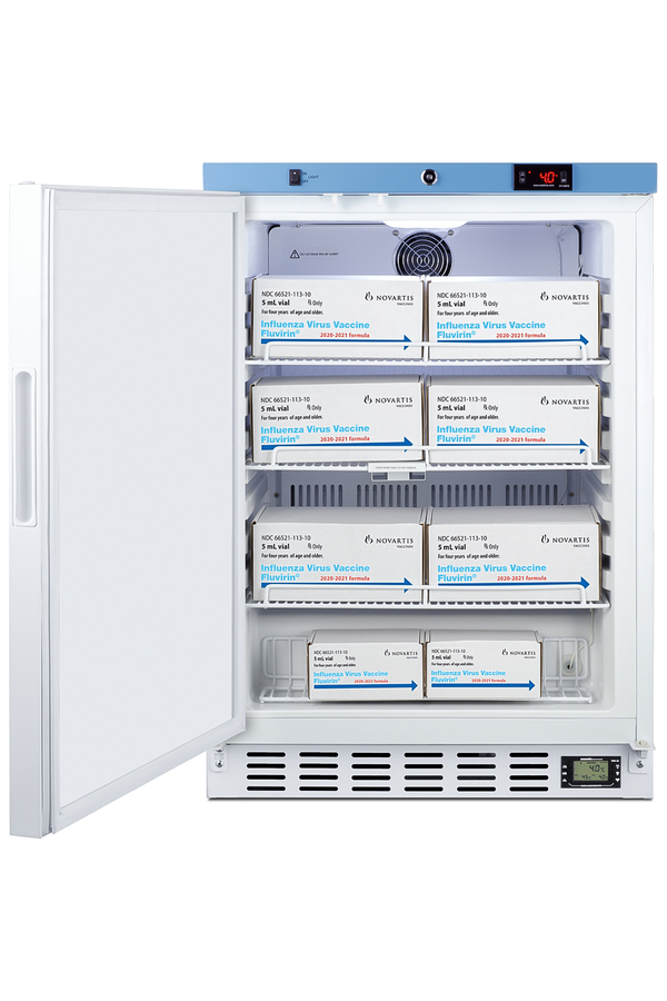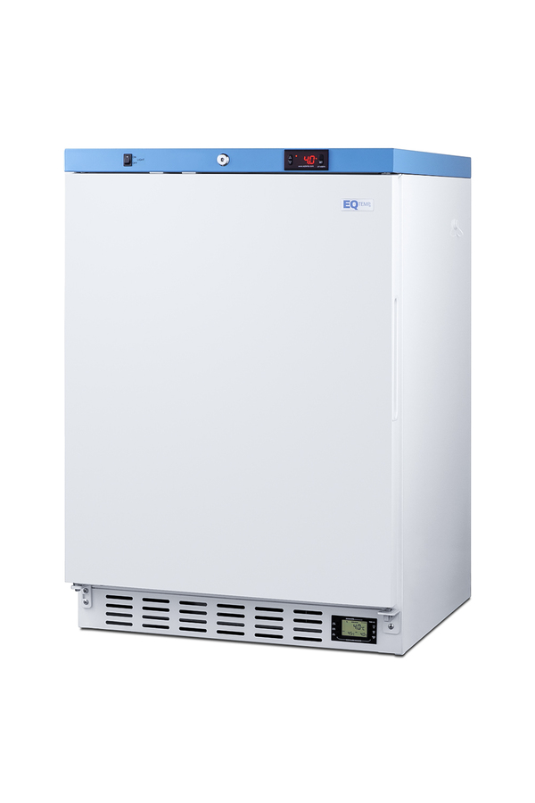 EQTemp introduces a new series of NSF/ANSI 456 certified refrigeration designed to store a variety of materials in healthcare facilities. Model ACR51WNSF456LHD is an upright 3.88 cu.ft. all-refrigerator. It features a clean white exterior and a blue-accented control panel. The solid door is equipped with a self-closing mechanism to help protect stored items from being overexposed to room temperature. A factory-installed lock offers added security, and the hospital-grade cord with a 'green dot' plug ensures a secure connection for high-traffic areas. This unit features a front-breathing design for safe built-in installation under counters. The fully finished cabinet also allows freestanding use. The ACR51WNSF456LHD includes an external readout of the interior temperature, as well as the high/low temperature as required for data records. The buffered temperature probe is encased in a bottle filled with glass beads for improved accuracy and calibrated to NIST standards in our in-house ISO/IEC 17025:2017 certified laboratory. The digital temperature controls allow you to set the interior between 2 and 8ºC. An audible alarm sounds if the temperature goes out of range. We also include a pre-installed 3/8" access port for users to add their own monitoring equipment if preferred. The interior includes one wire shelf in the center to hold the temperature probe, as well as additional adjustable shelves to accommodate different sizes. Internal LED lighting provides an efficient and convenient view. Automatic defrost reduces user maintenance and an internal fan ensures powerful temperature recovery after door openings. This unit ships with a left-hand door swing (for a right-hand version, see model ACR51WNSF456). EQTemp's series of ACR refrigeration is certified to the NSF/ANSI 456 Vaccine Storage Standard. All models feature hydrocarbon refrigerant for a greener footprint. Additional sizes are available, as well as more advanced cold storage equipment purpose-built for laboratory and life science storage. Browse the full product line to explore our extensive selection. Note: EQTemp's ACR Series refrigerators are intended for a wide variety of healthcare storage applications. Storage of high-value vaccines, life science materials, and medical/clinical biologicals require a product offering tighter temperature control and/or alarms, monitoring, and backup. For these applications, browse Accucold's purpose-built PHARMA-VAC line or contact our product specialists at 1-888-4-MED-LAB.