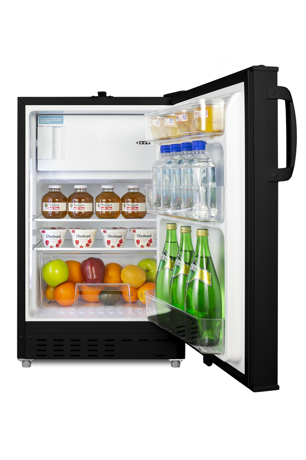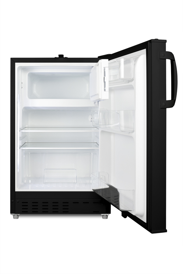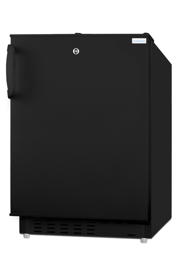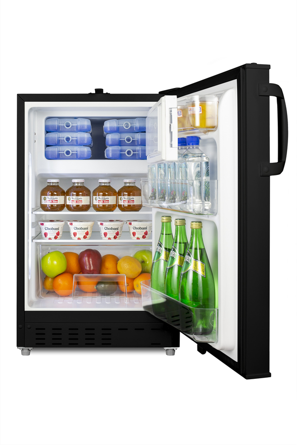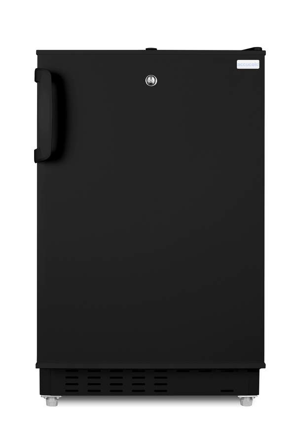 Accucold offers a wide range of built-in undercounter refrigeration for general purpose storage in healthcare institutions. The ADA302BRFZ is a refrigerator-freezer designed for use in settings complying with ADA guidelines. The ADA302BRFZ is sized at 32" high to fit under lower counters complying with ADA guidelines for accessibility. The fully finished textured black cabinet allows freestanding use, while the front-breathing system means this unit can be built-in with minimum clearance. A factory-installed lock is located towards the top of the door for convenient access and security, perfect for high-traffic environments. The user-reversible door is 3" thick to ensure proper insulation and unit efficiency, with a handle included for added convenience. This unit comes with a right angle cord to allow for added placement options without added depth. Inside, the ADA302BRFZ features an all-white 2.68 cu.ft. interior for easy cleaning, with static manual defrost operation and a dial thermostat. An automatic LED light located toward the front of the unit illuminates the interior for full visibility. Three spill-proof adjustable glass shelves offer flexible storage options and a removable clear crisper drawer holds additioal items as needed. The door includes three removable racks. This unit includes a compact freezer compartment with an interior swing door, perfect for ice cube trays, ice packs, or additional supplies in need of freezing. With its compact size and convenient features, the ADA302BRFZ is the perfect unit for doctor's offices, nurses' stations, clinics, and other healthcare settings in need of an easy-fitting ADA compliant refrigerator-freezer. Note: This product is intended for a wide variety of basic storage applications. Storage of high-value vaccines, life science materials, and medical/clinical biologicals require a product offering tighter temperature control and/or alarms, monitoring, and backup. For more information, browse Accucold's purpose-built line or contact our product specialists at 1-888-4-MED-LAB.