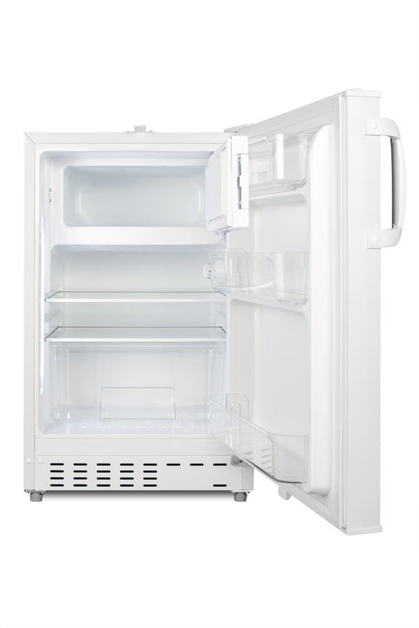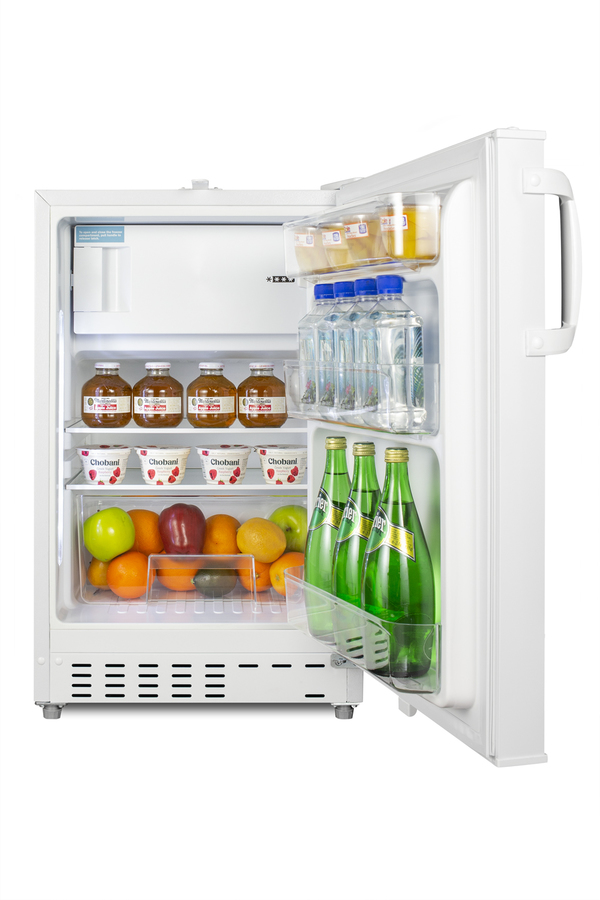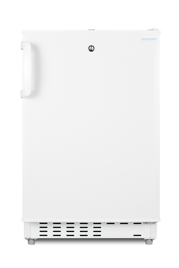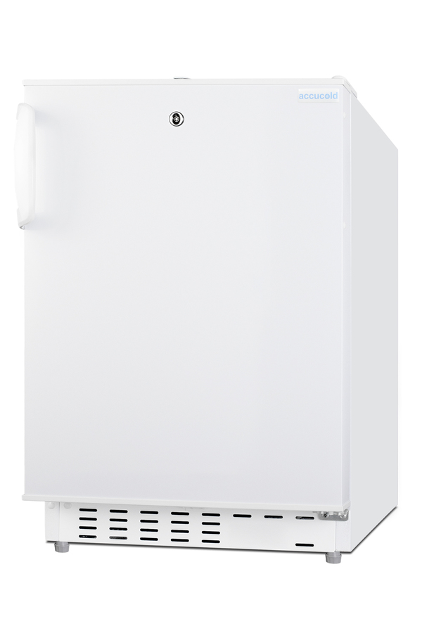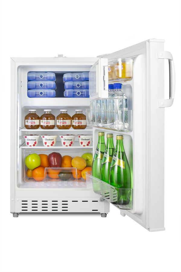Accucold offers a wide range of built-in undercounter refrigeration for general purpose storage in healthcare institutions. The ADA302RFZ is a refrigerator-freezer designed for use in settings complying with ADA guidelines. The ADA302RFZ is sized at 32" high to fit under lower counters complying with ADA guidelines for accessibility. The fully finished textured white cabinet allows freestanding use, while the front-breathing system means this unit can be built-in with minimum clearance. A factory-installed lock is located towards the top of the door for convenient access and security, perfect for high-traffic environments. The user-reversible door is 3" thick to ensure proper insulation and unit efficiency, with a handle included for added convenience. This unit comes with a right angle cord to allow for added placement options without added depth. Inside, the ADA302RFZ features an all-white 2.68 cu.ft. interior for easy cleaning, with static manual defrost operation and a dial thermostat. An automatic LED light located toward the front of the unit illuminates the interior for full visibility. Three spill-proof adjustable glass shelves offer flexible storage options and a removable clear crisper drawer holds additioal items as needed. The door includes three removable racks. This unit includes a compact freezer compartment with an interior swing door, perfect for ice cube trays, ice packs, or additional supplies in need of freezing. With its compact size and convenient features, the ADA302RFZ is the perfect unit for doctor's offices, nurses' stations, clinics, and other healthcare settings in need of an easy-fitting ADA compliant refrigerator-freezer. Note: This product is intended for a wide variety of basic storage applications. Storage of high-value vaccines, life science materials, and medical/clinical biologicals require a product offering tighter temperature control and/or alarms, monitoring, and backup. For more information, browse Accucold's purpose-built line or contact our product specialists at 1-888-4-MED-LAB.