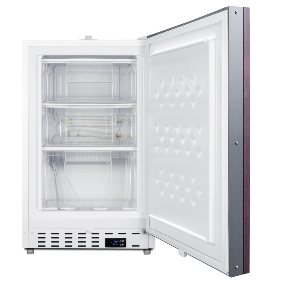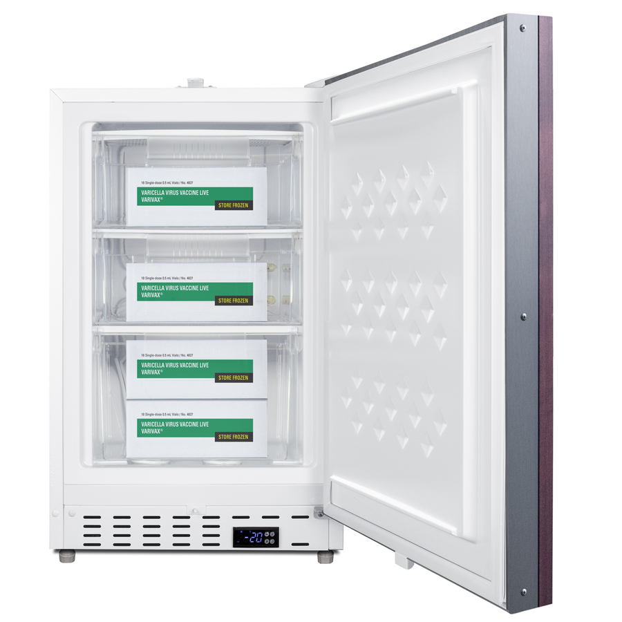 Accucold offers a quality selection of 20" wide built-in undercounter all-freezers designed for installation under lower ADA-compliant counters. These freezers have advanced features for safely storing select healthcare materials with strict storage conditions. The ADA305AFIF is sized at 32" high for use in ADA-compliant settings. The fully finished textured white cabinet allows freestanding use, while the front-breathing system means this unit can be built-in with minimum clearance. The door is 3" thick for efficient insulation and features an integrated stainless steel frame designed to accept full panel overlays, allowing users to seamlessly blend the unit into their own cabinetry design (panel size: 19 13/16" W x 27 1/8" H). This unit comes with a right angle cord to allow for easier placement without added depth. A digital thermostat is located in the kickplate for easy temperature management with a readout in Fahrenheit or Celsius. This unit has a hospital-grade cord with a green dot plug for safety in high-traffic areas. Plus, powerful magnetic gaskets ensure a tight seal. Inside, the ADA305AFIF can reach temperatures as low as -25°C. Static manual defrost operation provides efficient cooling inside the 2.47 cu.ft. interior. Three removable pull-out drawers on fixed wire shelving offer convenient storage, with plastic fronts that help to protect contents from warmer ambient temperatures when the door is opened. As recommended by the CDC, this unit has a flat door liner to ensure users don't store sensitive contents on the door. The user-set high and low-temperature alarms provide added security should the temperature exceed the set point, while the open-door alarm sounds if the door is ajar beyond one minute for added peace of mind. These alarms can be turned off depending on your needs. A preinstalled probe hole is included to allow users to connect their own monitoring equipment. Sized at just under 20" wide, the ADA305AFIF makes an ideal choice for various healthcare facilities in need of a dependable freezer capable of -20ºC/-25ºC operation. For a complete set, pair this unit with the matching ADA404REFIF all-refrigerator.