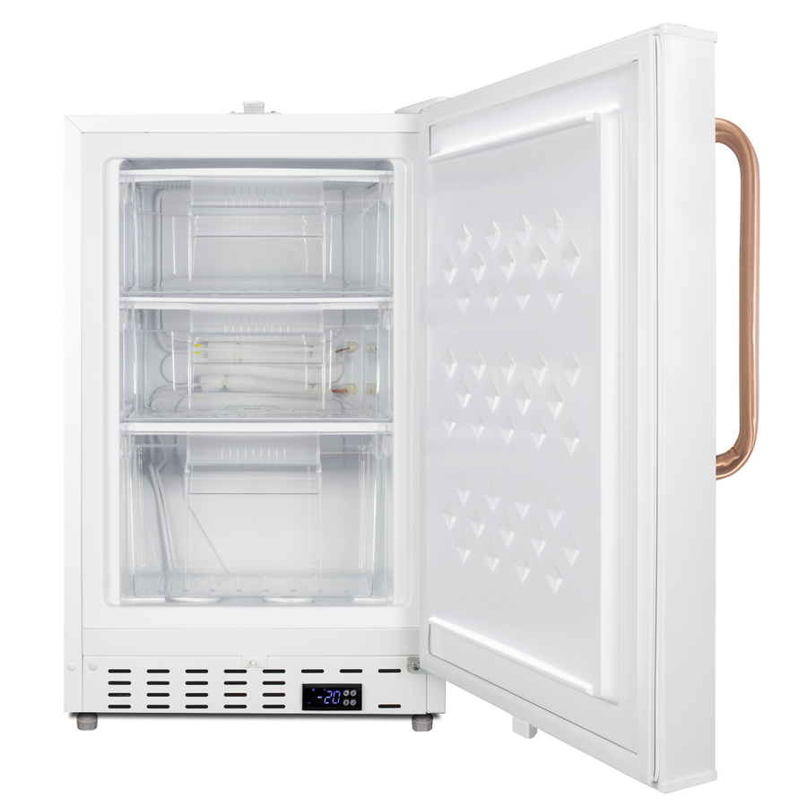 Accucold offers a quality selection of 20" wide built-in undercounter all-freezers designed for installation under lower ADA compliant counters, with advanced features for the safe storage of select vaccines, pharmaceuticals, and other materials with strict storage conditions. The ADA305AFTBC is sized at 32" high to fit under lower counters complying with ADA guidelines for accessibility. The fully finished textured white cabinet allows freestanding use, while the front-breathing system means this unit can be built-in with minimum clearance. The door is 3" thick for efficient insulation, with a top-mounted lock for added security and convenient access. A digital thermostat, located in the kickplate, makes for easy temperature management with a readout in Fahrenheit or Celsius. This unit comes with a hospital grade cord with a green dot plug for added safety in high traffic areas. Powerful magnetic gaskets ensure a tight seal. The ADA305AFTBC includes a factory-installed towel bar style handle made from pure copper. Through its natural antimicrobial properties, copper will kill microbes, including viruses, in a shorter timeframe than most other metal surfaces allowing for a safer, cleaner user experience. Inside, the ADA305AFTBC can reach temperatures as low as -25°C. Static manual defrost operation provides efficient cooling inside the 2.47 cu.ft. interior. Three removable pull-out drawers on fixed wire shelving offer convenient storage, with plastic fronts that help to protect contents from warmer ambient temperatures when the door is opened. As recommended by the CDC, this unit has a flat door liner to ensure users don't store sensitive contents on the door. The user-set high and low temperature alarms provide added security should the temperature go beyond the setpoint, while the open door alarm sounds if the door is ajar beyond one minute for added peace-of-mind. These alarms can be disabled depending on your needs. A preinstalled probe hole is included to allow users to connect their own monitoring equipment. Sized at just under 20" wide, the ADA305AFTBC makes an ideal choice for various facilities in need of a dependable freezer capable of -20ºC/-25ºC operation. For a complete set, pair this unit with the matching ADA404REFTBC all-refrigerator. NOTE: Accucold freezers are purpose-built to the support meeting the current CDC (Centers for Disease Control) guidelines for the storage of vaccines. As referenced in the current Vaccine Storage and Handling Toolkit, these units incorporate several key features for stable operation. For additional temperature assurance, the CDC recommends a calibrated digital data logger (DDL), which can be added with the factory-installed option DL2B or addition of the DL2BKit accessory. Select Accucold products have been tested and certified to the new NSF 456 standard, and are now available for purchase. For additional information, contact our products specialists.