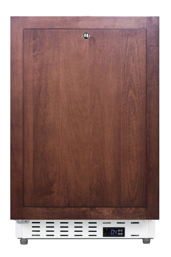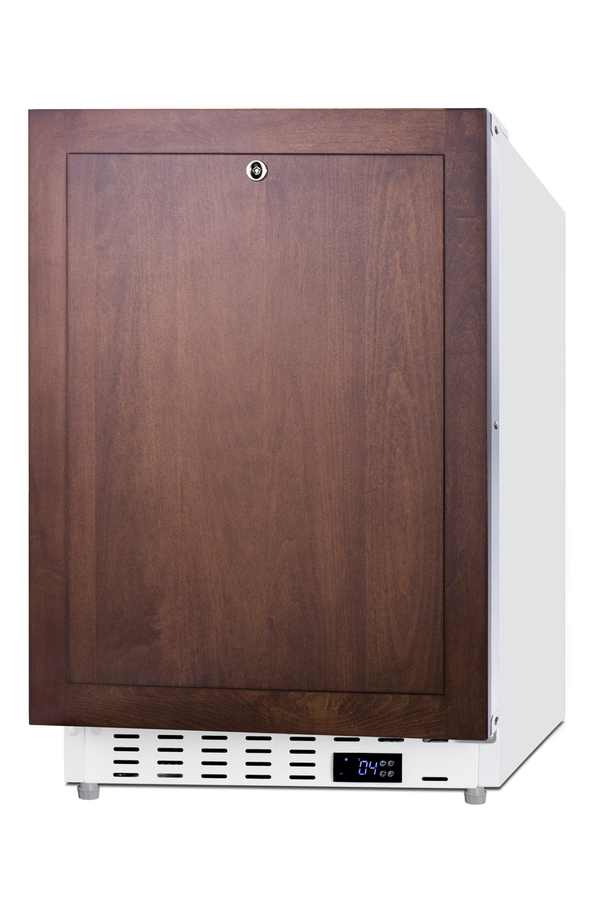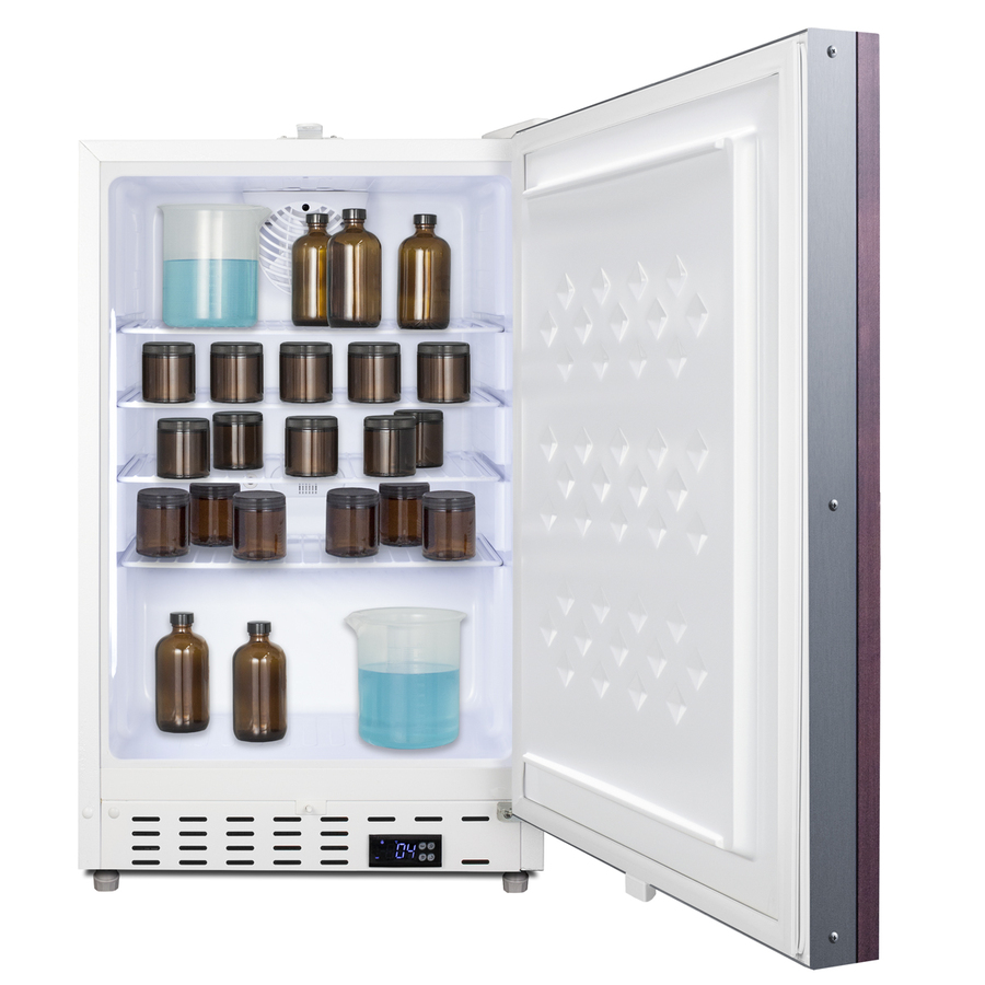 Accucold offers a quality selection of 20" wide built-in undercounter all-refrigerators designed for installation under lower ADA-compliant counters. These refrigerators have advanced features for user convenience. The ADA404REFIF is sized at 32" high for use in ADA-compliant settings. The fully finished textured white cabinet allows freestanding use, while the front-breathing system means this unit can be built-in with minimum clearance. The door is 3" thick for efficient insulation and features an integrated stainless steel frame designed to accept full panel overlays, allowing users to seamlessly blend the unit into their own cabinetry design (panel size: 19 13/16" W x 27 1/8" H). This unit comes with a right angle cord to allow for easier placement without added depth. Inside, the ADA404REFIF is designed to operate between +2°C and +8°C as recommended for storing select pharmaceuticals and other medical supplies. An LED light located on the front left side of the unit attractively illuminates the interior when the door opens. Automatic defrost operation ensures minimal user maintenance, with an internal fan to help promote even cooling throughout the 3.32 cu.ft. interior. Adjustable wire shelves allow you to rearrange the interior to suit your storage needs best. As recommended by the CDC, this unit has a flat door liner to ensure users don't store sensitive contents on the door. The user-set high and low-temperature alarms provide added security should the temperature exceed the set point. The open door alarm sounds if the door is ajar for more than a minute for added peace of mind. These alarms can be turned off depending on your needs. A preinstalled probe hole is included to allow users to connect their own monitoring equipment. Sized at just under 21" wide, the ADA404REFIF makes an ideal choice for various healthcare facilities. For a matching freezer, see the ADA305AFIF.