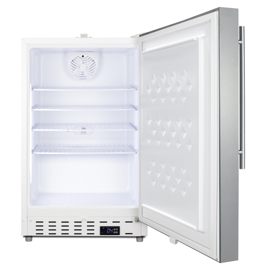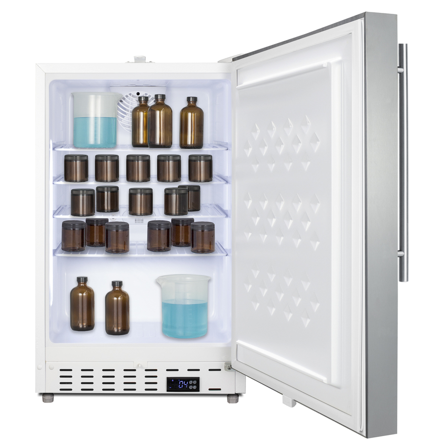 Accucold offers a quality selection of 20" wide built-in undercounter all-refrigerators designed for installation under lower ADA-compliant counters. These refrigerators have advanced features for user convenience. The ADA404REFSSHV is 32" high for use in ADA compliant settings. The fully finished textured white cabinet allows freestanding use, while the front-breathing system means this unit can be built-in with minimum clearance. The user-reversible stainless steel door features a sleek, vertically-mounted handlebar that matches many popular cabinetry styles and a top-mounted lock for added security and convenient access. A digital thermostat is located in the kickplate for easy temperature management with a readout in Fahrenheit or Celsius. This unit comes with a hospital-grade cord with a green dot plug for added safety in high-traffic areas. Powerful magnetic gaskets ensure a tight seal. Inside, the ADA404REFSSHV is designed to operate between +2°C and +8°C as recommended for storing select pharmaceuticals and other medical supplies. An LED light located on the front left side of the unit attractively illuminates the interior when the door opens. Automatic defrost operation ensures minimal user maintenance, with an internal fan to help promote even cooling throughout the 3.32 cu.ft. interior. Adjustable wire shelves allow you to rearrange the interior to suit your storage needs best. As recommended by the CDC, this unit has a flat door liner to ensure users don't store sensitive contents on the door. The user-set high and low-temperature alarms provide added security should the temperature exceed the set point. The open door alarm sounds if the door is ajar for more than a minute for added peace of mind. These alarms can be turned off depending on your needs. A preinstalled probe hole is included to allow users to connect their own monitoring equipment. Sized at just under 21" wide, the ADA404REFSSHV makes an ideal choice for various healthcare facilities. For a complete set, pair this unit with the matching ADA303REFSSHV all-freezer.
