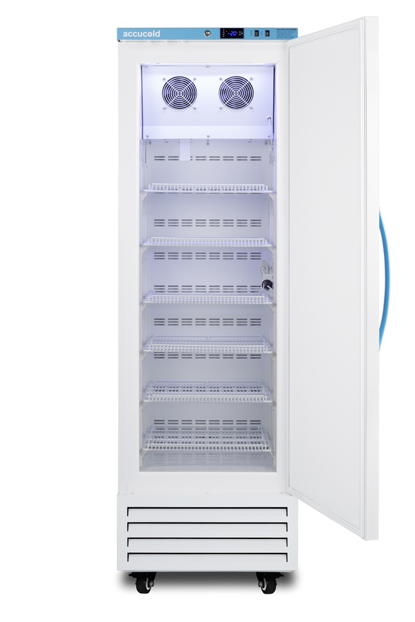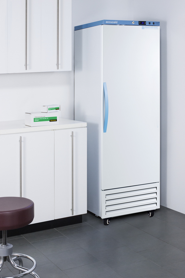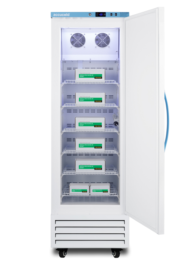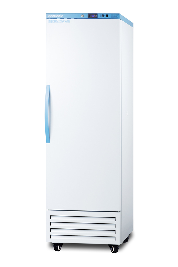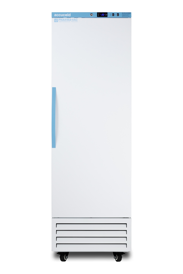 Accucold's Pharma-Vac Performance Series upright freezers are designed and purpose-built for pharmacy, medication, and vaccine applications, supporting compliance with CDC/VFC/VFA guidelines. The AFS14PV is an upright frost-free all-freezer with a temperature range of -30°C to -10°C as recommended for various vaccines and pharmaceuticals. The microprocessor temperature controller is externally located to minimize door openings, helping to protect stored contents from ambient temperature. The buffered temperature probe is encased in a glycol-filled bottle to better simulate the temperature of the stored product, with an additional sensor that reads air temperature to ensure superior temperature control. The current and min/max temperature display is viewable in Celsius or Fahrenheit . The audible and visual temperature alarm sounds if the unit's interior goes out of range. Additional alarms include a power failure alert, door open alarm, and sensor failure alarm. This model is equipped with remote alarm contacts in the rear and a 1/2" probe port on the right side to accept additional monitoring devices. A hospital-grade cord with a 'green dot' plug is also included for added safety in high-traffic areas. Inside, this freezer has 9.53 cu. ft of storage space and features six adjustable plastic-coated wire shelves that can be positioned at 1/2" increments to accommodate virtually any sized item. This unit includes LED internal lighting with an on/off rocker switch. The interior is constructed from white powder-coated metal to ensure added durability and better temperature retention. The AFS14PV comes in a white exterior finish with a blue accented control panel and user-reversible door. The factory-installed antimicrobial handle is powder-coated with naturally occurring silver ions, which help to reduce the spread of germs, allowing for a safer, cleaner user experience. This model includes a factory-installed lock and ships with two keys for staff use. Powerful magnetic gaskets ensure a positive seal. Four pre-installed 4" high casters with brakes make it easier to move as needed. Additional sizes and matching all-refrigerators are also available. Explore the entire Pharma-Vac series at accucold.com NOTE: Accucold freezers are purpose-built to meet the current CDC (Centers for Disease Control) guidelines for the storage of vaccines. For additional temperature assurance, the CDC recommends a calibrated digital data logger (DDL), which can be added with the factory-installed option DL2B or the DL2BKit accessory.