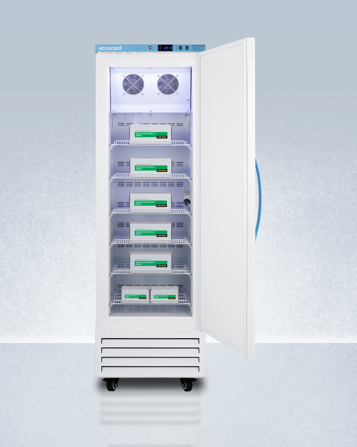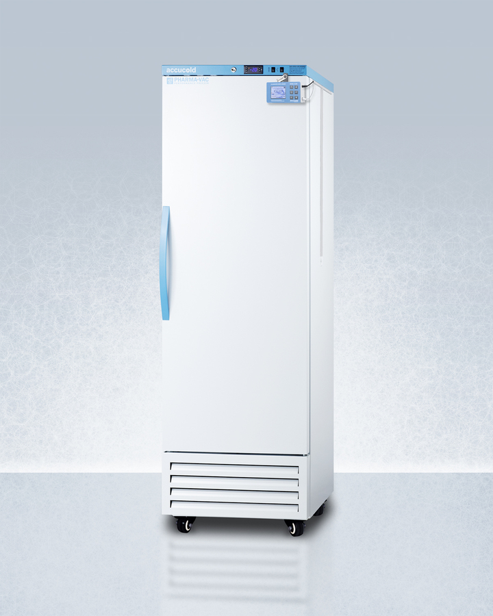Accucold's Pharma-Vac Performance Series upright freezers are designed and purpose-built for pharmacy, medication, and vaccine applications, supporting compliance with CDC/VFC/VFA guidelines. The AFS14PVDL2B is an upright frost-free all-freezer with a temperature range of -30°C to -10°C as recommended for various vaccines and pharmaceuticals. The microprocessor temperature controller is externally located to minimize door openings, helping to protect stored contents from ambient temperature. The buffered temperature probe is encased in a glycol-filled bottle to better simulate the temperature of the stored product, with an additional sensor that reads air temperature to ensure superior temperature control. The current and min/max temperature display is viewable in Celsius or Fahrenheit . The audible and visual temperature alarm sounds if the unit's interior goes out of range. Additional alarms include a power failure alert, door open alarm, and sensor failure alarm. This model is equipped with remote alarm contacts in the rear and a 1/2" probe port on the right side to accept additional monitoring devices. A hospital-grade cord with a 'green dot' plug is also included for added safety in high-traffic areas. We also include our DL2B digital data logger to be mounted to the door, a feature recommended by the CDC, VFC and VFA for vaccine storage. This password-protected DDL is NIST calibrated in our ISO/IEC 17025:2017 accredited laboratory and offers a large LCD display of the current and high/low temperature, recording up to 32,000 data groups to its internal memory or even more on the included 4GB USB flash drive. Data can be viewed through a PC or Mac in Microsoft Excel or any .CSV compatible program. Users can set their own recording intervals starting at increments of 10 seconds to best meet a facility's specific logging needs. We include a 2-year certificate of calibration beginning the date of manufacture. The logger can be re-calibrated in our laboratories after the certificate expires. (For additional information on the DDL, see the DL2BKit listing on our website.) Inside, this freezer has 9.53 cu. ft of storage space and features six adjustable plastic-coated wire shelves that can be positioned at 1/2" increments to accommodate virtually any sized item. This unit includes LED internal lighting with an on/off rocker switch. The interior is constructed from white powder-coated metal to ensure added durability and better temperature retention. The AFS14PVDL2B comes in a white exterior finish with a blue accented control panel. The factory-installed antimicrobial handle is powder-coated with naturally occurring silver ions, which help to reduce the spread of germs, allowing for a safer, cleaner user experience. This model includes a factory-installed lock and ships with two keys for staff use. Powerful magnetic gaskets ensure a positive seal. Four pre-installed 4" high casters with brakes make it easier to move as needed. Additional sizes and matching all-refrigerators are also available. Explore the entire Pharma-Vac series at accucold.com
