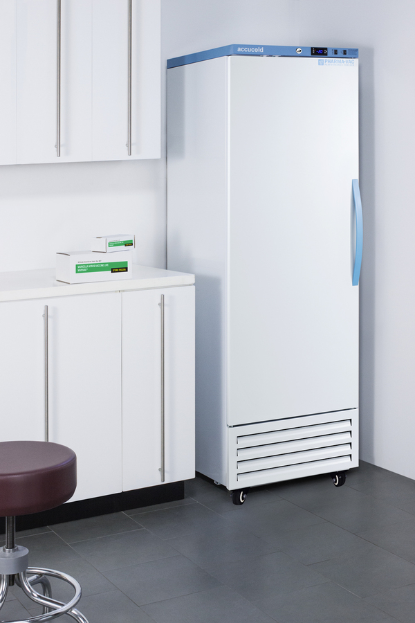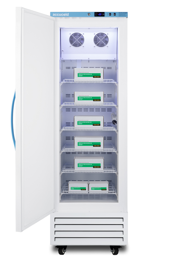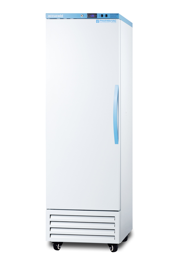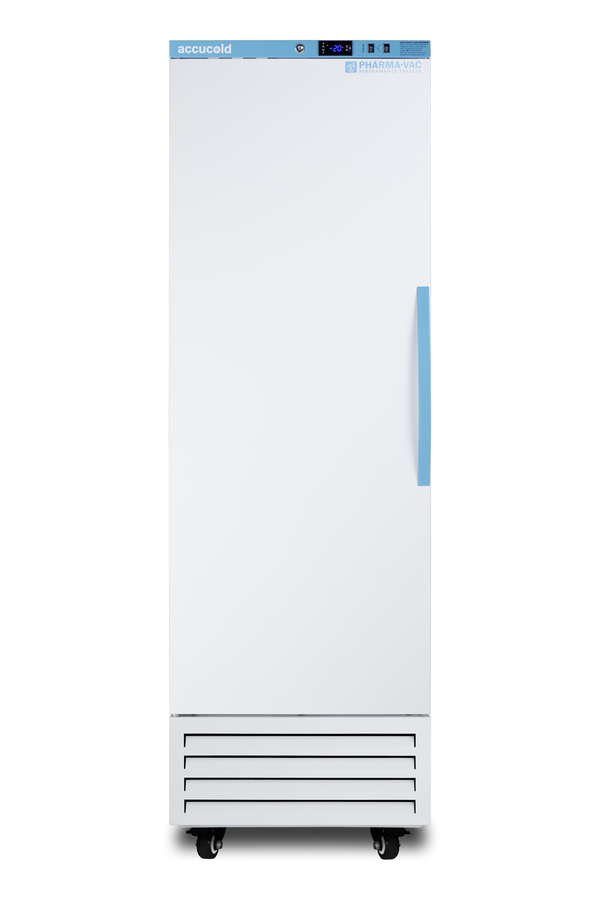 Accucold's Pharma-Vac Performance Series upright freezers are designed and purpose-built for pharmacy, medication, and vaccine applications, supporting compliance with CDC/VFC/VFA guidelines. The AFS14PVLHD is an upright frost-free all-freezer with a temperature range of -30°C to -10°C as recommended for various vaccines and pharmaceuticals. The microprocessor temperature controller is externally located to minimize door openings, helping to protect stored contents from ambient temperature. The buffered temperature probe is encased in a glycol-filled bottle to better simulate the temperature of the stored product, with an additional sensor that reads air temperature to ensure superior temperature control. The current and min/max temperature display is viewable in Celsius or Fahrenheit . The audible and visual temperature alarm sounds if the unit's interior goes out of range. Additional alarms include a power failure alert, door open alarm, and sensor failure alarm. This model is equipped with remote alarm contacts in the rear and a 1/2" probe port on the right side to accept additional monitoring devices. A hospital-grade cord with a 'green dot' plug is also included for added safety in high-traffic areas. Inside, this freezer has 9.53 cu. ft of storage space and features six adjustable plastic-coated wire shelves that can be positioned at 1/2" increments to accommodate virtually any sized item. This unit includes LED internal lighting with an on/off rocker switch. The interior is constructed from white powder-coated metal to ensure added durability and better temperature retention. The AFS14PVLHD comes in a white exterior finish with a blue accented control panel and a left hand door swing. The factory-installed antimicrobial handle is powder-coated with naturally occurring silver ions, which help to reduce the spread of germs, allowing for a safer, cleaner user experience. This model includes a factory-installed lock and ships with two keys for staff use. Powerful magnetic gaskets ensure a positive seal. Four pre-installed 4" high casters with brakes make it easier to move as needed. Additional sizes and matching all-refrigerators are also available. Explore the entire Pharma-Vac series at accucold.com NOTE: Accucold freezers are purpose-built to meet the current CDC (Centers for Disease Control) guidelines for the storage of vaccines. For additional temperature assurance, the CDC recommends a calibrated digital data logger (DDL), which can be added with the factory-installed option DL2B or the DL2BKit accessory.