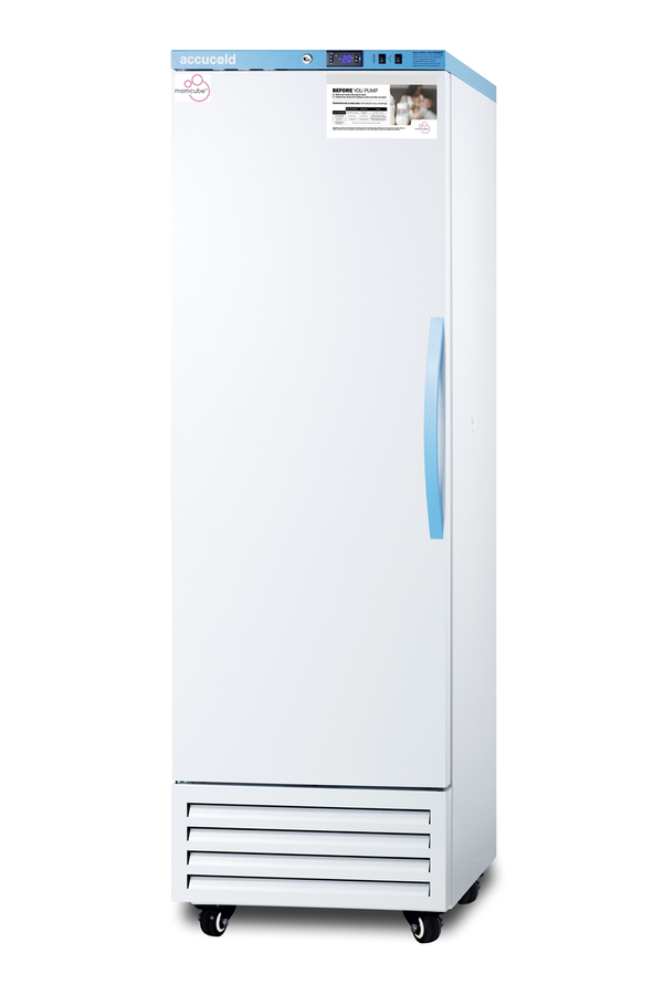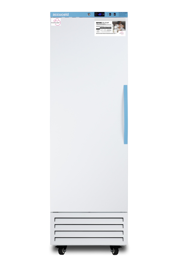 Accucold's MOMCUBE freezers are designed and purpose-built for breast milk storage. All MOMCUBE® units are laboratory-tested to maintain proper breast milk temperature, as recommended by the CDC and ideal for maternity wards, hospitals, NICUs, employee wellness rooms complying with Section 4207 of the Patient Protection and Affordable Care Act, and other facilities. The AFS14PVMCLHD is an upright frost-free all-freezer with a temperature range of -30°C to -10°C. The microprocessor temperature controller is externally located to minimize door openings, helping to protect stored contents from ambient temperature. The buffered temperature probe is encased in a glycol-filled bottle to better simulate the temperature of the stored product, with an additional sensor that reads air temperature to ensure superior temperature control. The current and min/max temperature display is viewable in Celsius or Fahrenheit . The audible and visual temperature alarm sounds if the unit's interior goes out of range. Additional alarms include a power failure alert, door open alarm, and sensor failure alarm. This model is equipped with remote alarm contacts in the rear and a 1/2" probe port on the right side to accept additional monitoring devices. A hospital-grade cord with a 'green dot' plug is also included for added safety in high-traffic areas. Inside, this freezer has 9.53 cu. ft of storage space and features six adjustable plastic-coated wire shelves that can be positioned at 1/2" increments to accommodate virtually any sized item. This unit includes LED internal lighting with an on/off rocker switch. The interior is constructed from white powder-coated metal to ensure added durability and better temperature retention. The AFS14PVMCLHD comes in a white exterior finish with a blue accented control panel. The factory-installed antimicrobial handle is powder-coated with naturally occurring silver ions, which help to reduce the spread of germs, allowing for a safer, cleaner user experience. This model includes a factory-installed lock and ships with two keys for staff use. Powerful magnetic gaskets ensure a positive seal. Four pre-installed 4" high casters with brakes make it easier to move as needed. Designed with hydrocarbon refrigerant, all Accucold Performance Series MOMCUBE freezers provide an energy efficient solution to breast milk storage. Additional sizes, as well as matching refrigerators, are also available. Explore the full MOMCUBE series at accucold.com/momcube.