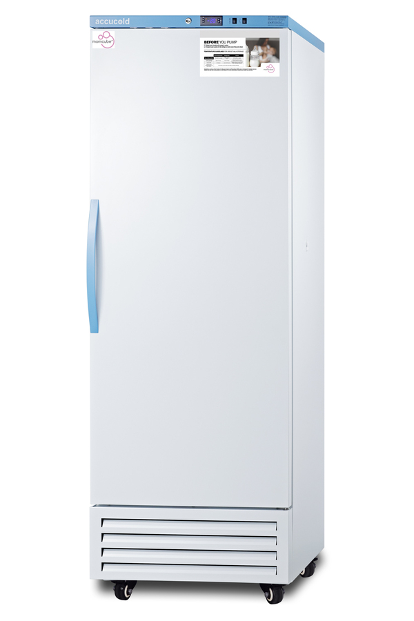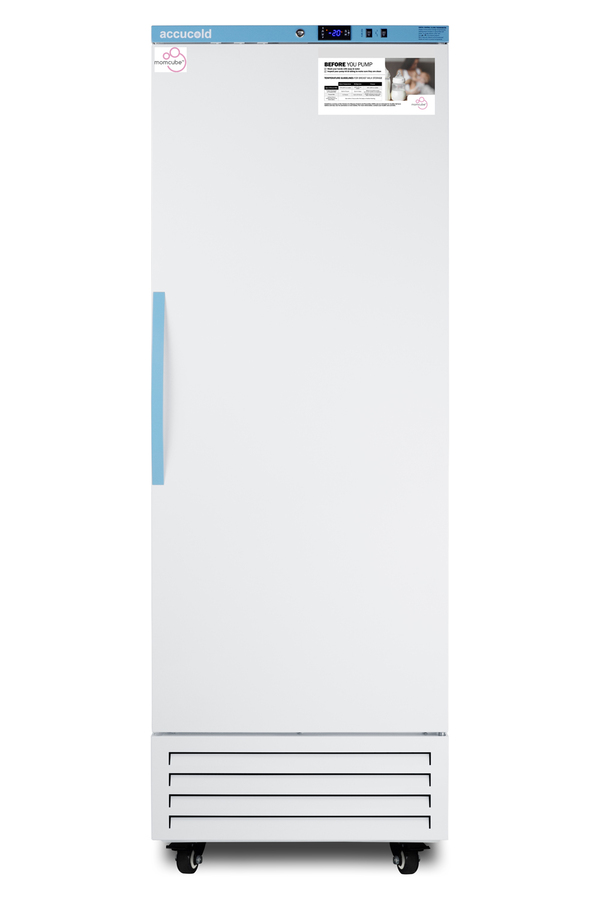 Accucold's MOMCUBE freezers are designed and purpose-built for breast milk storage. All MOMCUBE® units are laboratory-tested to maintain proper breast milk temperature, as recommended by the CDC and ideal for maternity wards, hospitals, NICUs, employee wellness rooms complying with Section 4207 of the Patient Protection and Affordable Care Act, and other facilities. The AFS17PVMC is an upright frost-free all-freezer with a temperature range of -30°C to -10°C. The microprocessor temperature controller is externally located to minimize door openings, helping to protect stored contents from ambient temperature. The buffered temperature probe is encased in a glycol-filled bottle to better simulate the temperature of the stored product, with an additional sensor that reads air temperature to ensure superior temperature control. The current and min/max temperature display is viewable in Celsius or Fahrenheit . The audible and visual temperature alarm sounds if the unit's interior goes out of range. Additional alarms include a power failure alert, door open alarm, and sensor failure alarm. This model is equipped with remote alarm contacts in the rear and a 1/2" probe port on the right side to accept additional monitoring devices. A hospital-grade cord with a 'green dot' plug is also included for added safety in high-traffic areas. Inside, this freezer has 14.83 cu. ft of storage space and features six adjustable plastic-coated wire shelves that can be positioned at 1/2" increments to accommodate virtually any sized item. This unit includes LED internal lighting with an on/off rocker switch. The interior is constructed from white powder-coated metal to ensure added durability and better temperature retention. The AFS17PVMC comes in a white exterior finish with a blue accented control panel and user-reversible door. The factory-installed antimicrobial handle is powder-coated with naturally occurring silver ions, which help to reduce the spread of germs, allowing for a safer, cleaner user experience. This model includes a factory-installed lock and ships with two keys for staff use. Powerful magnetic gaskets ensure a positive seal. Four pre-installed 4" high casters with brakes make it easier to move as needed. Designed with hydrocarbon refrigerant, all Accucold Performance Series MOMCUBE freezers provide an energy efficient solution to breast milk storage. Additional sizes, as well as matching refrigerators, are also available. Explore the full MOMCUBE series at accucold.com/momcube.
