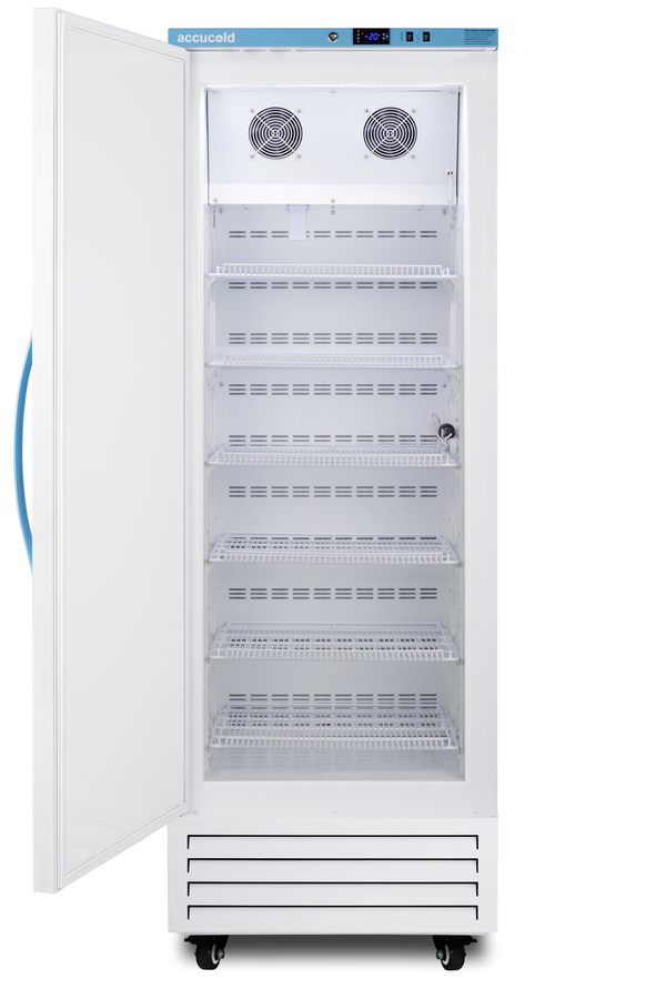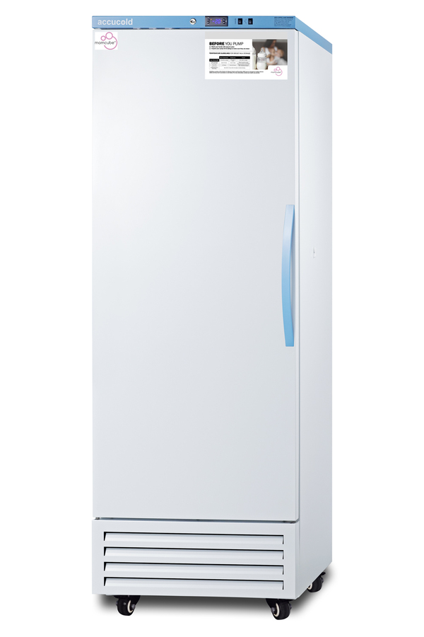Accucold's MOMCUBE freezers are designed and purpose-built for breast milk storage. All MOMCUBE® units are laboratory-tested to maintain proper breast milk temperature, as recommended by the CDC and ideal for maternity wards, hospitals, NICUs, employee wellness rooms complying with Section 4207 of the Patient Protection and Affordable Care Act, and other facilities. The AFS17PVMCLHD is an upright frost-free all-freezer with a temperature range of -30°C to -10°C. The microprocessor temperature controller is externally located to minimize door openings, helping to protect stored contents from ambient temperature. The buffered temperature probe is encased in a glycol-filled bottle to better simulate the temperature of the stored product, with an additional sensor that reads air temperature to ensure superior temperature control. The current and min/max temperature display is viewable in Celsius or Fahrenheit . The audible and visual temperature alarm sounds if the unit's interior goes out of range. Additional alarms include a power failure alert, door open alarm, and sensor failure alarm. This model is equipped with remote alarm contacts in the rear and a 1/2" probe port on the right side to accept additional monitoring devices. A hospital-grade cord with a 'green dot' plug is also included for added safety in high-traffic areas. Inside, this freezer has 14.83 cu. ft of storage space and features six adjustable plastic-coated wire shelves that can be positioned at 1/2" increments to accommodate virtually any sized item. This unit includes LED internal lighting with an on/off rocker switch. The interior is constructed from white powder-coated metal to ensure added durability and better temperature retention. The AFS17PVMCLHD comes in a white exterior finish with a blue accented control panel. The factory-installed antimicrobial handle is powder-coated with naturally occurring silver ions, which help to reduce the spread of germs, allowing for a safer, cleaner user experience. This model includes a factory-installed lock and ships with two keys for staff use. Powerful magnetic gaskets ensure a positive seal. Four pre-installed 4" high casters with brakes make it easier to move as needed. Designed with hydrocarbon refrigerant, all Accucold Performance Series MOMCUBE freezers provide an energy efficient solution to breast milk storage. Additional sizes, as well as matching refrigerators, are also available. Explore the full MOMCUBE series at accucold.com/momcube.