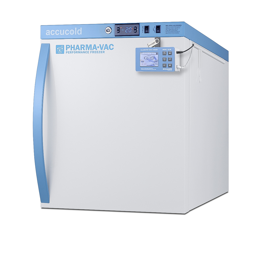 Accucold's Pharma-Vac Performance Series are upright freezers are designed and purpose-built for pharmacy, medication, and vaccine applications to support meeting CDC/VFC/VFA guidelines. The AFZ1PVDL2B is a 1.4 cu.ft. all-freezer with a temperature range of -30°C to -10°C as recommended for a variety of vaccines and pharmaceuticals. The microprocessor temperature controller is externally located to minimize door openings, helping to protect stored contents from ambient temperature. The buffered temperature probe is encased in a glycol-filled bottle to better simulate temperature of the stored product, with an additional sensor that reads air temperature to ensure superior temperature control. The current and min/max temperature display is viewable in Celsius or Fahrenheit to the nearest tenth of a degree. The audible and visual temperature alarm sounds if the unit's interior goes out of range. Additional alarms include a power failure alert, door open alarm, and sensor failure alarm. This model is equipped with remote alarm contacts in the rear and a 1/2" probe port on the right side to accept additional monitoring devices. A hospital grade cord with 'green dot' plug is also included for added safety in high traffic areas. We also include our DL2B digital data logger to be mounted to the door, a feature recommended by the CDC, VFC and VFA for vaccine storage. This password-protected DDL is NIST calibrated in our ISO/IEC 17025:2017 accredited laboratory and offers a large LCD display of the current and high/low temperature, recording up to 32,000 data groups to its internal memory or even more on the included 4GB USB flash drive. Data can be viewed through a PC or Mac in Microsoft Excel or any .CSV compatible program. Users can set their own recording intervals starting at increments of 10 seconds to best meet a facility's specific logging needs. We include a 2-year certificate of calibration beginning the date of manufacture. The logger can be re-calibrated in our laboratories after the certificate expires. (For additional information on the DDL, see the DL2BKit listing on our website.) Inside, this freezer features adjustable plastic-coated wire shelves that can be positioned at 1/2" increments to accommodate virtually any sized item. This unit includes LED internal lighting with an on/off rocker switch. The interior is constructed from white powder coated metal to ensure added durability and better temperature retention. Static manual defrost cooling helps to ensure stable temperature conditions. The AFZ1PVDL2B comes in a white cabinet finish with a blue accented control panel. The factory-installed antimicrobial handle is powder-coated with naturally occurring silver ions, which help to reduce the spread of germs, allowing for a safer, cleaner user experience. The door ships with a right hand swing (for a left hand version, add option "LHD"). The self-closing function helps to protect stored contents in busy facilities while a factory-installed lock provides security as needed. Two keys are included for staff use. Powerful magnetic gaskets ensure a positive seal. Designed with hydrocarbon refrigerant, Accucold Performance series freezers provide an energy efficient solution to vaccine storage. This unit is Pyxis, Omnicell, and AcuDose RX compatible. Additional sizes, as well as matching refrigerators, are also available. Explore the full Pharma-Vac series at accucold.com/pharmavac. NOTE: Accucold freezers are purpose-built to the support meeting the current CDC (Centers for Disease Control) guidelines for the storage of vaccines. As referenced in the current Vaccine Storage and Handling Toolkit, these units incorporate microprocessor controls, as well as a calibrated digital data logger (DDL) to display the current and high/low temperature.