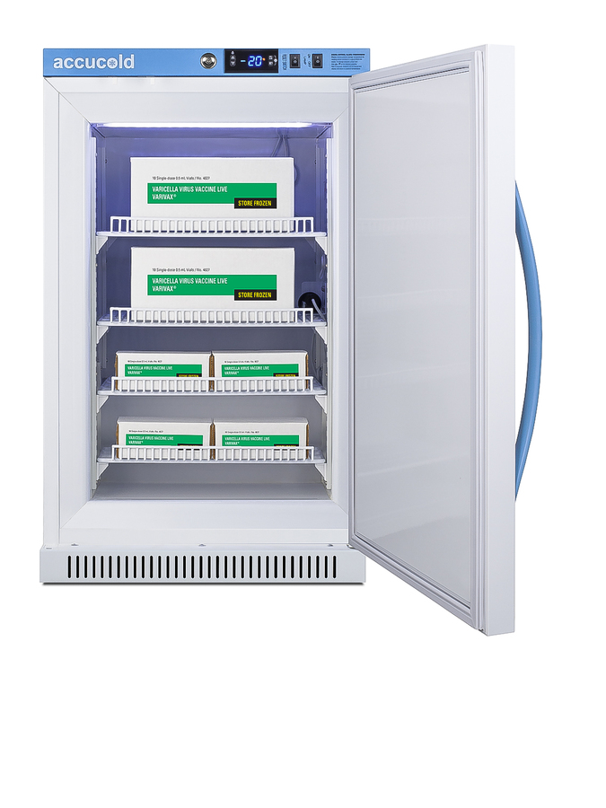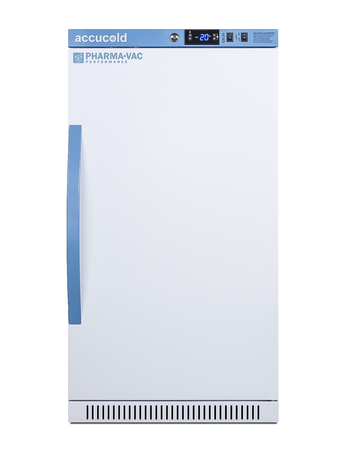 Accucold's Pharma-Vac Performance Series are upright freezers are designed and purpose-built for pharmacy, medication, and vaccine applications to support meeting CDC/VFC/VFA guidelines. The AFZ2PVBIADA is a 2.47 cu.ft. all-freezer with a temperature range of -30°C to -10°C as recommended for a variety of vaccines and pharmaceuticals. It is designed for freestanding or recessed installation and sized just under 32" high to fit under lower counters complying with ADA guidelines for accessibility. The microprocessor temperature controller is externally located to minimize door openings, helping to protect stored contents from ambient temperature. The buffered temperature probe is encased in a glycol-filled bottle to better simulate temperature of the stored product, with an additional sensor that reads air temperature to ensure superior temperature control. The current and min/max temperature display is viewable in Celsius or Fahrenheit to the nearest tenth of a degree. The audible and visual temperature alarm sounds if the unit's interior goes out of range. Additional alarms include a power failure alert, door open alarm, and sensor failure alarm. This model is equipped with remote alarm contacts in the rear and a 1/2" probe port on the right side to accept additional monitoring devices. A hospital grade cord with 'green dot' plug is also included for added safety in high traffic areas. Inside, this freezer features adjustable plastic-coated wire shelves that can be positioned at 1/2" increments to accommodate virtually any sized item. This unit includes LED internal lighting with an on/off rocker switch. The interior is constructed from white powder coated metal to ensure added durability and better temperature retention. Static manual defrost cooling helps to ensure stable temperature conditions. The AFZ2PVBIADA comes in a white cabinet finish with a blue accented control panel. The factory-installed antimicrobial handle is powder-coated with naturally occurring silver ions, which help to reduce the spread of germs, allowing for a safer, cleaner user experience. The user-reversible door ships with a right hand swing and self-closing function, while a factory-installed lock provides security as needed, with two keys for staff use. Powerful magnetic gaskets ensure a positive seal. Designed with hydrocarbon refrigerant, Accucold Performance series freezers provide an energy efficient solution to vaccine storage. This unit is Pyxis, Omnicell, and AcuDose RX compatible. Additional sizes, as well as matching refrigerators, are also available. Explore the full Pharma-Vac series at accucold.com/pharmavac. NOTE: Accucold freezers are purpose-built to the support meeting the current CDC (Centers for Disease Control) guidelines for the storage of vaccines. For additional temperature assurance, the CDC recommends a calibrated digital data logger (DDL), which can be added with the factory-installed option DL2B or addition of the DL2BKit accessory.
