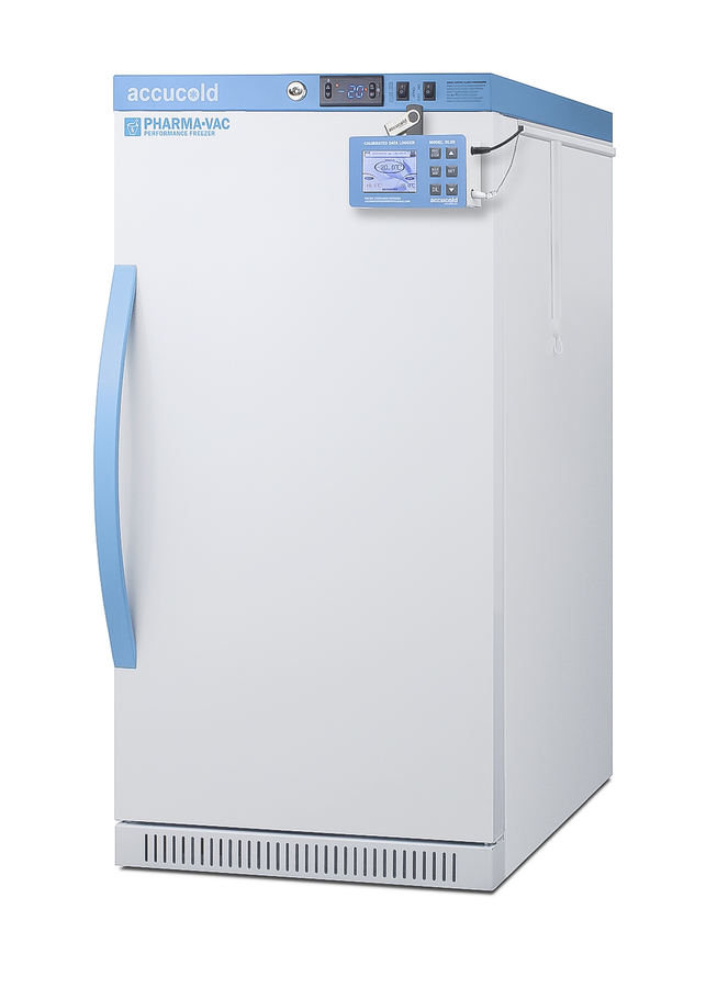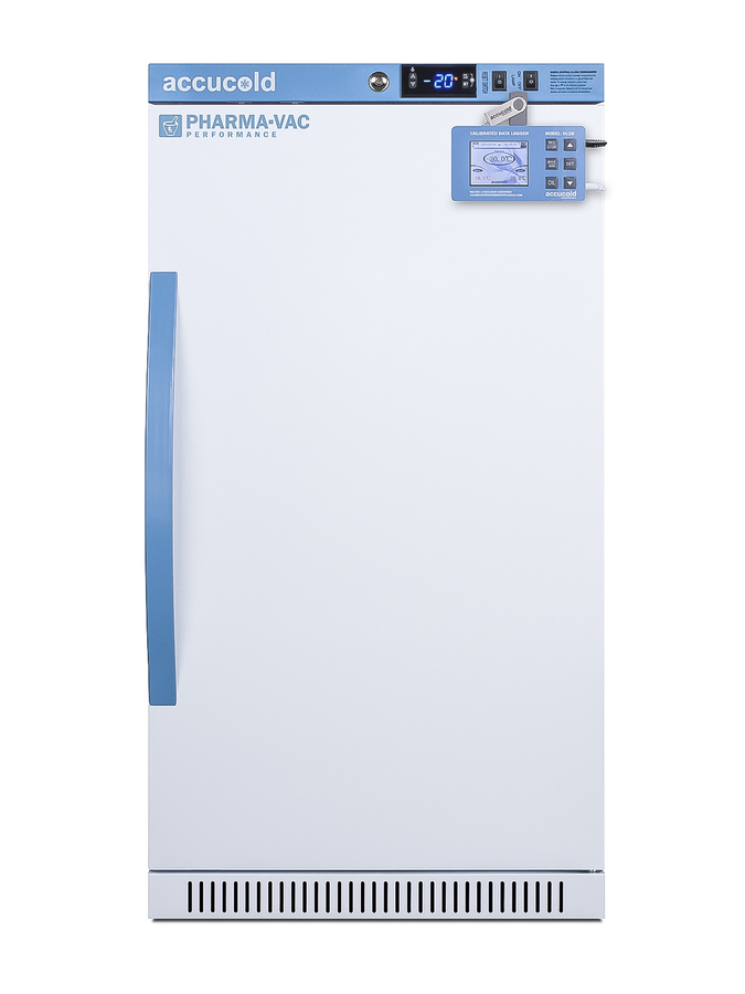 Accucold's Pharma-Vac Performance Series are upright freezers are designed and purpose-built for pharmacy, medication, and vaccine applications to support meeting CDC/VFC/VFA guidelines. The AFZ2PVBIADADL2B is a 2.47 cu.ft. all-freezer with a temperature range of -30°C to -10°C as recommended for a variety of vaccines and pharmaceuticals. It is designed for freestanding or recessed installation and sized just under 32" high to fit under lower counters complying with ADA guidelines for accessibility. The microprocessor temperature controller is externally located to minimize door openings, helping to protect stored contents from ambient temperature. The buffered temperature probe is encased in a glycol-filled bottle to better simulate temperature of the stored product, with an additional sensor that reads air temperature to ensure superior temperature control. The current and min/max temperature display is viewable in Celsius or Fahrenheit to the nearest tenth of a degree. The audible and visual temperature alarm sounds if the unit's interior goes out of range. Additional alarms include a power failure alert, door open alarm, and sensor failure alarm. This model is equipped with remote alarm contacts in the rear and a 1/2" probe port on the right side to accept additional monitoring devices. A hospital grade cord with 'green dot' plug is also included for added safety in high traffic areas. We also include our DL2B digital data logger to be mounted to the door, a feature recommended by the CDC, VFC and VFA for vaccine storage. This password-protected DDL is NIST calibrated in our ISO/IEC 17025:2017 accredited laboratory and offers a large LCD display of the current and high/low temperature, recording up to 32,000 data groups to its internal memory or even more on the included 4GB USB flash drive. Data can be viewed through a PC or Mac in Microsoft Excel or any .CSV compatible program. Users can set their own recording intervals starting at increments of 10 seconds to best meet a facility's specific logging needs. We include a 2-year certificate of calibration beginning the date of manufacture. The logger can be re-calibrated in our laboratories after the certificate expires. (For additional information on the DDL, see the DL2BKit listing on our website.) Inside, this freezer features adjustable plastic-coated wire shelves that can be positioned at 1/2" increments to accommodate virtually any sized item. This unit includes LED internal lighting with an on/off rocker switch. The interior is constructed from white powder coated metal to ensure added durability and better temperature retention. Static manual defrost cooling helps to ensure stable temperature conditions. The AFZ2PVBIADADL2B comes in a white cabinet finish with a blue accented control panel. The factory-installed antimicrobial handle is powder-coated with naturally occurring silver ions, which help to reduce the spread of germs, allowing for a safer, cleaner user experience. The user-reversible door ships with a right hand swing and self-closing function, while a factory-installed lock provides security as needed, with two keys for staff use. Powerful magnetic gaskets ensure a positive seal. Designed with hydrocarbon refrigerant, Accucold Performance series freezers provide an energy efficient solution to vaccine storage. This unit is Pyxis, Omnicell, and AcuDose RX compatible. Additional sizes, as well as matching refrigerators, are also available. Explore the full Pharma-Vac series at accucold.com/pharmavac. NOTE: Accucold freezers are purpose-built to the support meeting the current CDC (Centers for Disease Control) guidelines for the storage of vaccines. As referenced in the current Vaccine Storage and Handling Toolkit, these units incorporate microprocessor controls, as well as a calibrated digital data logger (DDL) to display the current and high/low temperature.