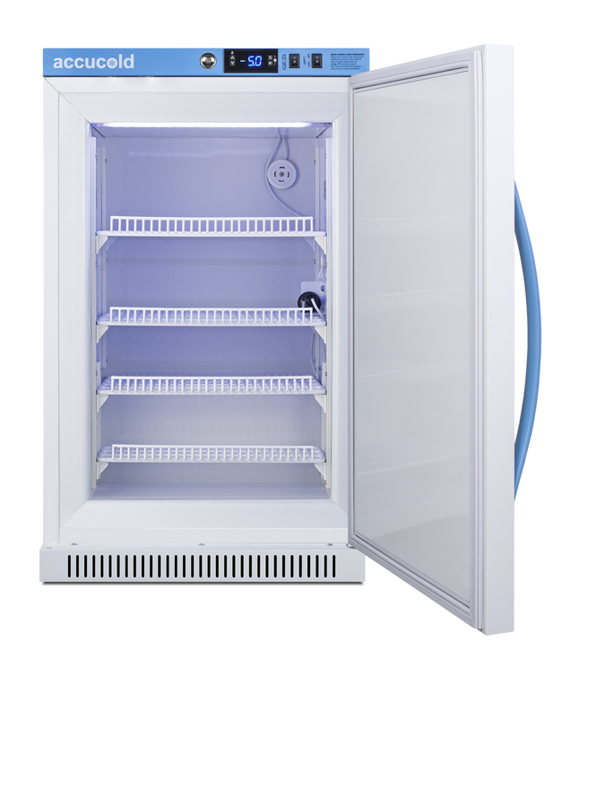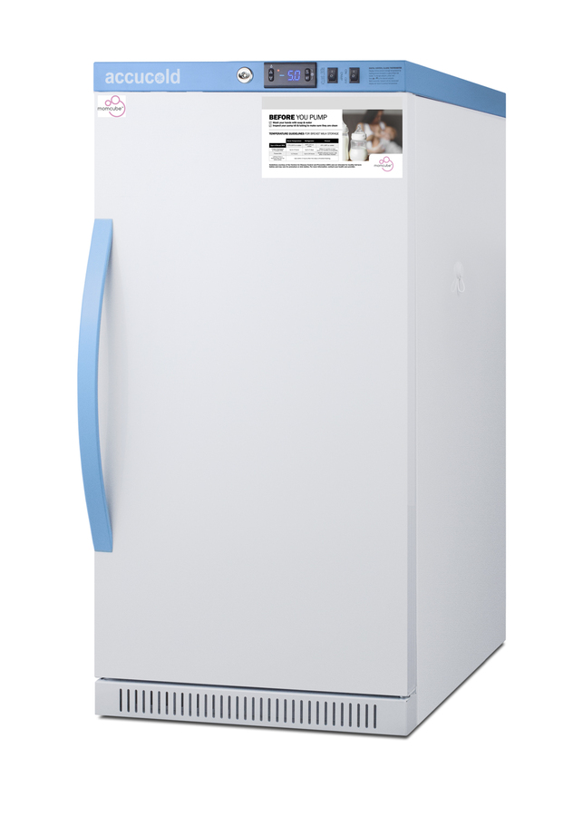 Accucold's MOMCUBE freezers are designed and purpose-built for breast milk storage. All MOMCUBE® units are laboratory-tested to maintain proper breast milk temperature, as recommended by the CDC and ideal for maternity wards, hospitals, NICUs, employee wellness rooms complying with Section 4207 of the Patient Protection and Affordable Care Act, and other facilities. The AFZ2PVBIADAMC is a 2.47 cu.ft. all-freezer with a temperature range of -18°F to -4°F as recommended for the long-term storage of human milk. The microprocessor temperature controller is externally located to minimize door openings, helping to protect stored contents from ambient temperature. The buffered temperature probe is encased in a glycol-filled bottle to better simulate temperature of the stored milk product, with an additional sensor that reads air temperature to ensure superior temperature control. The current and min/max temperature display is viewable in Celsius or Fahrenheit to the nearest tenth of a degree. The audible and visual temperature alarm sounds if the unit's interior goes out of range. Additional alarms include a power failure alert, door open alarm, and sensor failure alarm. This model is equipped with remote alarm contacts in the rear and a 1/2" probe port on the right side to accept additional monitoring devices. A hospital grade cord with 'green dot' plug is also included for added safety in high traffic areas. Inside, this freezer features adjustable plastic-coated wire shelves that can be positioned at 1/2" increments to accommodate virtually any sized item. This unit includes LED internal lighting with an on/off rocker switch. The interior is constructed from white powder coated metal to ensure added durability and better temperature retention. Static manual defrost cooling helps to ensure stable temperature conditions. The AFZ2PVBIADAMC comes in a white cabinet finish with a blue accented control panel. The factory-installed antimicrobial handle is powder-coated with naturally occurring silver ions, which help to reduce the spread of germs, allowing for a safer, cleaner user experience. The user-reversible door ships with a right hand swing and self-closing function, while a factory-installed lock provides security as needed, with two keys for staff use. Powerful magnetic gaskets ensure a positive seal. Designed with hydrocarbon refrigerant, all Accucold Performance Series MOMCUBE freezers provide an energy efficient solution to breast milk storage. Additional sizes, as well as matching refrigerators, are also available. Explore the full Pharma-Vac series at accucold.com/momcube.