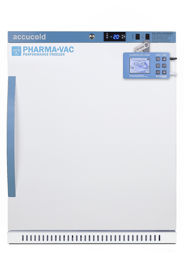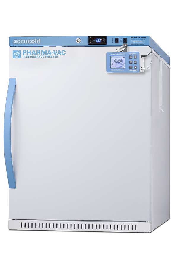 Accucold's Pharma-Vac Performance Series are upright freezers are designed and purpose-built for pharmacy, medication, and vaccine applications to support meeting CDC/VFC/VFA guidelines. The AFZ5PVBIADADL2B is a 3.88 cu.ft. all-freezer with a temperature range of -30°C to -10°C as recommended for a variety of vaccines and pharmaceuticals. It is designed for freestanding or recessed installation and sized just under 32" high to fit under lower counters complying with ADA guidelines for accessibility. The microprocessor temperature controller is externally located to minimize door openings, helping to protect stored contents from ambient temperature. The buffered temperature probe is encased in a glycol-filled bottle to better simulate temperature of the stored product, with an additional sensor that reads air temperature to ensure superior temperature control. The current and min/max temperature display is viewable in Celsius or Fahrenheit to the nearest tenth of a degree. The audible and visual temperature alarm sounds if the unit's interior goes out of range. Additional alarms include a power failure alert, door open alarm, and sensor failure alarm. This model is equipped with remote alarm contacts in the rear and a 1/2" probe port on the right side to accept additional monitoring devices. A hospital grade cord with 'green dot' plug is also included for added safety in high traffic areas. We also include our DL2B digital data logger to be mounted to the door, a feature recommended by the CDC, VFC and VFA for vaccine storage. This password-protected DDL is NIST calibrated in our ISO/IEC 17025:2017 accredited laboratory and offers a large LCD display of the current and high/low temperature, recording up to 32,000 data groups to its internal memory or even more on the included 4GB USB flash drive. Data can be viewed through a PC or Mac in Microsoft Excel or any .CSV compatible program. Users can set their own recording intervals starting at increments of 10 seconds to best meet a facility's specific logging needs. We include a 2-year certificate of calibration beginning the date of manufacture. The logger can be re-calibrated in our laboratories after the certificate expires. (For additional information on the DDL, see the DL2BKit listing on our website.) Inside, this freezer features adjustable plastic-coated wire shelves that can be positioned at 1/2" increments to accommodate virtually any sized item. This unit includes LED internal lighting with an on/off rocker switch. The interior is constructed from white powder coated metal to ensure added durability and better temperature retention. Static manual defrost cooling helps to ensure stable temperature conditions. The AFZ5PVBIADADL2B comes in a white cabinet finish with a blue accented control panel. The factory-installed antimicrobial handle is powder-coated with naturally occurring silver ions, which help to reduce the spread of germs, allowing for a safer, cleaner user experience. The door ships with a right hand swing and self-closing function, while a factory-installed lock provides security as needed, with two keys for staff use. Powerful magnetic gaskets ensure a positive seal. Designed with hydrocarbon refrigerant, Accucold Performance series freezers provide an energy efficient solution to vaccine storage. This unit is Pyxis, Omnicell, and AcuDose RX compatible. Additional sizes, as well as matching refrigerators, are also available. Explore the full Pharma-Vac series at accucold.com/pharmavac. NOTE: Accucold freezers are purpose-built to the support meeting the current CDC (Centers for Disease Control) guidelines for the storage of vaccines. As referenced in the current Vaccine Storage and Handling Toolkit, these units incorporate microprocessor controls, as well as a calibrated digital data logger (DDL) to display the current and high/low temperature.
