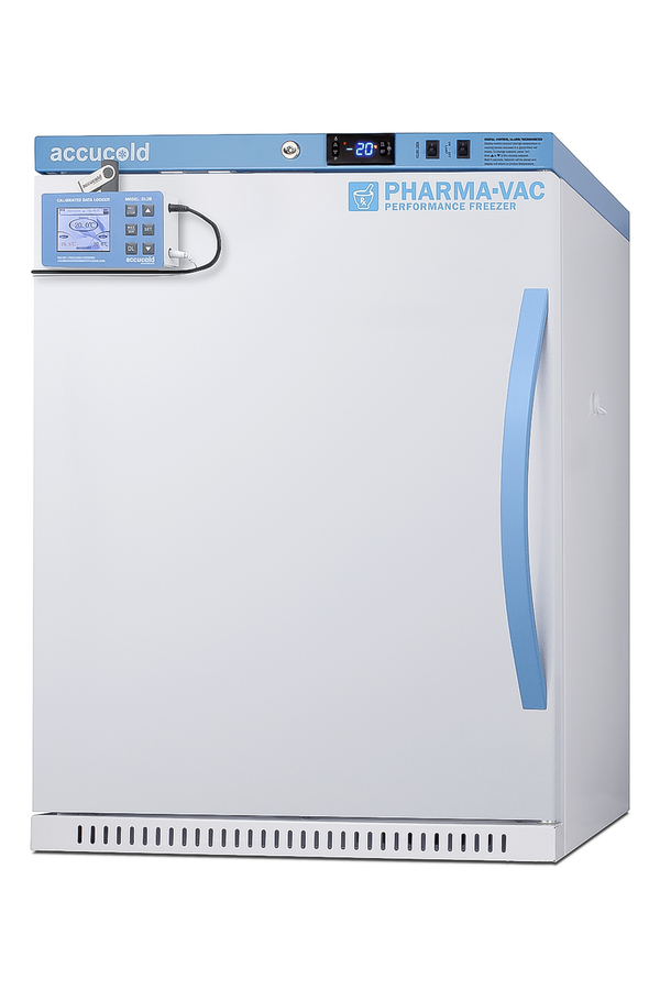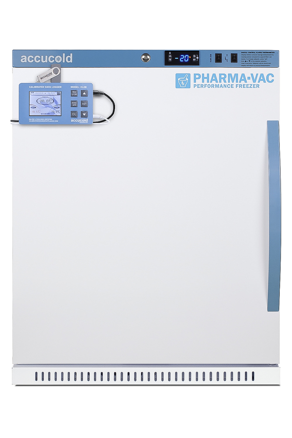 Accucold's Pharma-Vac Performance Series are upright freezers are designed and purpose-built for pharmacy, medication, and vaccine applications to support meeting CDC/VFC/VFA guidelines. The AFZ5PVBIADADL2BLHD is a 3.88 cu.ft. all-freezer with a temperature range of -30°C to -10°C as recommended for a variety of vaccines and pharmaceuticals. It is designed for freestanding or recessed installation and sized just under 32" high to fit under lower counters complying with ADA guidelines for accessibility. The microprocessor temperature controller is externally located to minimize door openings, helping to protect stored contents from ambient temperature. The buffered temperature probe is encased in a glycol-filled bottle to better simulate temperature of the stored product, with an additional sensor that reads air temperature to ensure superior temperature control. The current and min/max temperature display is viewable in Celsius or Fahrenheit to the nearest tenth of a degree. The audible and visual temperature alarm sounds if the unit's interior goes out of range. Additional alarms include a power failure alert, door open alarm, and sensor failure alarm. This model is equipped with remote alarm contacts in the rear and a 1/2" probe port on the right side to accept additional monitoring devices. A hospital grade cord with 'green dot' plug is also included for added safety in high traffic areas. We also include our DL2B digital data logger to be mounted to the door, a feature recommended by the CDC, VFC and VFA for vaccine storage. This password-protected DDL is NIST calibrated in our ISO/IEC 17025:2017 accredited laboratory and offers a large LCD display of the current and high/low temperature, recording up to 32,000 data groups to its internal memory or even more on the included 4GB USB flash drive. Data can be viewed through a PC or Mac in Microsoft Excel or any .CSV compatible program. Users can set their own recording intervals starting at increments of 10 seconds to best meet a facility's specific logging needs. We include a 2-year certificate of calibration beginning the date of manufacture. The logger can be re-calibrated in our laboratories after the certificate expires. (For additional information on the DDL, see the DL2BKit listing on our website.) Inside, this freezer features adjustable plastic-coated wire shelves that can be positioned at 1/2" increments to accommodate virtually any sized item. This unit includes LED internal lighting with an on/off rocker switch. The interior is constructed from white powder coated metal to ensure added durability and better temperature retention. Static manual defrost cooling helps to ensure stable temperature conditions. The AFZ5PVBIADADL2BLHD comes in a white cabinet finish with a blue accented control panel. The factory-installed antimicrobial handle is powder-coated with naturally occurring silver ions, which help to reduce the spread of germs, allowing for a safer, cleaner user experience. The door ships with a left hand swing and self-closing function, while a factory-installed lock provides security as needed, with two keys for staff use. Powerful magnetic gaskets ensure a positive seal. Designed with hydrocarbon refrigerant, Accucold Performance series freezers provide an energy efficient solution to vaccine storage. This unit is Pyxis, Omnicell, and AcuDose RX compatible. Additional sizes, as well as matching refrigerators, are also available. Explore the full Pharma-Vac series at accucold.com/pharmavac. NOTE: Accucold freezers are purpose-built to the support meeting the current CDC (Centers for Disease Control) guidelines for the storage of vaccines. As referenced in the current Vaccine Storage and Handling Toolkit, these units incorporate microprocessor controls, as well as a calibrated digital data logger (DDL) to display the current and high/low temperature.