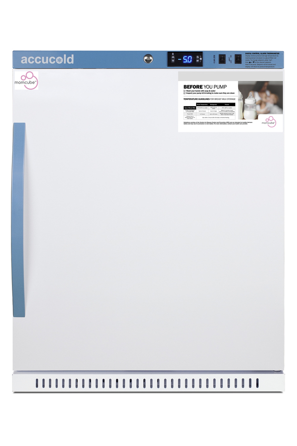 Accucold's MOMCUBE freezers are designed and purpose-built for breast milk storage. All MOMCUBE® units are laboratory-tested to maintain proper breast milk temperature, as recommended by the CDC and ideal for maternity wards, hospitals, NICUs, employee wellness rooms complying with Section 4207 of the Patient Protection and Affordable Care Act, and other facilities. The AFZ5PVBIADAMC is a 4 cu.ft. all-freezer with a temperature range of -18°F to -4°F as recommended for the long-term storage of human milk. The microprocessor temperature controller is externally located to minimize door openings, helping to protect stored contents from ambient temperature. The buffered temperature probe is encased in a glycol-filled bottle to better simulate temperature of the stored milk product, with an additional sensor that reads air temperature to ensure superior temperature control. The current and min/max temperature display is viewable in Celsius or Fahrenheit to the nearest tenth of a degree. The audible and visual temperature alarm sounds if the unit's interior goes out of range. Additional alarms include a power failure alert, door open alarm, and sensor failure alarm. This model is equipped with remote alarm contacts in the rear and a 1/2" probe port on the right side to accept additional monitoring devices. A hospital grade cord with 'green dot' plug is also included for added safety in high traffic areas. Inside, this freezer features adjustable plastic-coated wire shelves that can be positioned at 1/2" increments to accommodate virtually any sized item. This unit includes LED internal lighting with an on/off rocker switch. The interior is constructed from white powder coated metal to ensure added durability and better temperature retention. Static manual defrost cooling helps to ensure stable temperature conditions. The AFZ5PVBIADAMC comes in a white cabinet finish with a blue accented control panel. The factory-installed antimicrobial handle is powder-coated with naturally occurring silver ions, which help to reduce the spread of germs, allowing for a safer, cleaner user experience. The user-reversible door ships with a right hand swing and self-closing function, while a factory-installed lock provides security as needed, with two keys for staff use. Powerful magnetic gaskets ensure a positive seal. Designed with hydrocarbon refrigerant, all Accucold Performance Series MOMCUBE freezers provide an energy efficient solution to breast milk storage. Additional sizes, as well as matching refrigerators, are also available. Explore the full Pharma-Vac series at accucold.com/momcube.