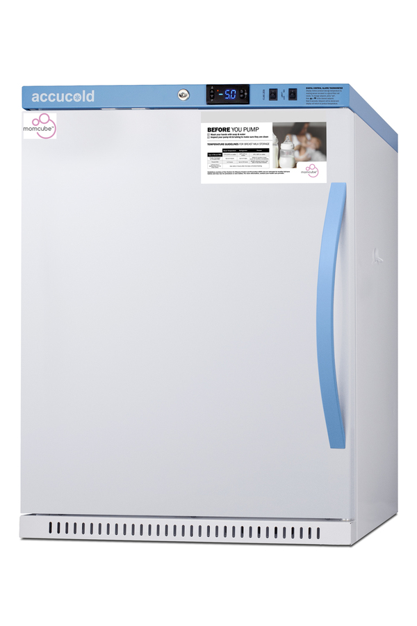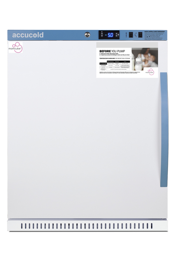 Accucold's MOMCUBE freezers are designed and purpose-built for breast milk storage. All MOMCUBE® units are laboratory-tested to maintain proper breast milk temperature, as recommended by the CDC and ideal for maternity wards, hospitals, NICUs, employee wellness rooms complying with Section 4207 of the Patient Protection and Affordable Care Act, and other facilities. The AFZ5PVBIADAMCLHD is a 4 cu.ft. all-freezer with a temperature range of -18°F to -4°F as recommended for the long-term storage of human milk. The microprocessor temperature controller is externally located to minimize door openings, helping to protect stored contents from ambient temperature. The buffered temperature probe is encased in a glycol-filled bottle to better simulate temperature of the stored milk product, with an additional sensor that reads air temperature to ensure superior temperature control. The current and min/max temperature display is viewable in Celsius or Fahrenheit to the nearest tenth of a degree. The audible and visual temperature alarm sounds if the unit's interior goes out of range. Additional alarms include a power failure alert, door open alarm, and sensor failure alarm. This model is equipped with remote alarm contacts in the rear and a 1/2" probe port on the right side to accept additional monitoring devices. A hospital grade cord with 'green dot' plug is also included for added safety in high traffic areas. Inside, this freezer features adjustable plastic-coated wire shelves that can be positioned at 1/2" increments to accommodate virtually any sized item. This unit includes LED internal lighting with an on/off rocker switch. The interior is constructed from white powder coated metal to ensure added durability and better temperature retention. Static manual defrost cooling helps to ensure stable temperature conditions. The AFZ5PVBIADAMCLHD comes in a white cabinet finish with a blue accented control panel. The factory-installed antimicrobial handle is powder-coated with naturally occurring silver ions, which help to reduce the spread of germs, allowing for a safer, cleaner user experience. The door ships with a left hand swing and self-closing function, while a factory-installed lock provides security as needed, with two keys for staff use. Powerful magnetic gaskets ensure a positive seal. Designed with hydrocarbon refrigerant, all Accucold Performance Series MOMCUBE freezers provide an energy efficient solution to breast milk storage. Additional sizes, as well as matching refrigerators, are also available. Explore the full Pharma-Vac series at accucold.com/momcube.