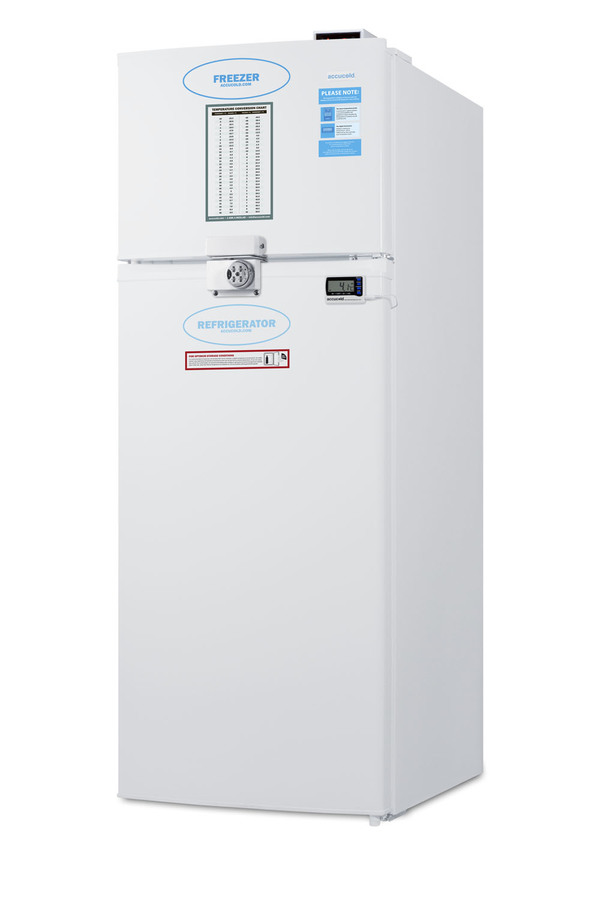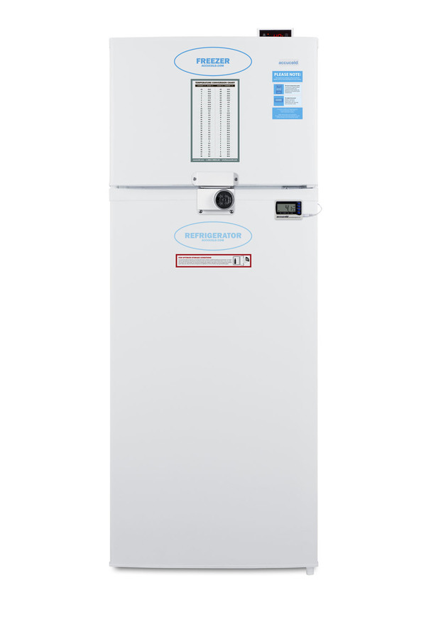 Accucold's general purpose refrigeration series offers cold storage solutions to meet a variety of facility needs. The AGP96RFLCAL is a two-door refrigerator-freezer in a slim 22 inch footprint, ideal for offices and institutions with limited floor space. A factory-installed lock secures both sections with a user-set combination, with two keys included to override the combination if needed. The lower refrigerator compartment is designed to operate between 2 and 8ºC, with a digital thermostat that allows you to control the temperature without opening the door. We include an alarm/thermometer that users can easily install to monitor the refrigerator temperature. This temperature monitoring device is calibrated to NIST standards in our ISO/IEC 17025:2017 accredited calibration laboratory and ships with a 2-year certificate for your records. The thermometer displays the current and high/low temperatures to the nearest tenth of a degree in a readout switchable from Celsius to Fahrenheit. The temperature probe is encased in a glycol-filled bottle to help simulate the temperature of stored materials, rather than the refrigerator air temperature. An audible alarm warns if the unit has gone out of the recommended range. Inside the refrigerator section, the AGP96RFLCAL features fan-forced cooling to for even temperature distribution, with adjustable wire shelves to help promote proper circulation. Door racks are included to hold non-temperature sensitive items. The refrigerator utilizes automatic defrost to reduce user maintenance, while the upper freezer compartment comes with a static manual defrost system. The freezer also includes a removable wire shelf. It is best suited for storing ice packs and other items without strict temperature requirements. (NOTE: the freezer temperature is based off the refrigerator setting and cannot be adjusted independently.) Additional features include a user-reversible door swing, sealed back for easier cleaning, and interior refrigerator light. With its slim fit and user-friendly design, the AGP96RFLCAL is a smart solution for facilities seeking an upgraded general purpose refrigerator-freezer. For more advanced temperature uniformity, explore Accucold's purpose built series, including stacked refrigerator-freezer combinations with independent cooling systems. *NOTE: This unit's thermostat is pre-set for Celsius. If you prefer Fahrenheit, add complimentary option DTMEDF or let your sales representative know upon order. NOTE: This product is intended for a wide variety of basic storage applications. Storage of high-value vaccines, life science materials, and medical/clinical biologicals require a product offering tighter temperature control and/or alarms, monitoring, and backup. For more information, browse Accucold's purpose-built line or contact our product specialists at 1-888-4-MED-LAB.