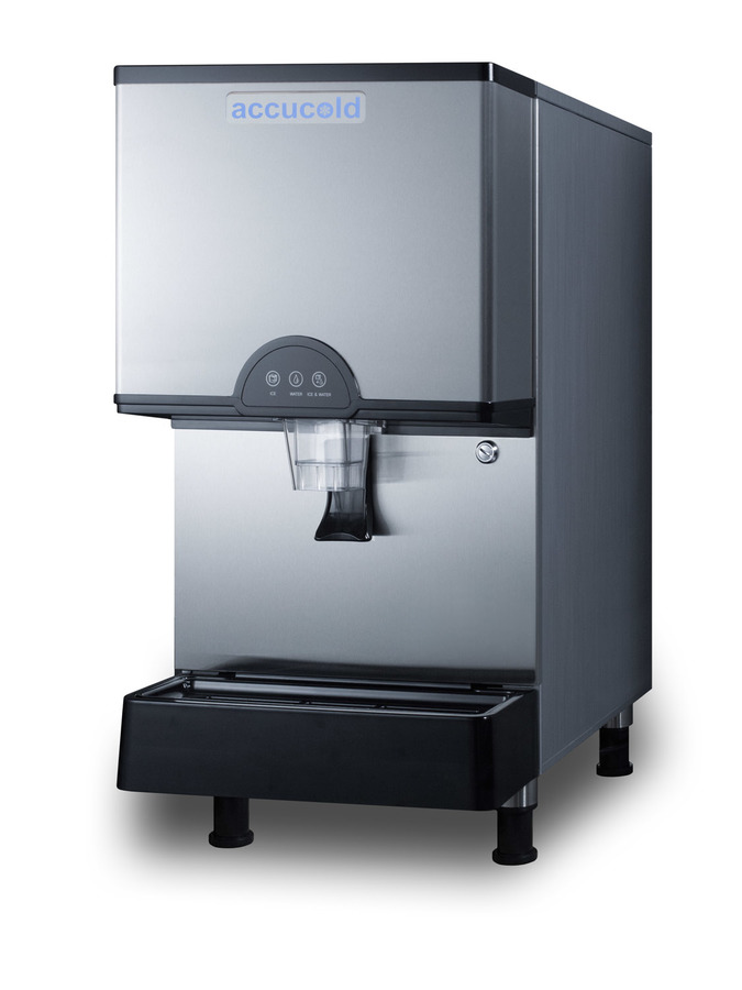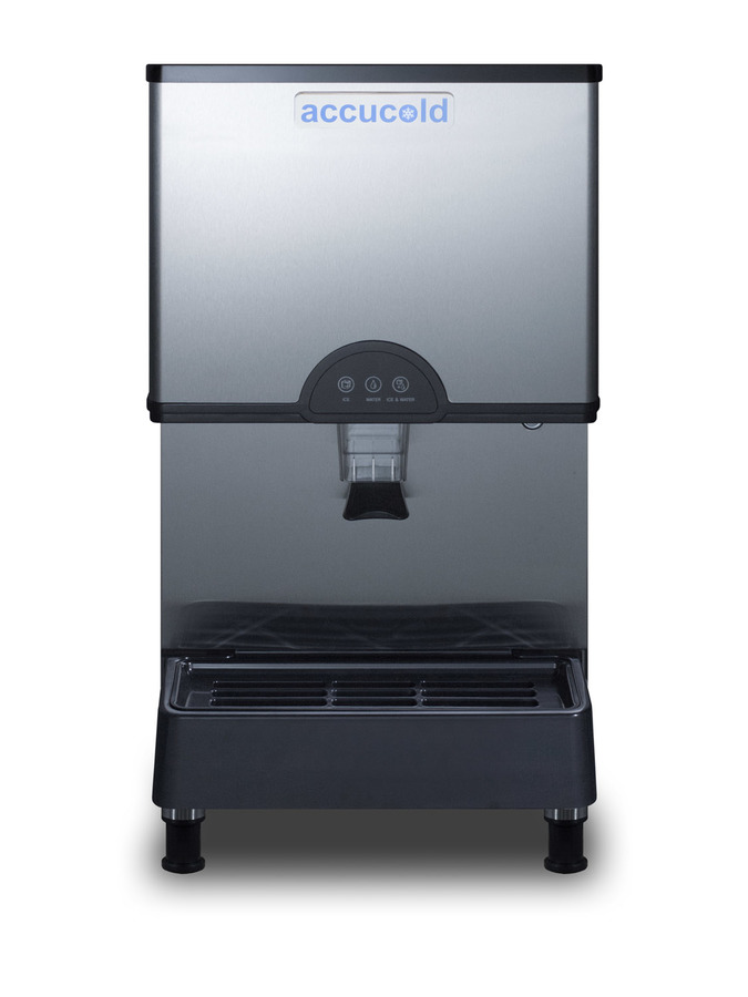 Experience the ultimate in convenience with the commercially approved Accucold countertop water and ice dispenser. The AIWD282FLTR is ETL-S listed to NSF-12 commercial standards. Measuring 18 3/4 inches from the front leg to the unit rear makes this a perfect fit on standard counters. This unit can produce up to 282 pounds of ice per day. Three dispenser functions - ice, water, or ice+water - provide expanded functionality, while the illuminated display ensures easy access and control of the unit. Adjustable legs offer flexible height options, while the stainless steel front provides a professional look. The removable tray and sealed back make for easy cleaning. This unit comes equipped with UV lighting in the dispenser. The AIWD282FLTR must be used with a drain and should be placed in a space that allows for draining below the unit. It is top vented. With its countertop footprint and large production output, the AIWD282FLTR is the perfect unit for hospital waiting areas, break rooms, or similar settings looking for a water and ice dispenser that is attractive and efficient. This unit ships with a filter kit.