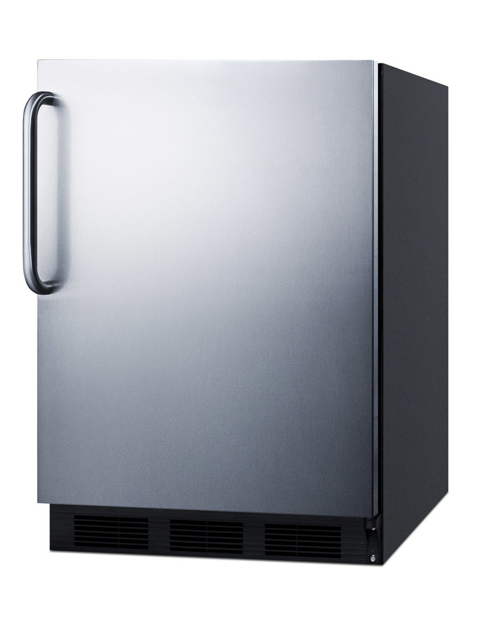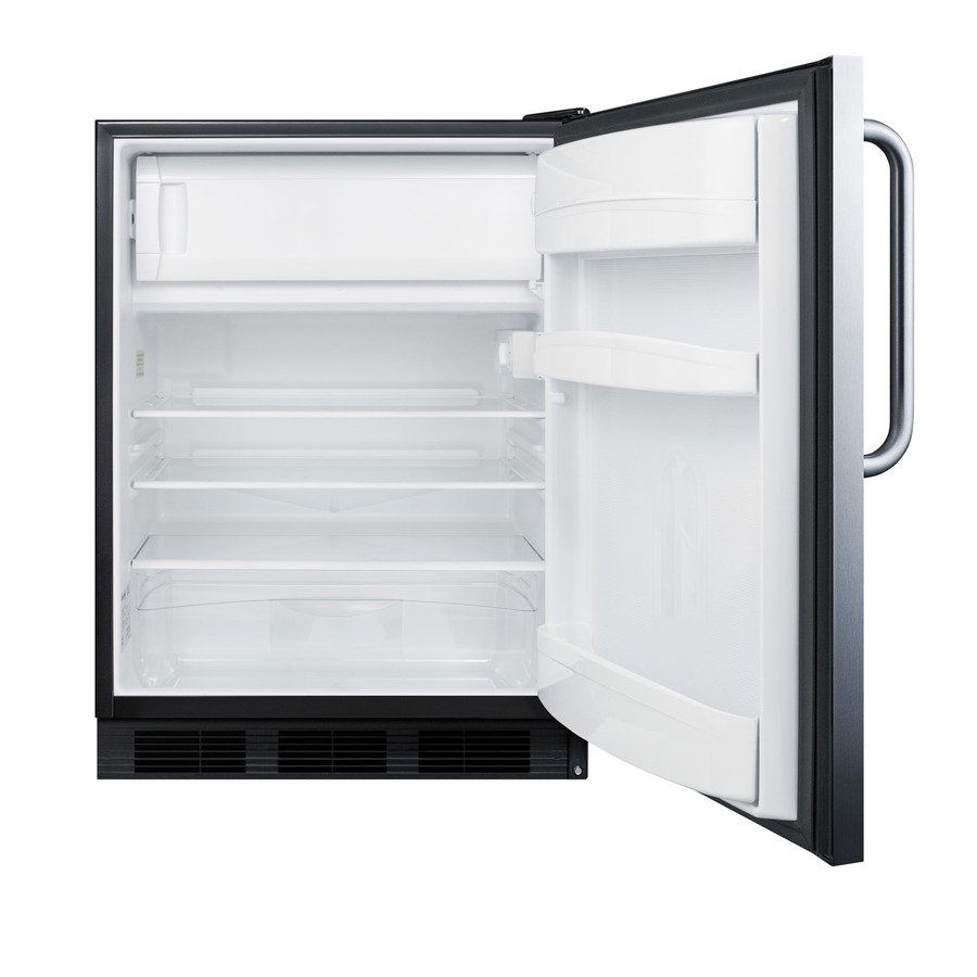 Accucold by Summit Appliance offers a wide range of undercounter refrigeration for general purpose storage. The AL650BI Series includes refrigerator-freezers designed for optimum storage conditions in built-in applications under lower ADA compliant counters. At 32" high, the AL652BKBISSTB can be used built-in or freestanding in ADA compliant settings. The 24" footprint fits many popular cutouts while offering over 5 cu.ft. of storage capacity. This model has a black cabinet and stainless steel wrapped door. A curved towel bar handle completes the professional look. Inside, our unique dual evaporator system separately cools the refrigerator and freezer sections to ensure proper storage temperature. Cycle defrost operation reduces user maintenance in the automatic defrost fresh food section, with static manual defrost operation in the freezer compartment. Door storage provides easy access for tall bottles and small condiments. Additional features include adjustable glass shelves, a clear crisper, and automatic interior lighting. The AL652BKBISSTB has long proven itself to have one of the best temperature performance records in the industry. To see additional finish options on this unit, browse the full AL650BI Series. NOTE: This unit is designed for general purpose, medical, or commercial applications and does not meet DOE energy standards for residential use.