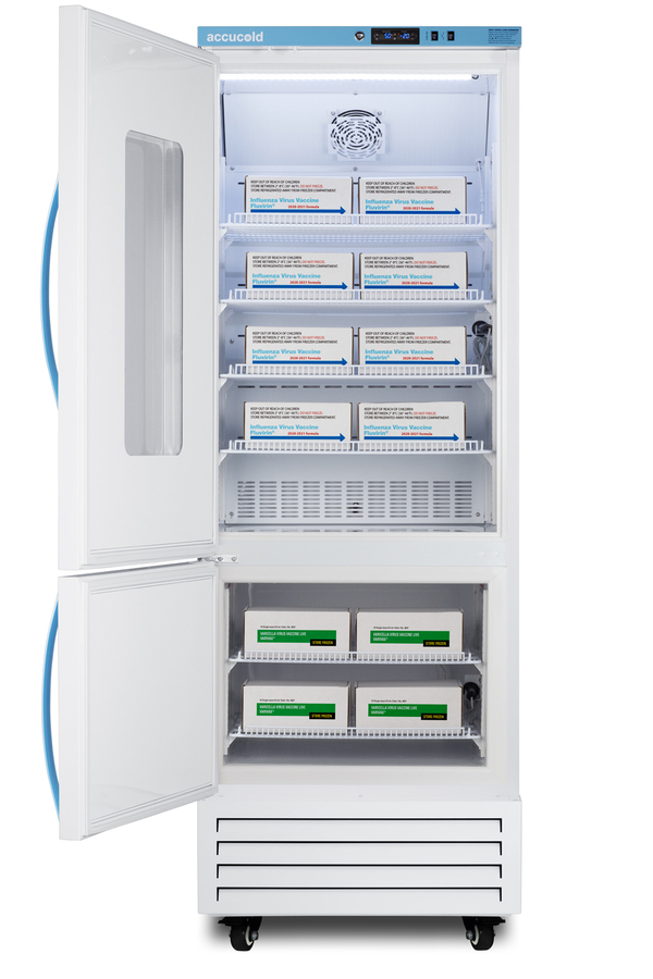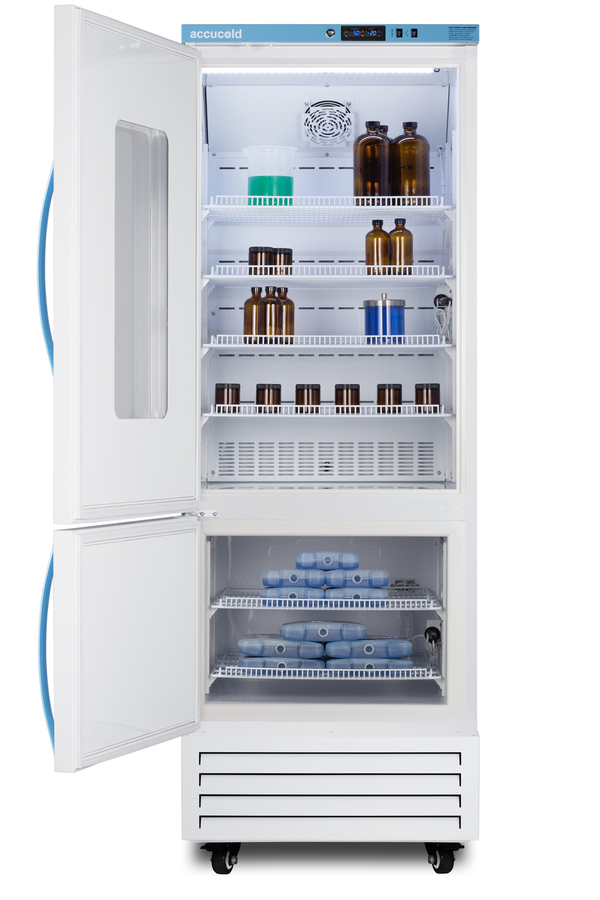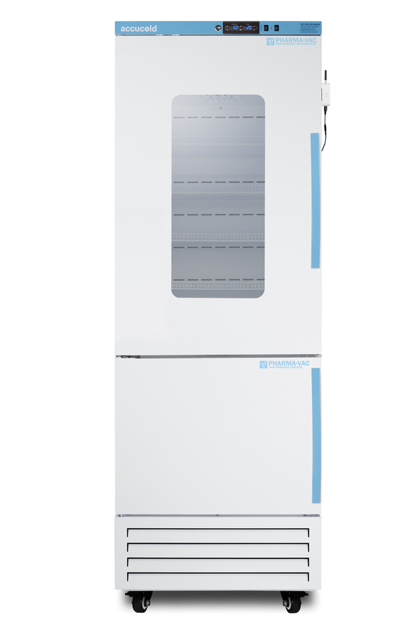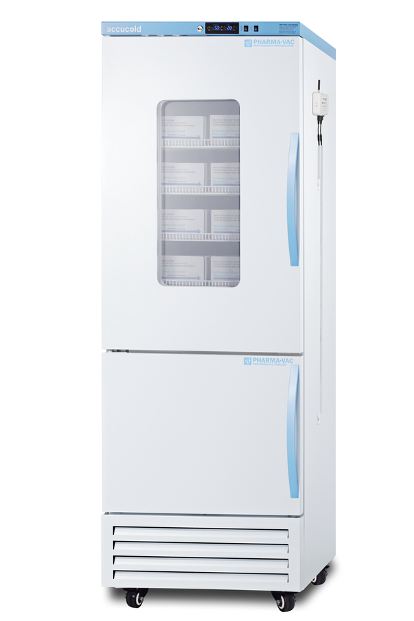 Accucold offers innovative solutions to vaccine and life science storage with the Performance Series dual compressor combination refrigerator-freezers. These units are purpose-built to ensure a stable temperature performance in hospitals, pharmacies, laboratories, and other facilities. Sized just under 28" wide, the ARFG18PVDLPWLHD features an upper refrigerator compartment with a small window and independent manual defrost freezer below. Both sections include adjustable plastic-coated wire shelves that can be positioned at 1/2" increments to accommodate virtually any sized item. This unit includes LED internal lighting with an on/off rocker switch. The interior is constructed from white powder coated metal to ensure added durability and better temperature retention. The Pharma-Vac Performance Series is designed to meet the demanding needs of vaccine and life science storage. The ARFG18PVDLPWLHD features a dual microprocessor temperature controller (refrigerator range: +2 to +8ºC; freezer range: -30 to -10ºC). The buffered temperature probes are encased in glycol-filled bottles to better simulate temperature of the stored product, with an additional sensor that reads air temperature to ensure superior temperature control. The current and min/max temperature display is viewable in Celsius or Fahrenheit to the nearest tenth of a degree. The audible and visual temperature alarms sound if the interiors go out of range. Additional alarms include a power failure alert, door open alarm, and sensor failure alert system. Both sections are equipped with remote alarm contacts in the rear and a 1/2" probe port on the right side to accept additional monitoring devices. The factory-installed antimicrobial handles are powder-coated with naturally occurring silver ions, which help to reduce the spread of germs, allowing for a safer, cleaner user experience. A hospital grade cord with 'green dot' plug is also included for added safety in high traffic areas. Inside, the upper refrigerator compartment utilizes adjustable cycle defrost operation to avoid temperature spikes. Optimized forced air cooling with an internal fan ensures excellent temperature stability and uniformity with rapid recovery after door openings. The freezer utilizes static manual defrost cooling. Both compartments include front-mounted keyed locks and powerful magnetic gaskets to ensure a positive seal, with self-closing doors for added protection in high traffic settings. Pre-installed hospital grade casters offer easy mobility as needed, with the front two wheels lockable to keep the unit in place. This unit ships with a left-hand door swing. This unit ships with PharmaWatch DLPWRF, a wireless environmental temperature monitoring device (ETM) that enables cloud-based data management. The ETM comes with a refrigerator and freezer probe to record both compartment temperatures via the latest cellular technology. Reports are managed in the included web portal for your records. Temperature alert notifications can be sent via text, call, or email. The device can be mounted to the front or side of the unit. It includes a 2-year certificate of NIST calibration, A/C adapter with 10' long cord, and backup battery. Additional sizes and styles are available. Browse Accucold's website for more information, or contact our sales team at 718-893-3900 to discuss your equipment needs.